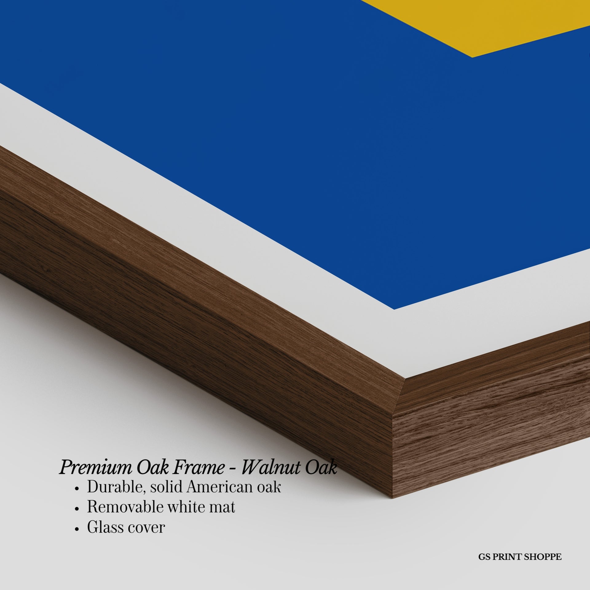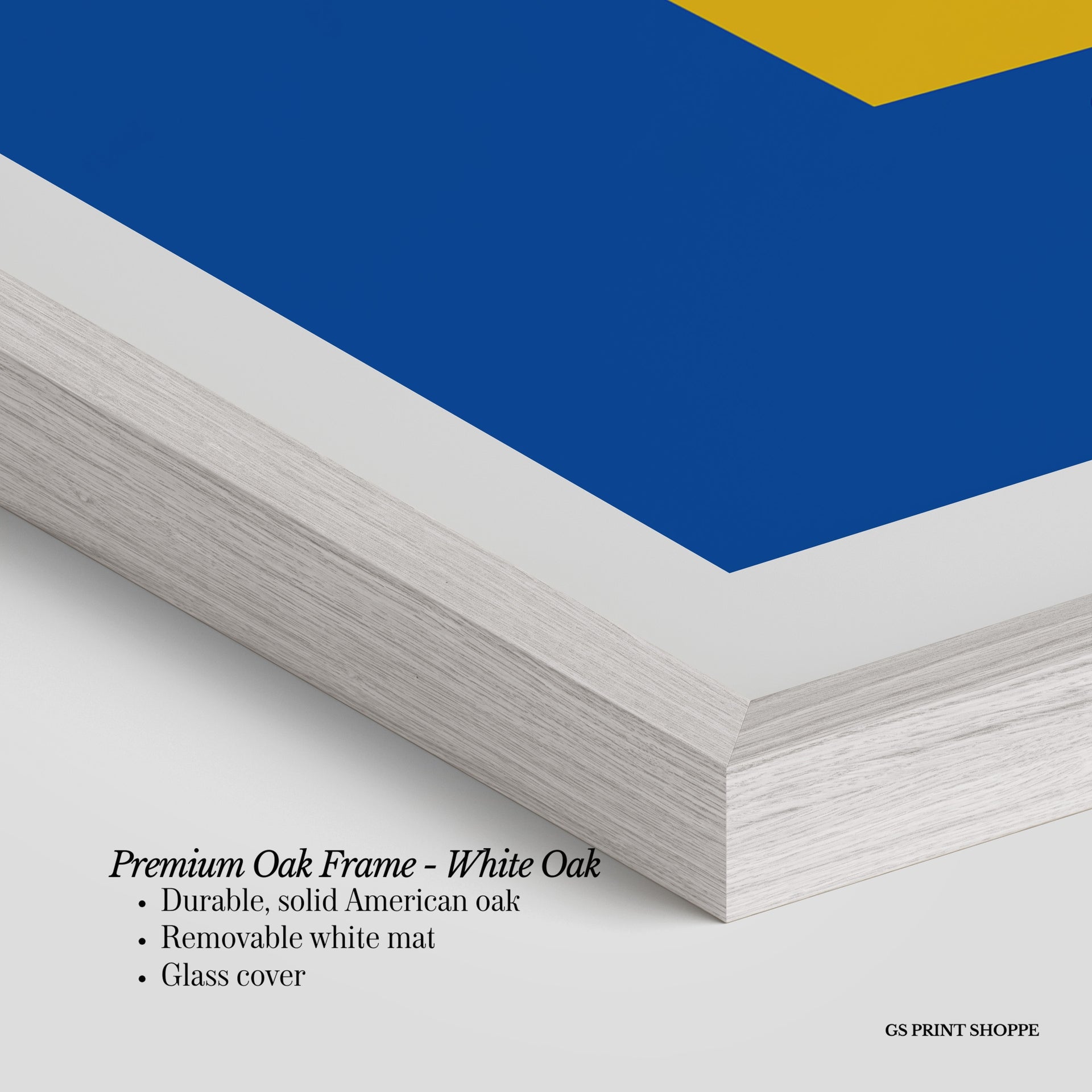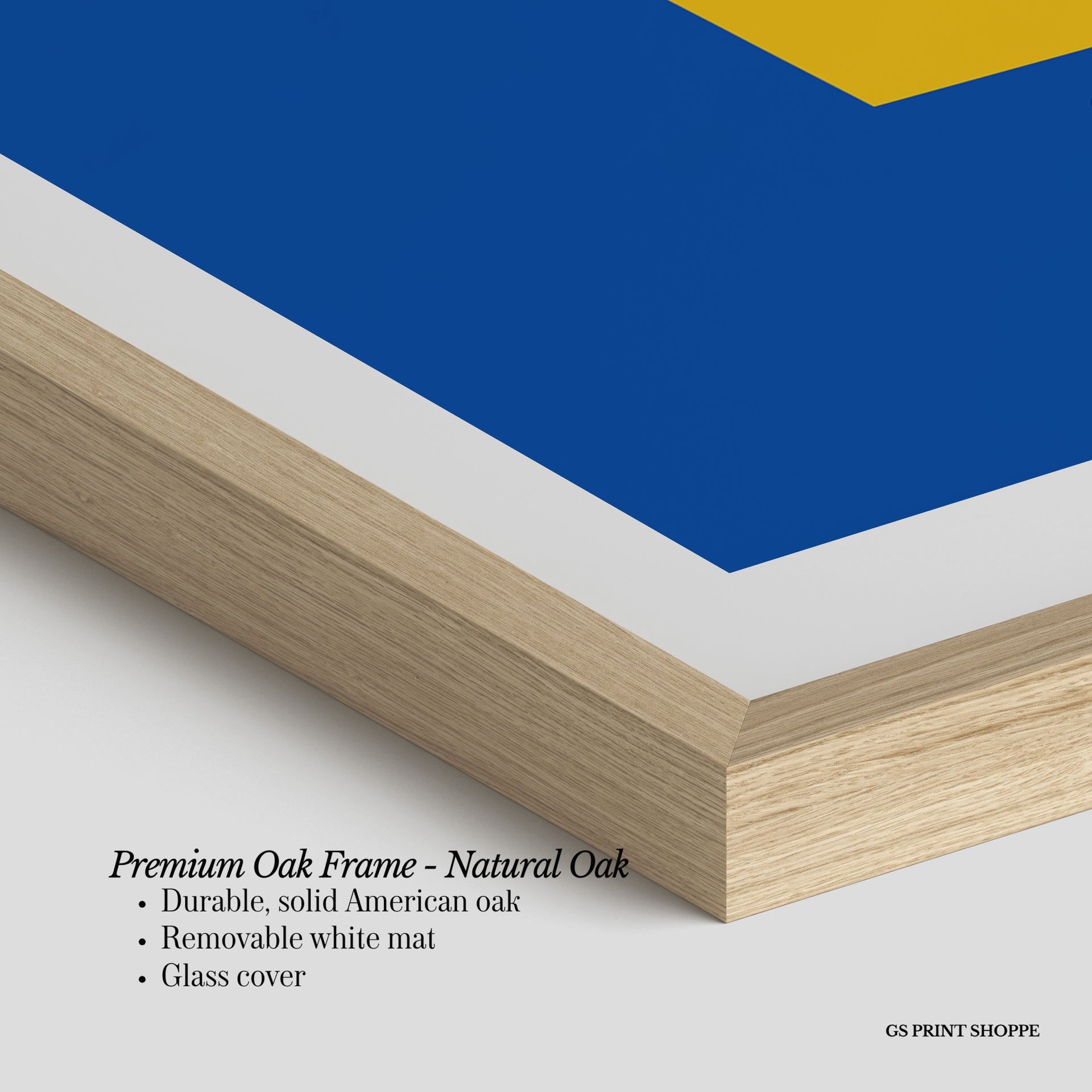 Premium Oak Frame: Our premium oak frame is crafted from solid American oak, offering a warm, natural feel with a high-end finish. We complete this elevated offering with a bright white removable mat and real glass for a versatile and polished look.