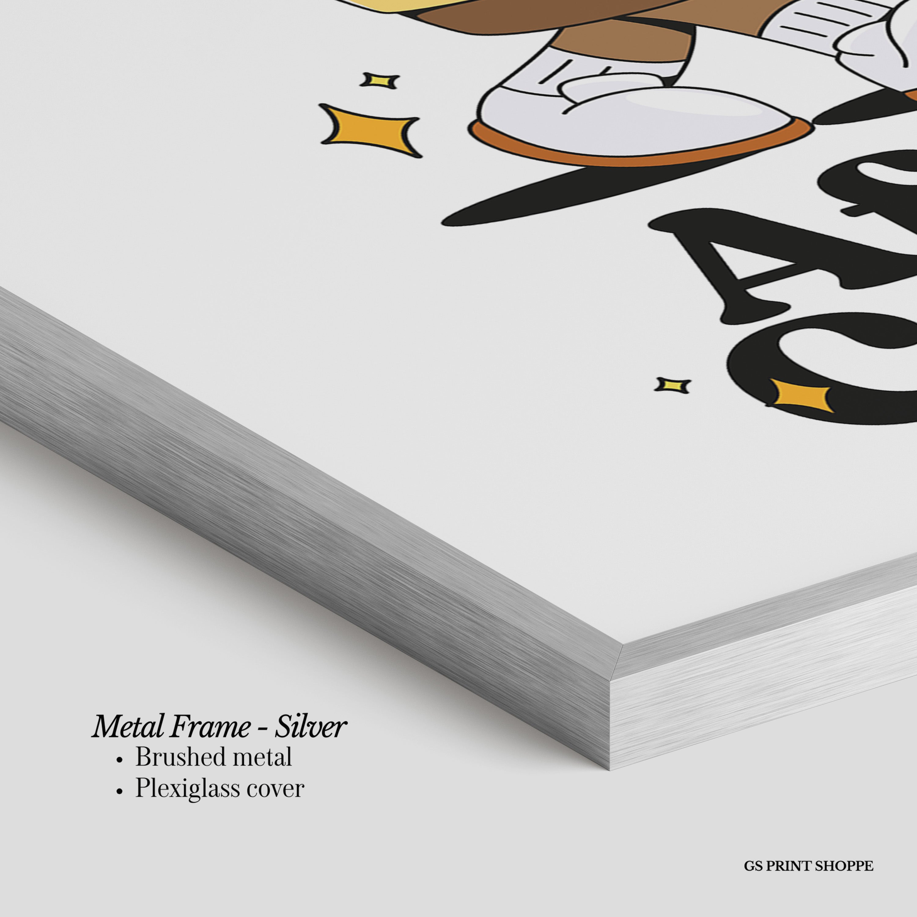 Metal Frame: Sleek and modern, our metal frame is crafted with brushed metal for a polished finish. It comes with durable plexiglass and sturdy metal hangers for horizontal or vertical display.