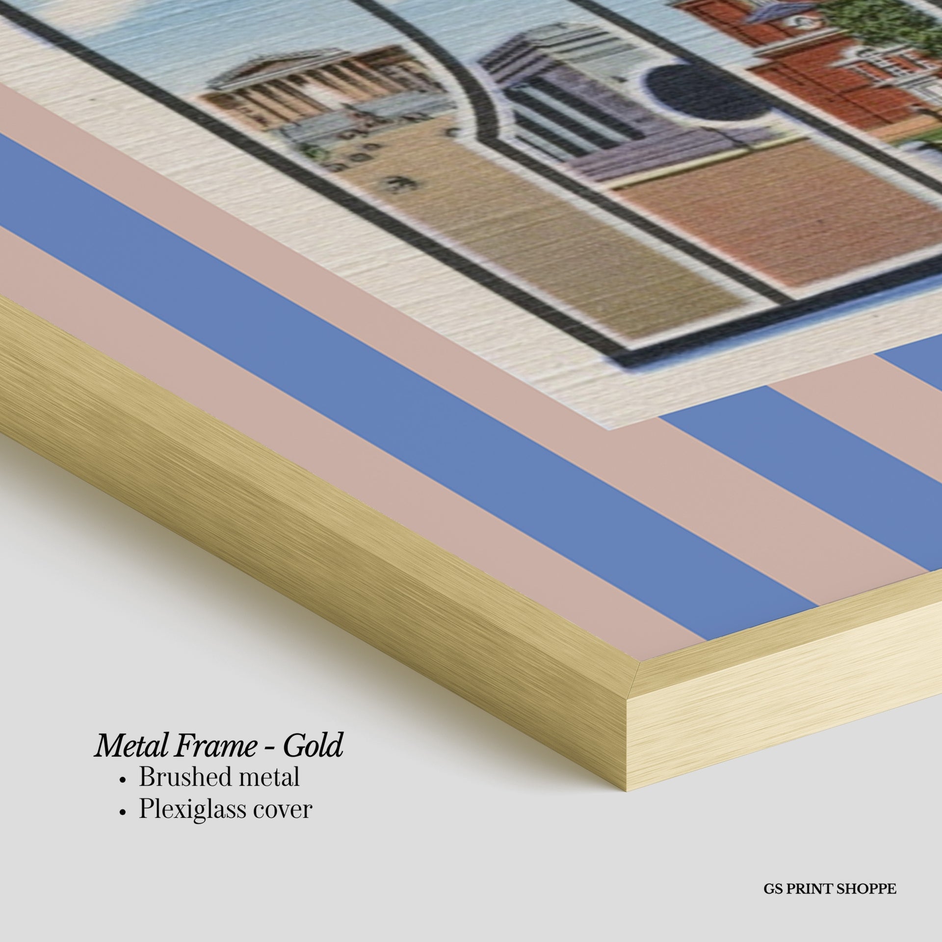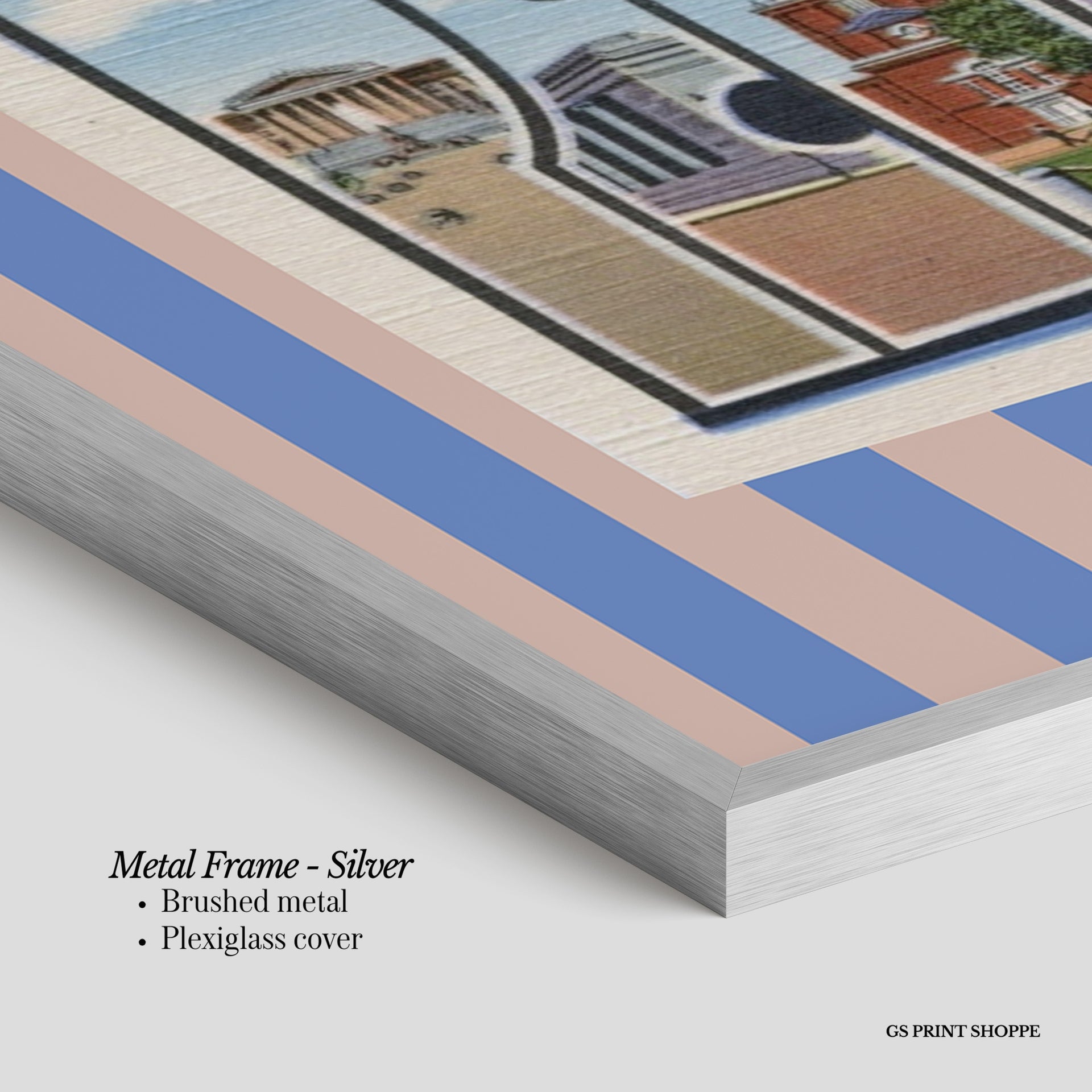 Metal Frame: Sleek and modern, our metal frame is crafted with brushed metal for a polished finish. It comes with durable plexiglass and sturdy metal hangers for horizontal or vertical display.