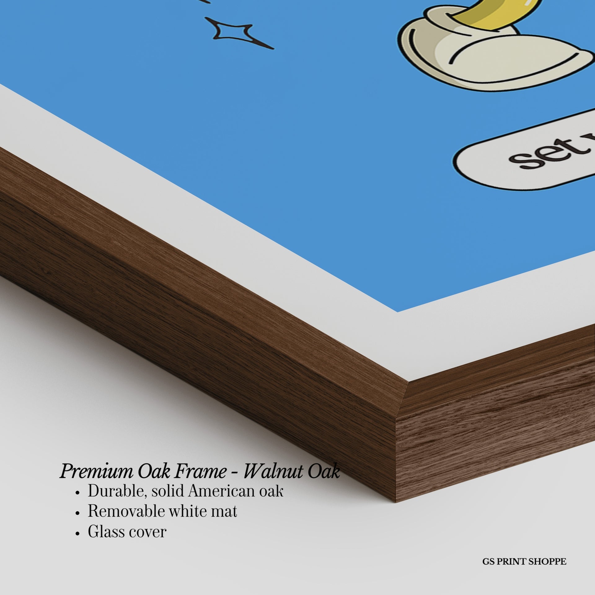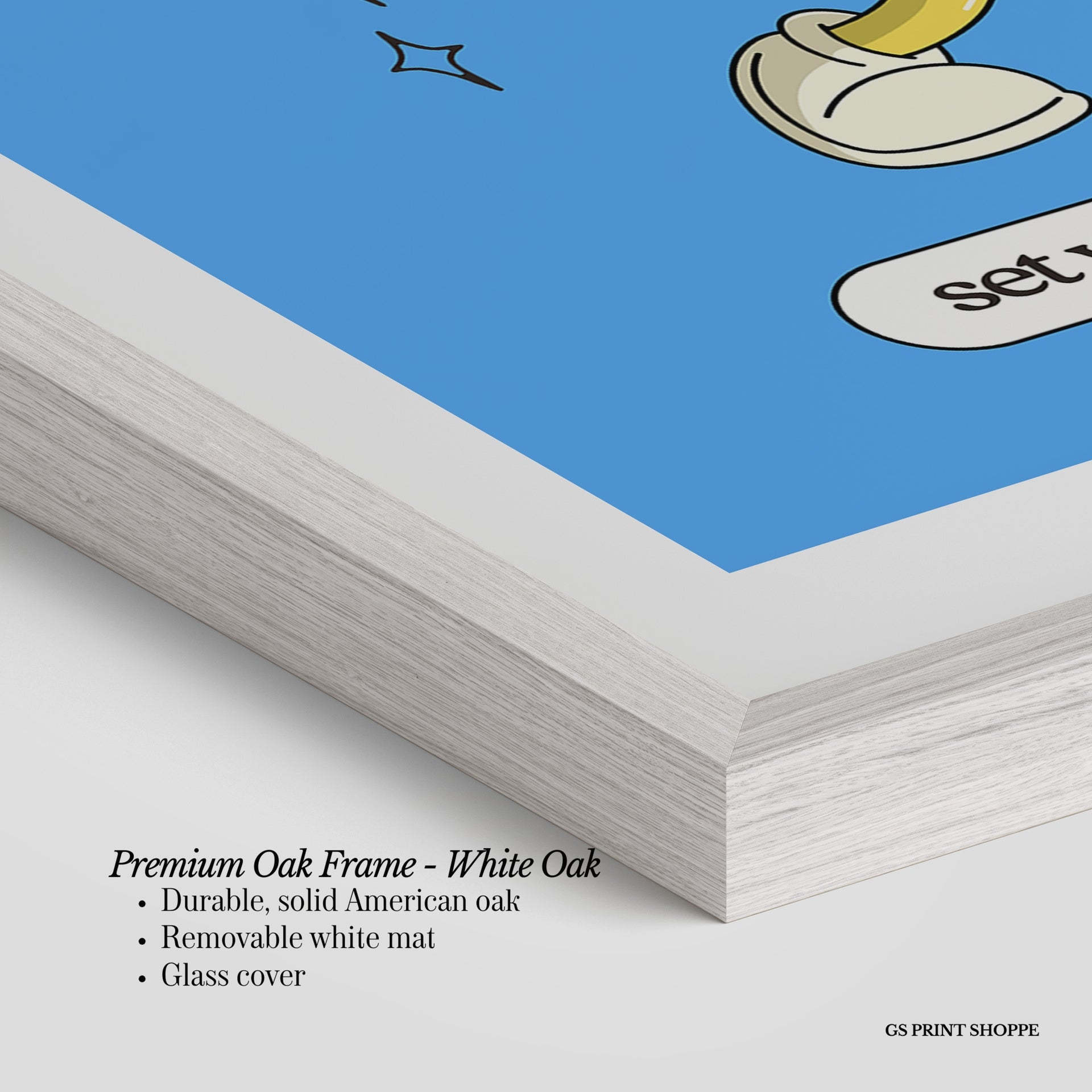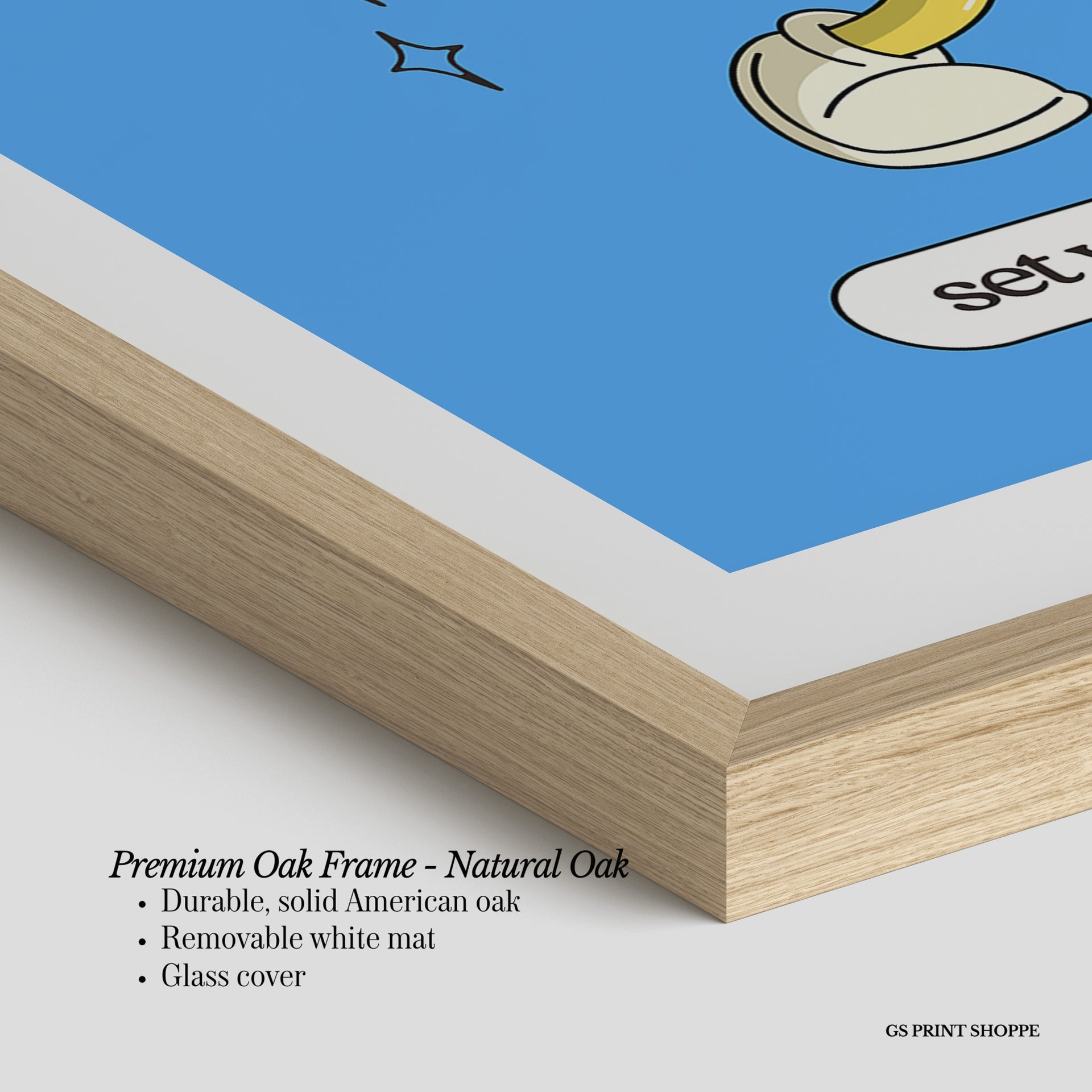 Premium Oak Frame: Our premium oak frame is crafted from solid American oak, offering a warm, natural feel with a high-end finish. We complete this elevated offering with a bright white removable mat and real glass for a versatile and polished look.