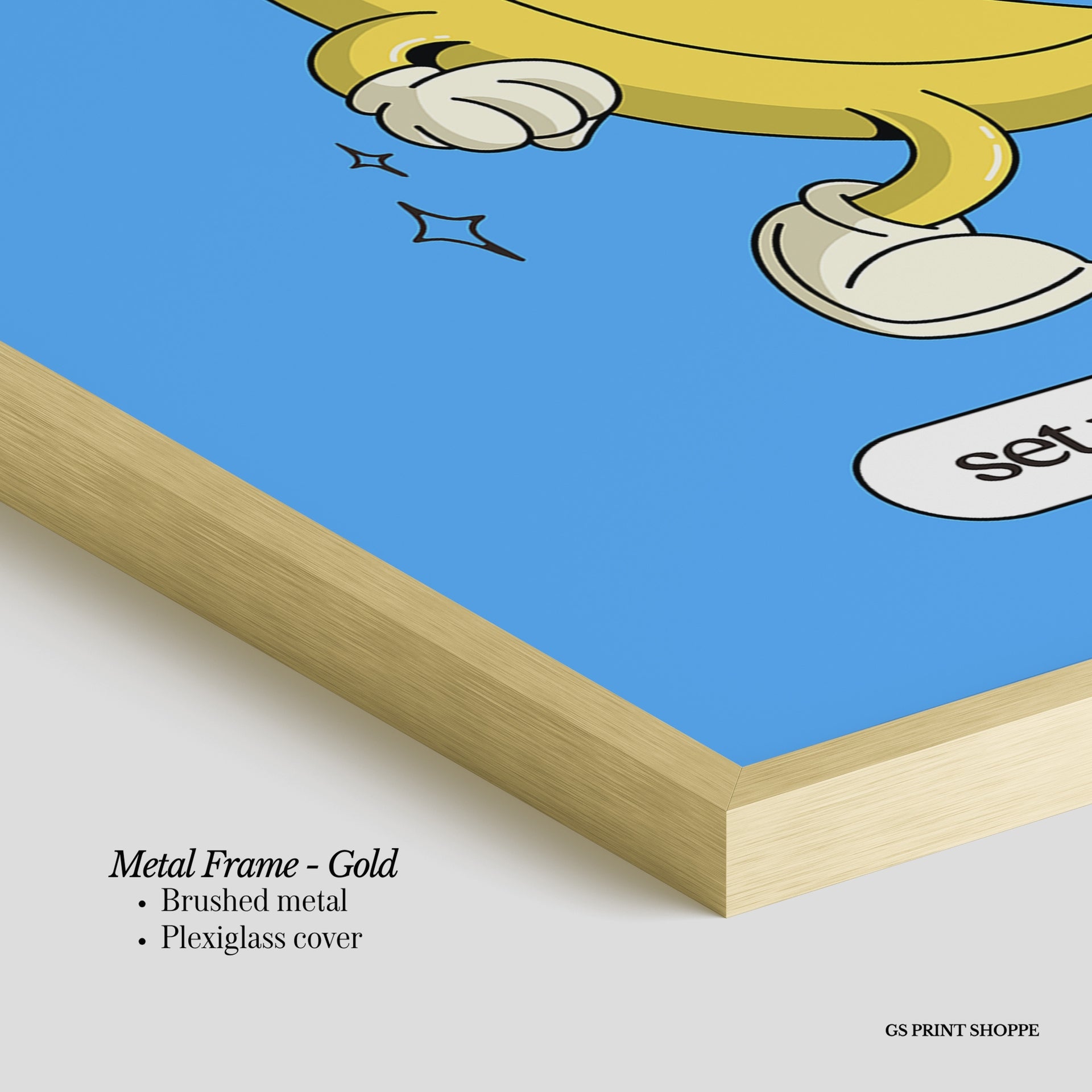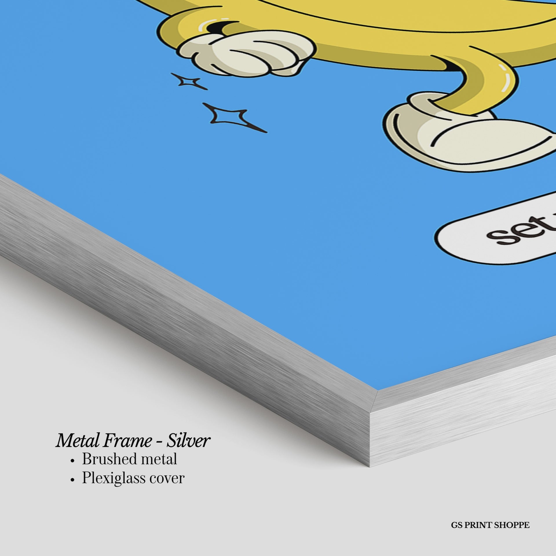 Metal Frame: Sleek and modern, our metal frame is crafted with brushed metal for a polished finish. It comes with durable plexiglass and sturdy metal hangers for horizontal or vertical display.