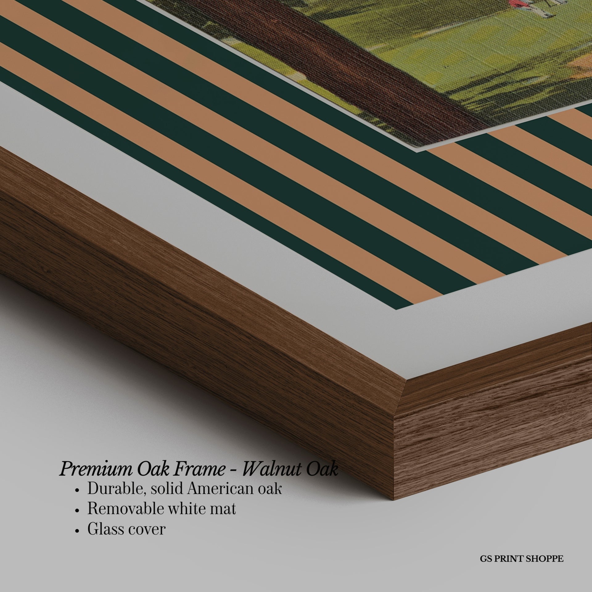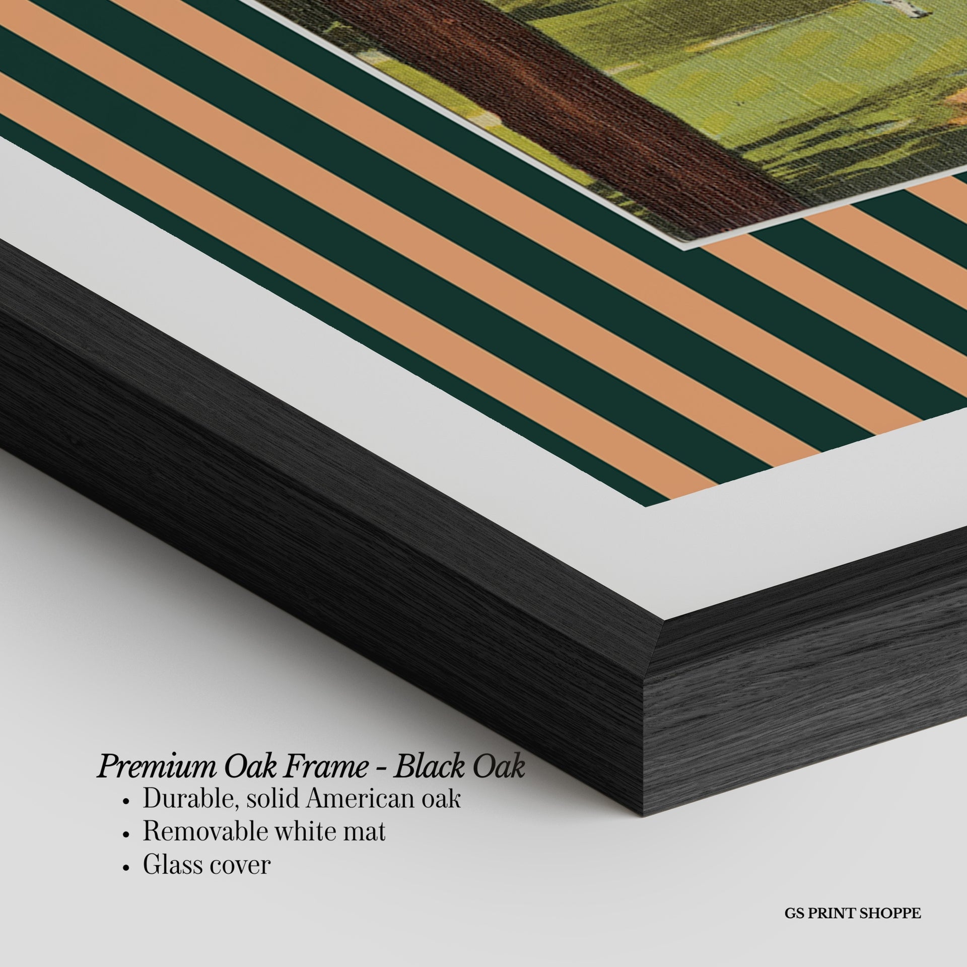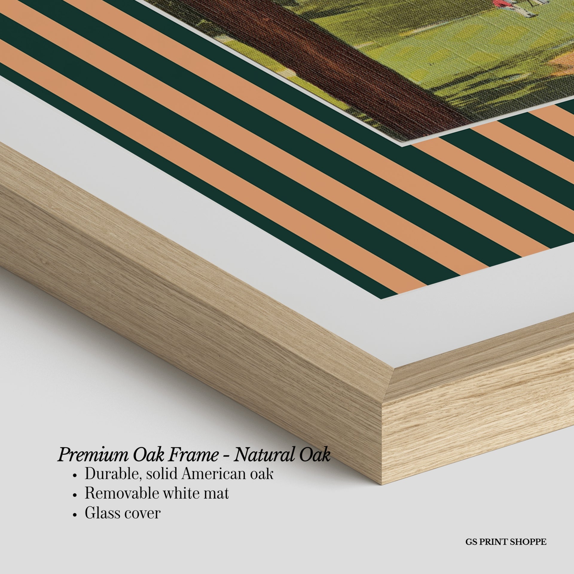 Premium Oak Frame: Our premium oak frame is crafted from solid American oak, offering a warm, natural feel with a high-end finish. We complete this elevated offering with a bright white removable mat and real glass for a versatile and polished look.
