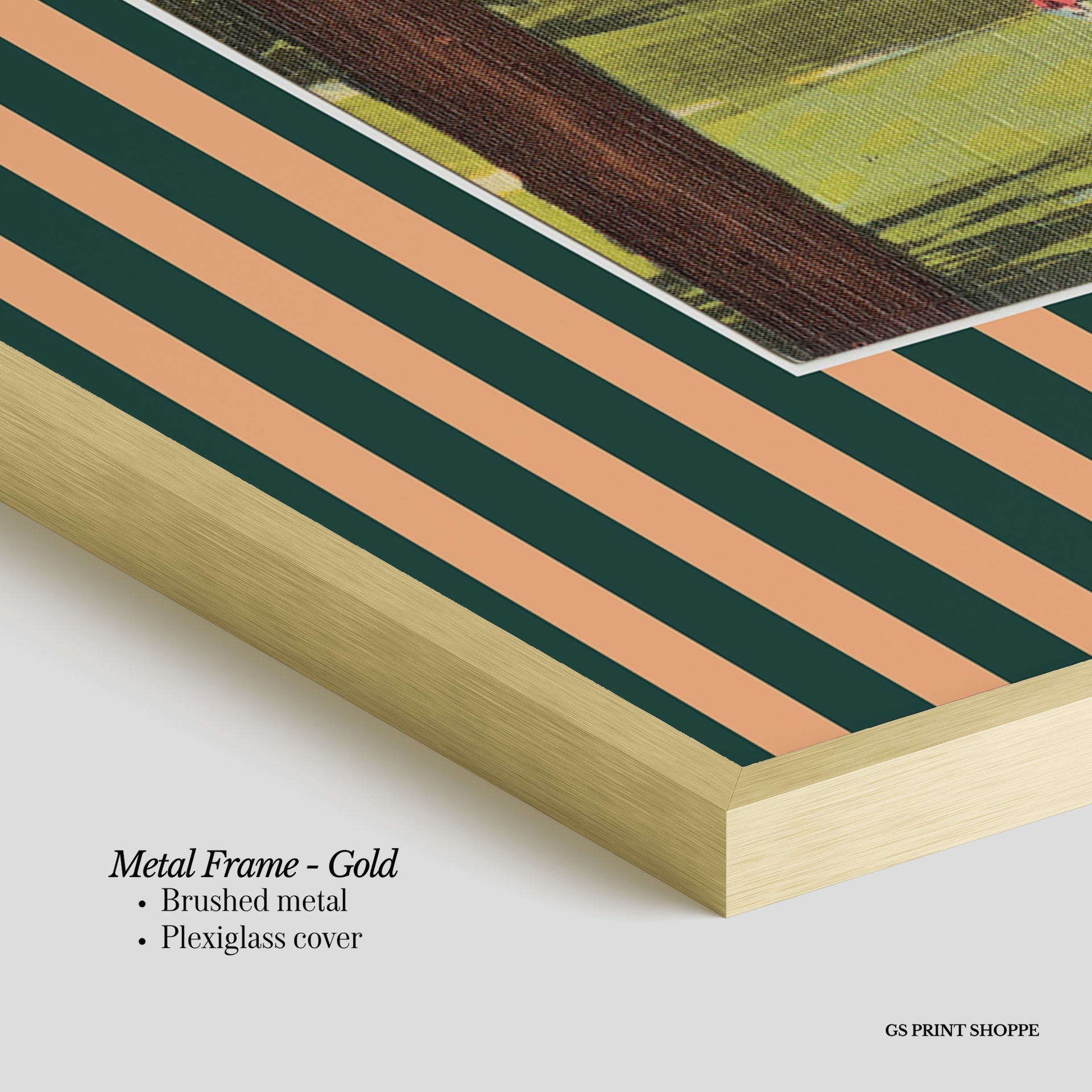 Metal Frame: Sleek and modern, our metal frame is crafted with brushed metal for a polished finish. It comes with durable plexiglass and sturdy metal hangers for horizontal or vertical display.