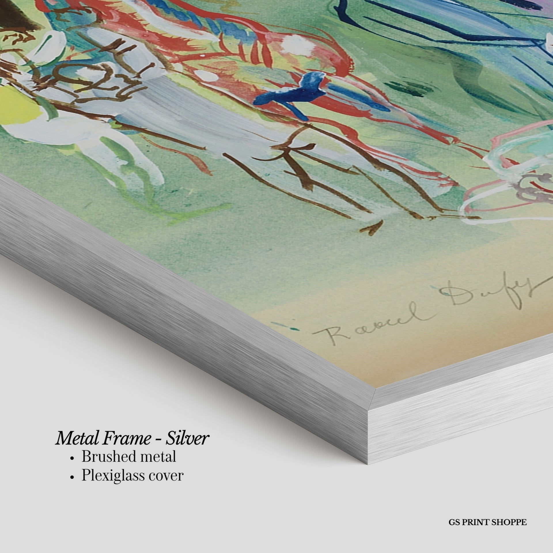 Metal Frame: Sleek and modern, our metal frame is crafted with brushed metal for a polished finish. It comes with durable plexiglass and sturdy metal hangers for horizontal or vertical display.