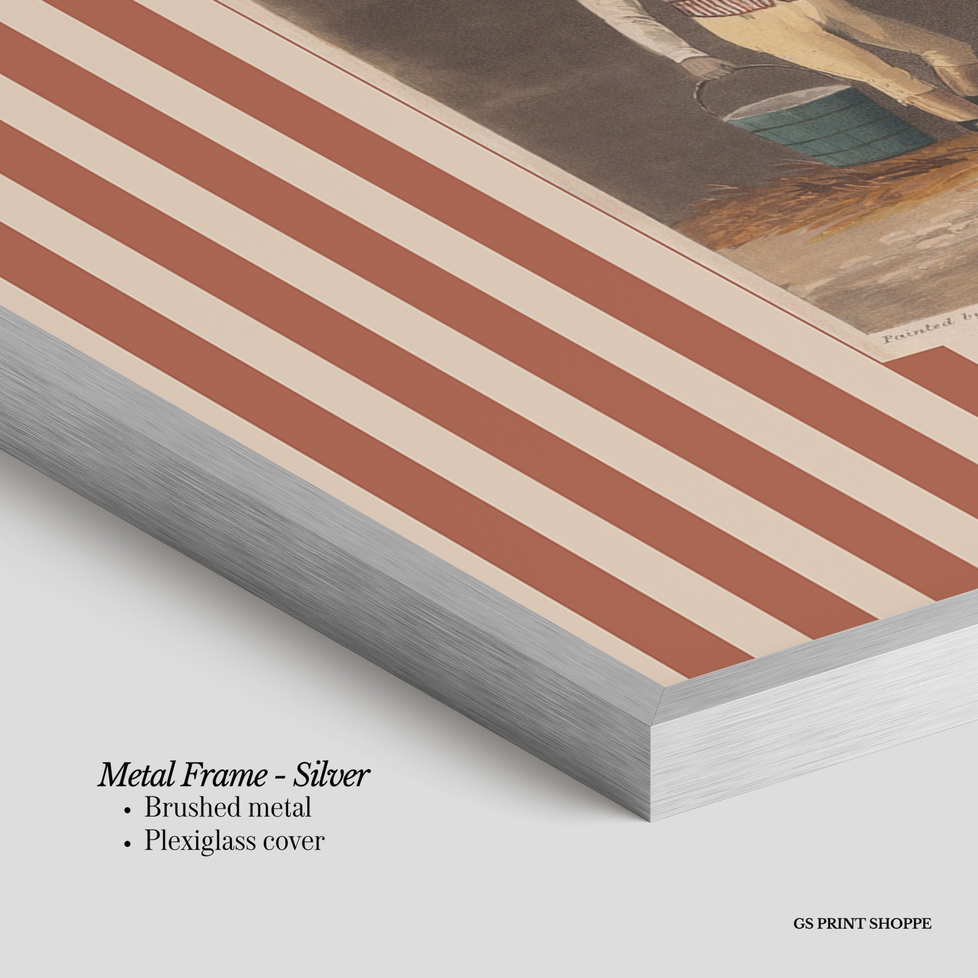 Metal Frame: Sleek and modern, our metal frame is crafted with brushed metal for a polished finish. It comes with durable plexiglass and sturdy metal hangers for horizontal or vertical display.