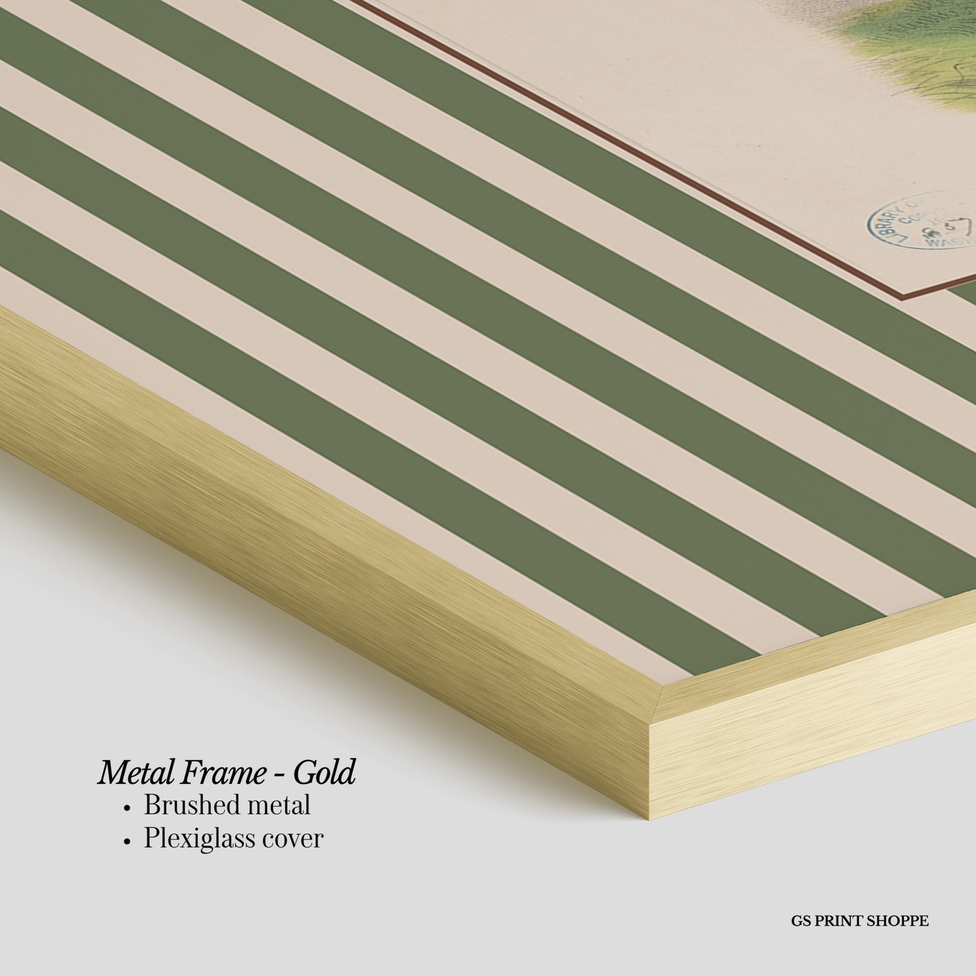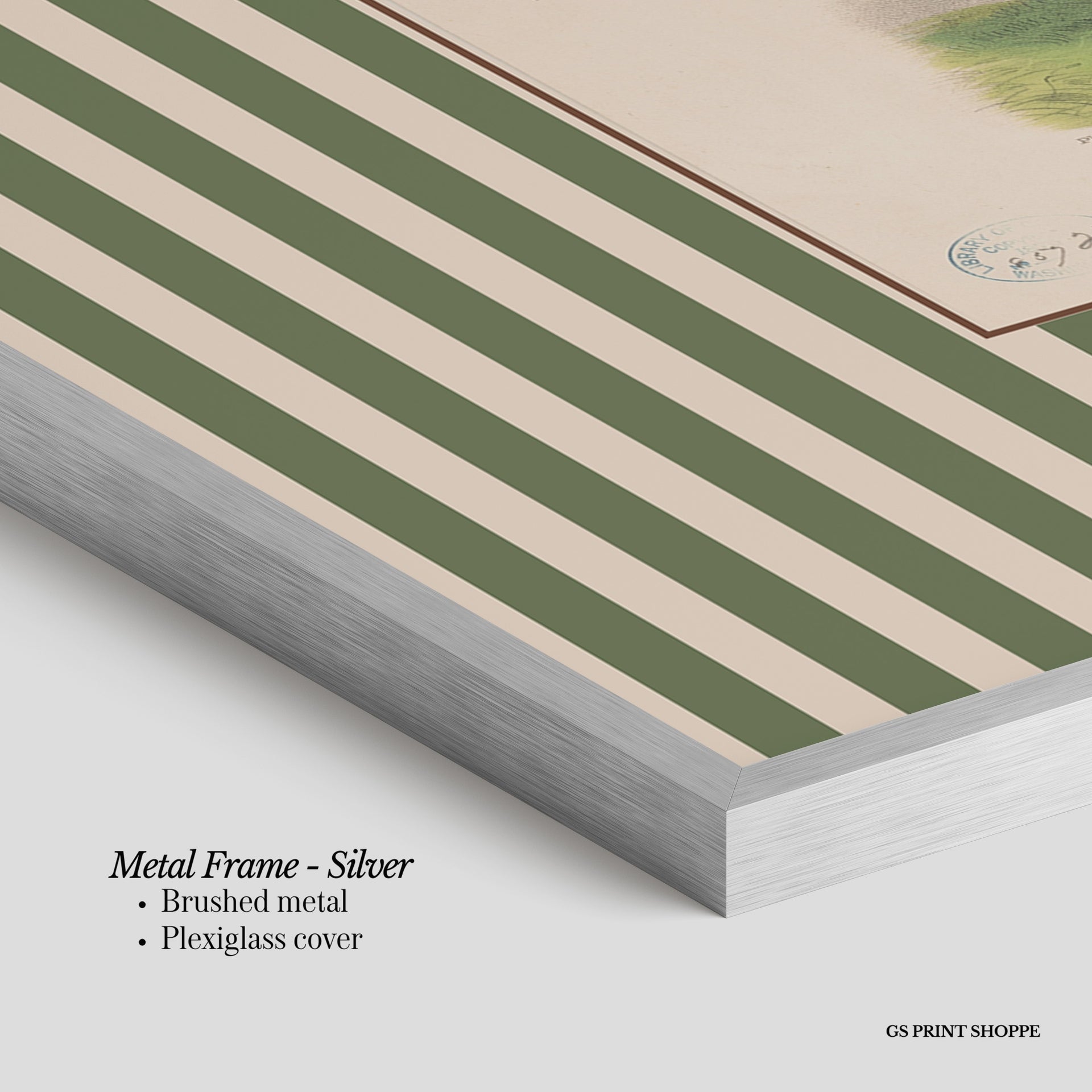Metal Frame: Sleek and modern, our metal frame is crafted with brushed metal for a polished finish. It comes with durable plexiglass and sturdy metal hangers for horizontal or vertical display.