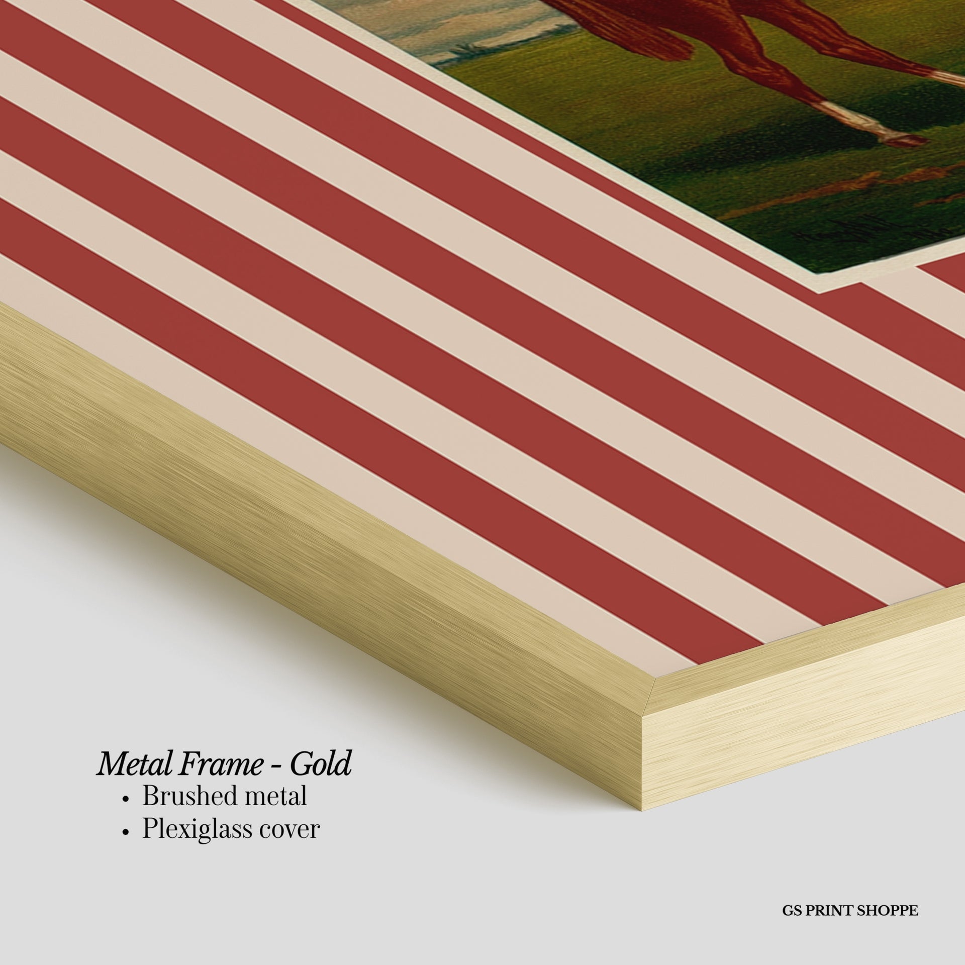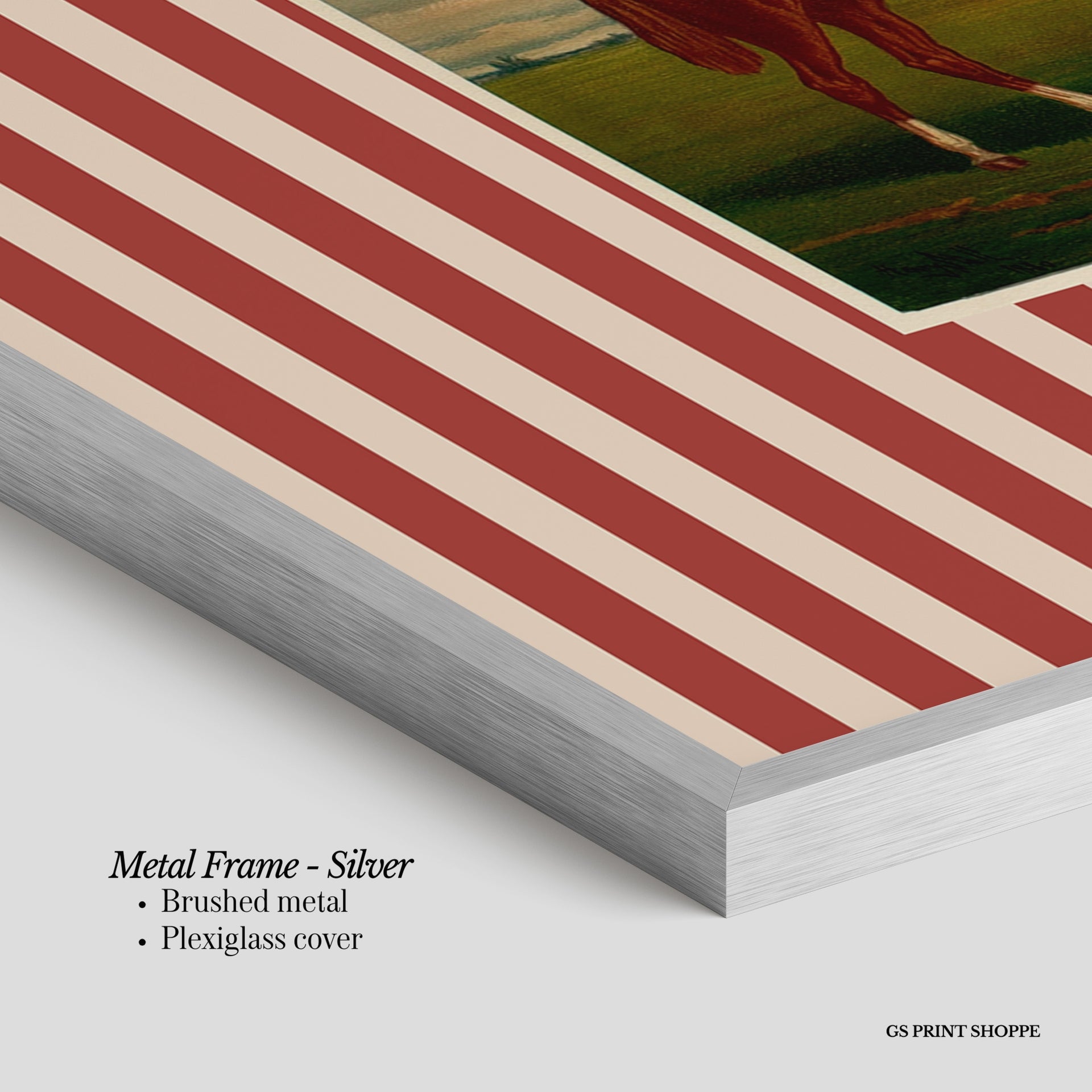 Metal Frame: Sleek and modern, our metal frame is crafted with brushed metal for a polished finish. It comes with durable plexiglass and sturdy metal hangers for horizontal or vertical display.