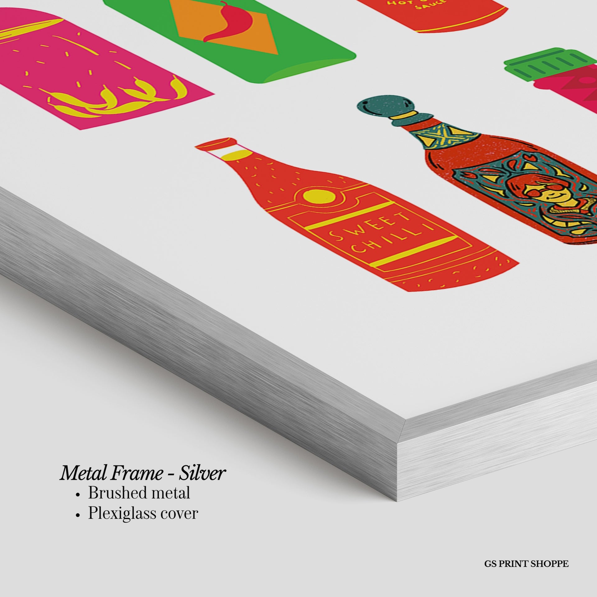 Metal Frame: Sleek and modern, our metal frame is crafted with brushed metal for a polished finish. It comes with durable plexiglass and sturdy metal hangers for horizontal or vertical display.
