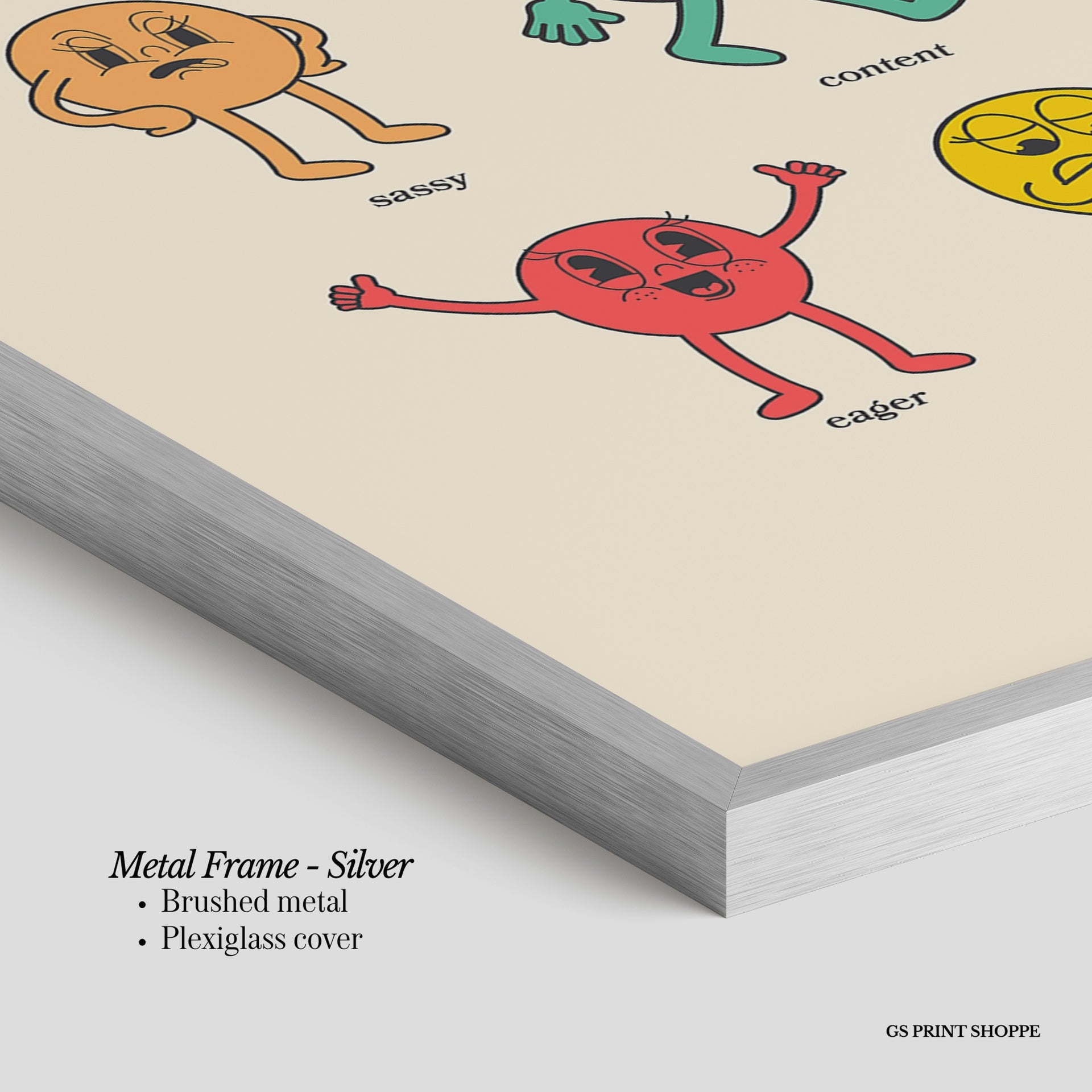 Metal Frame: Sleek and modern, our metal frame is crafted with brushed metal for a polished finish. It comes with durable plexiglass and sturdy metal hangers for horizontal or vertical display.