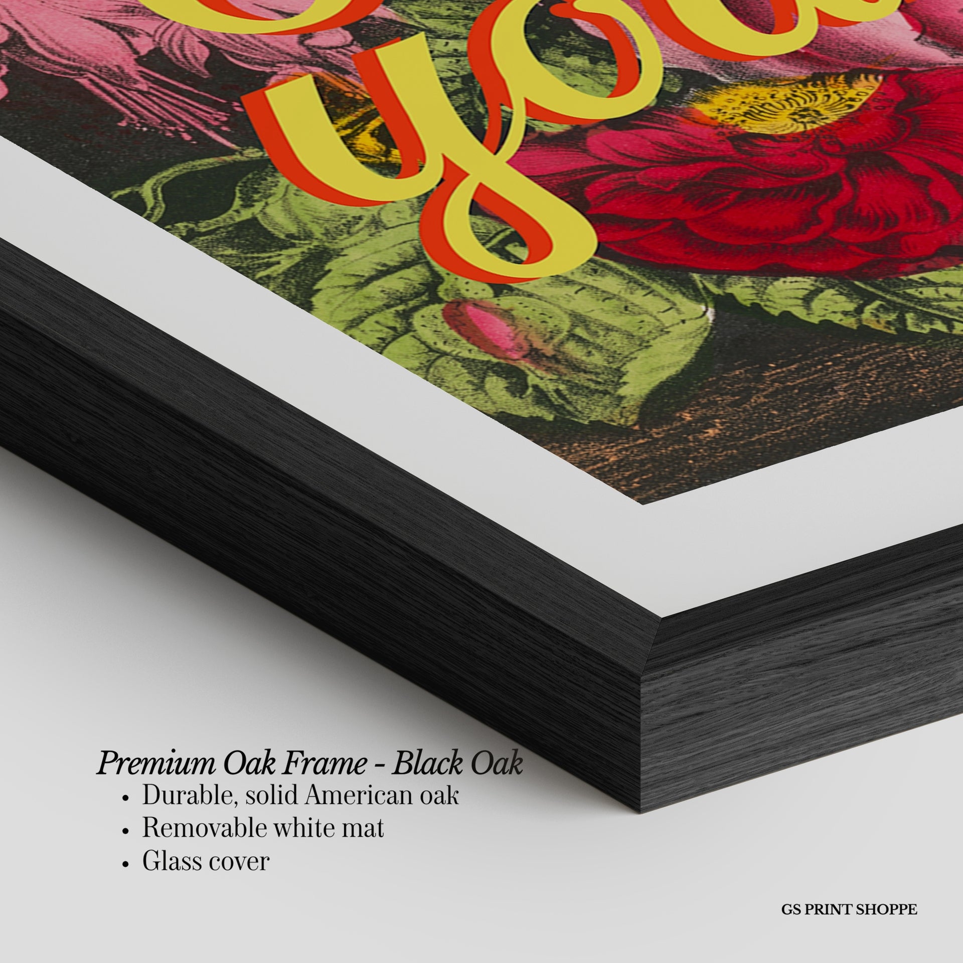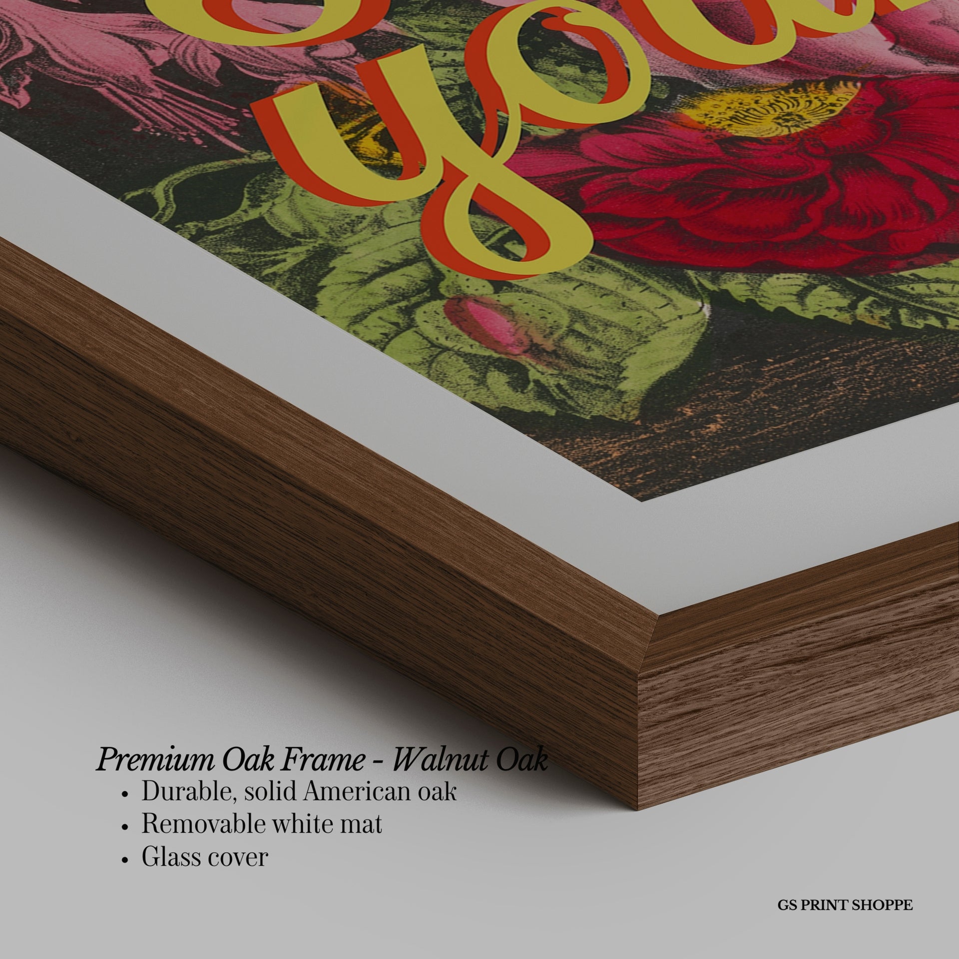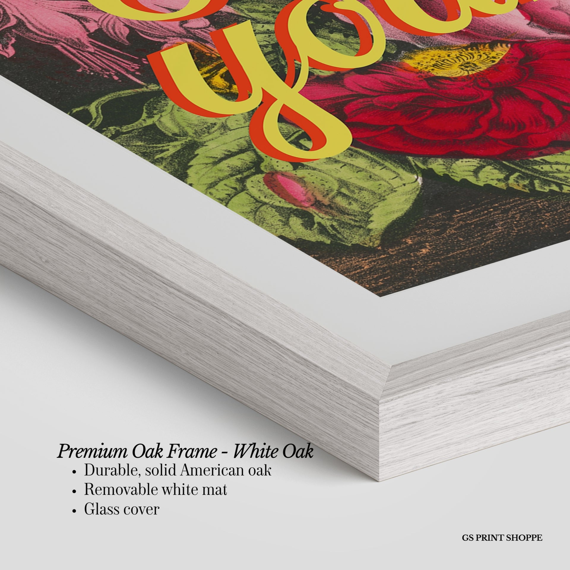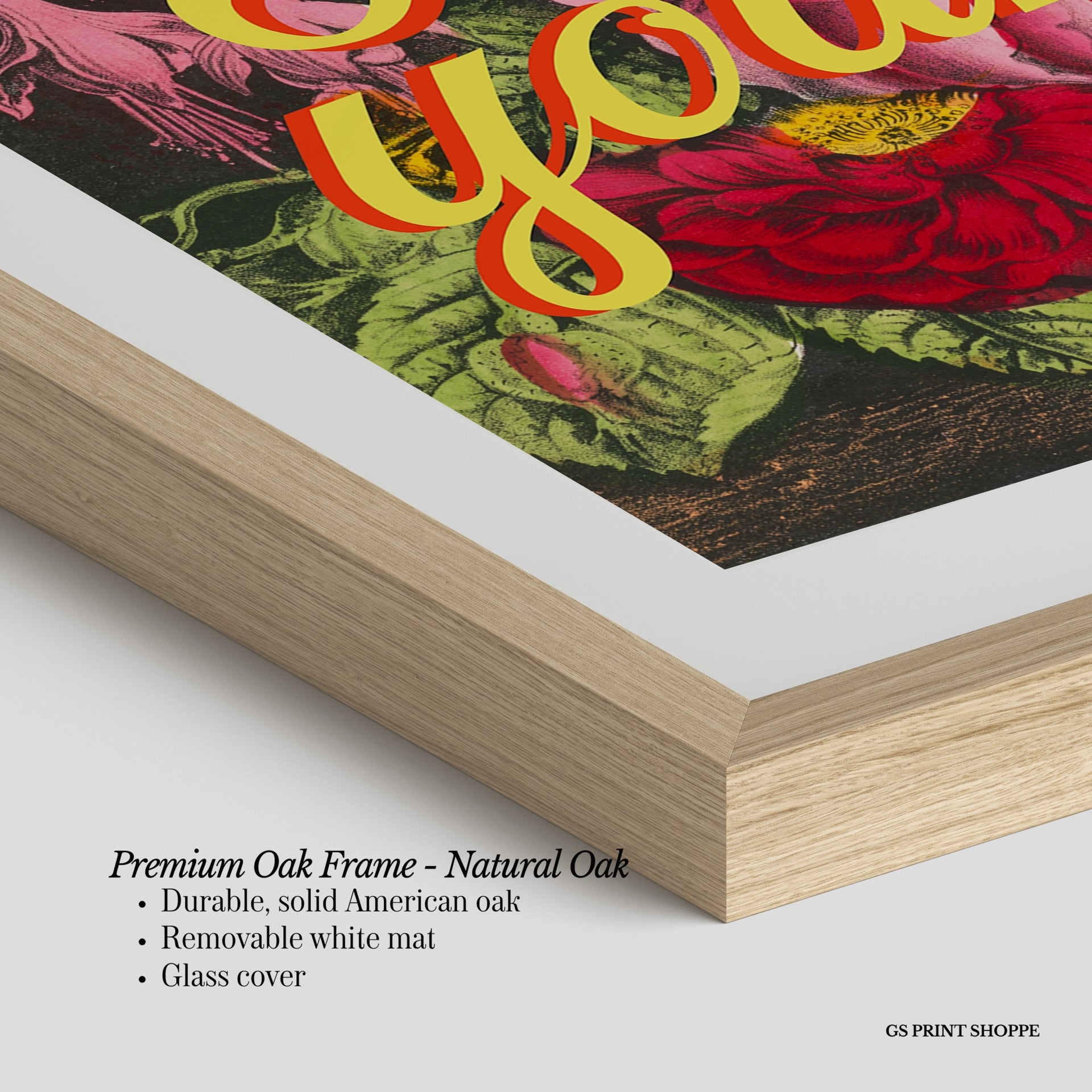 Premium Oak Frame: Our premium oak frame is crafted from solid American oak, offering a warm, natural feel with a high-end finish. We complete this elevated offering with a bright white removable mat and real glass for a versatile and polished look.