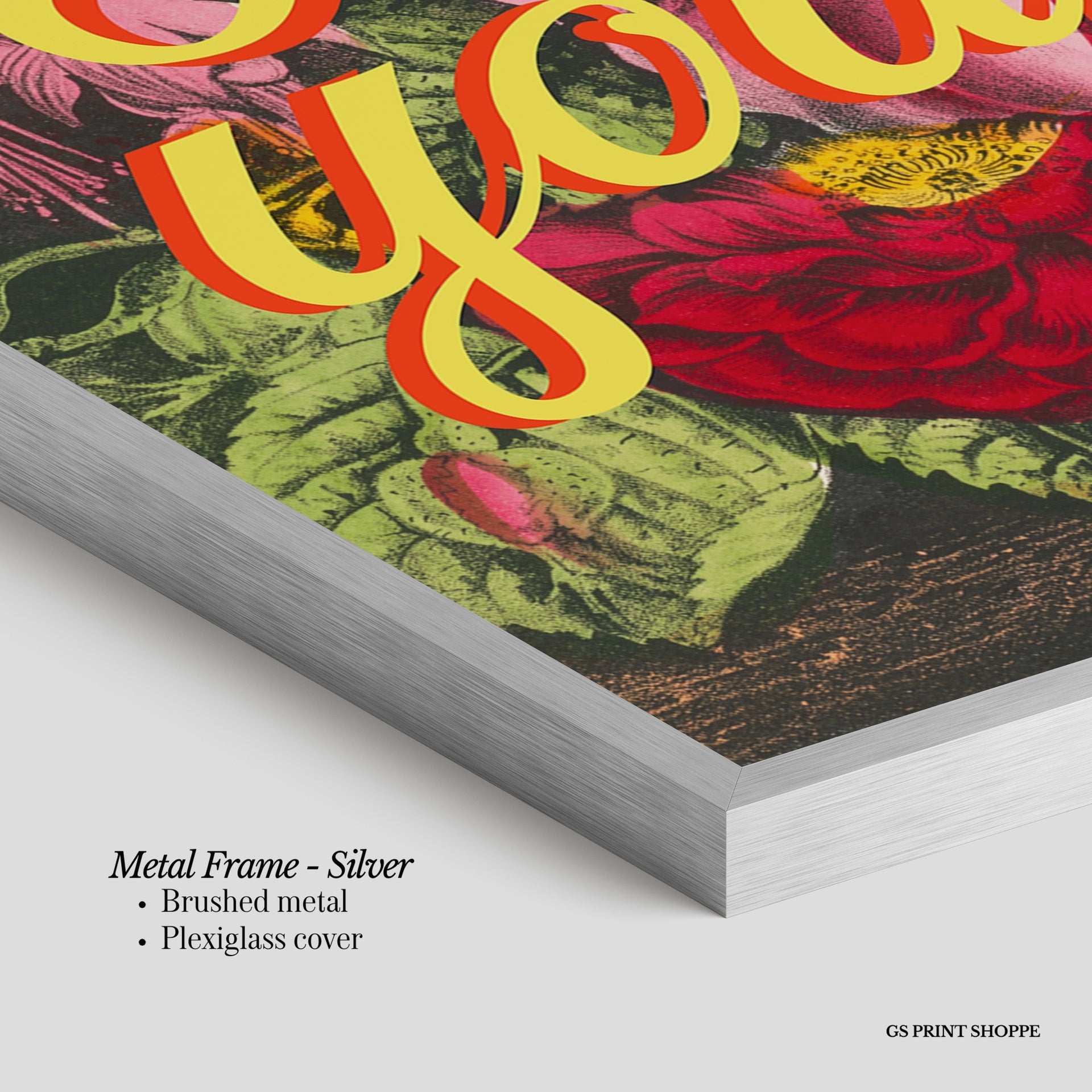 Metal Frame: Sleek and modern, our metal frame is crafted with brushed metal for a polished finish. It comes with durable plexiglass and sturdy metal hangers for horizontal or vertical display.
