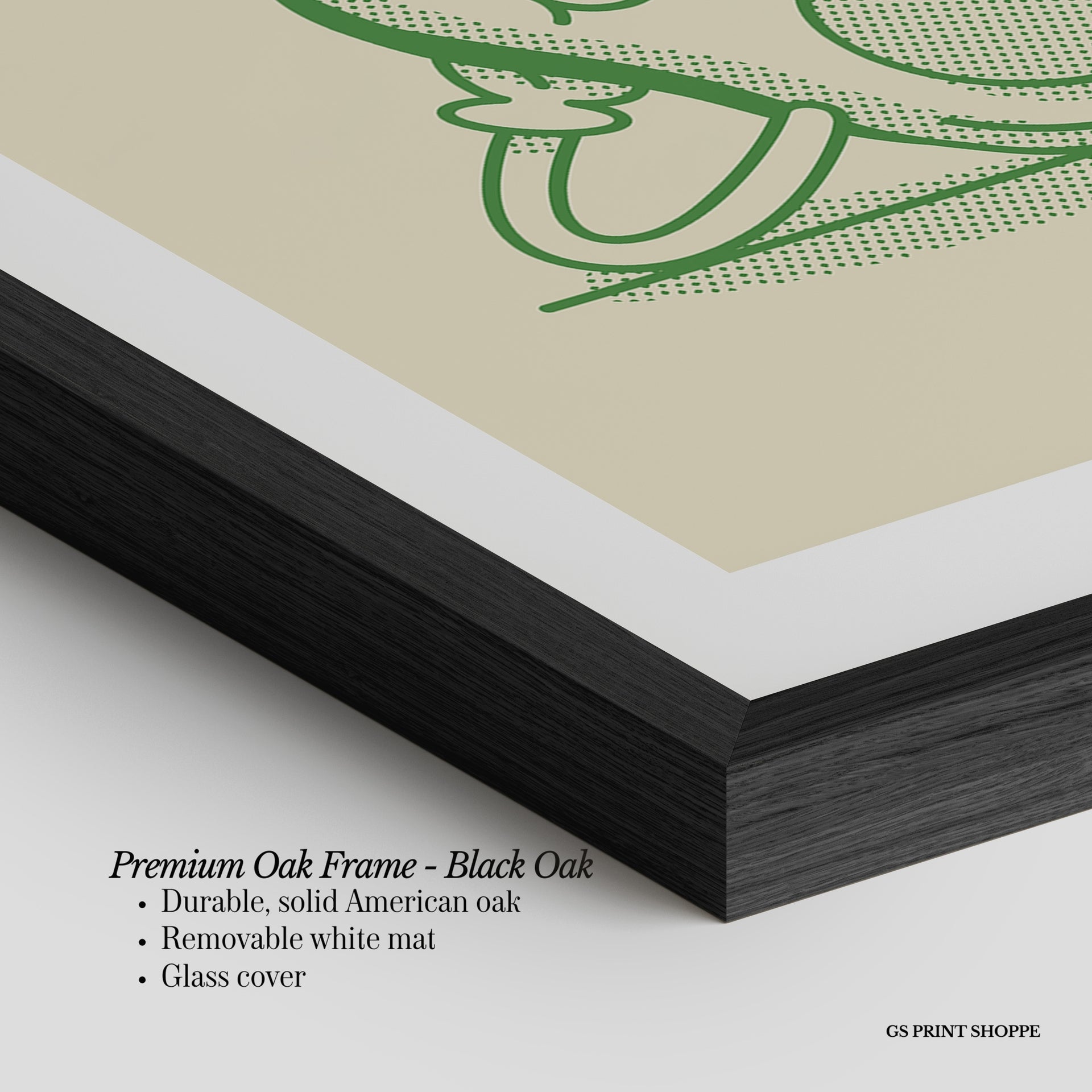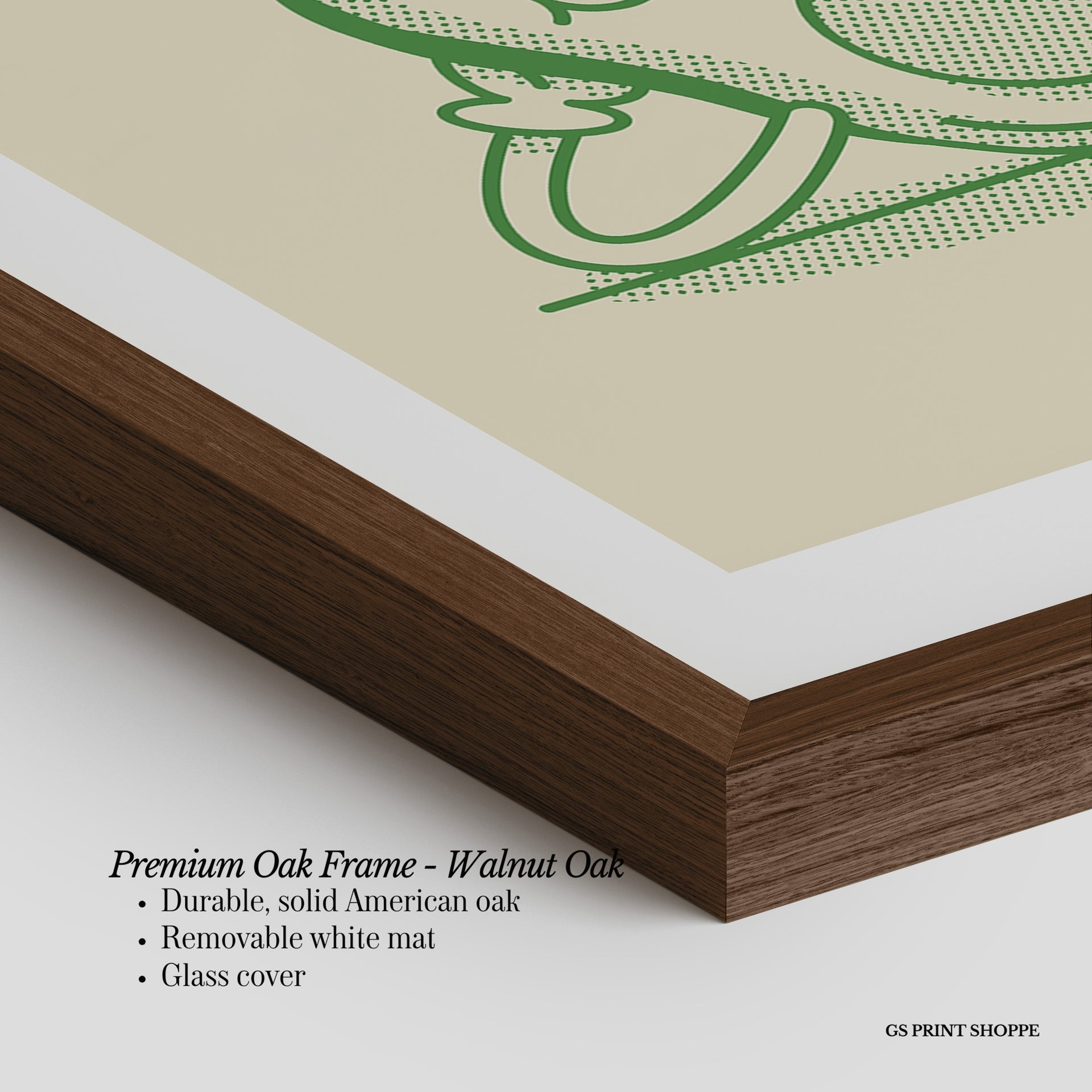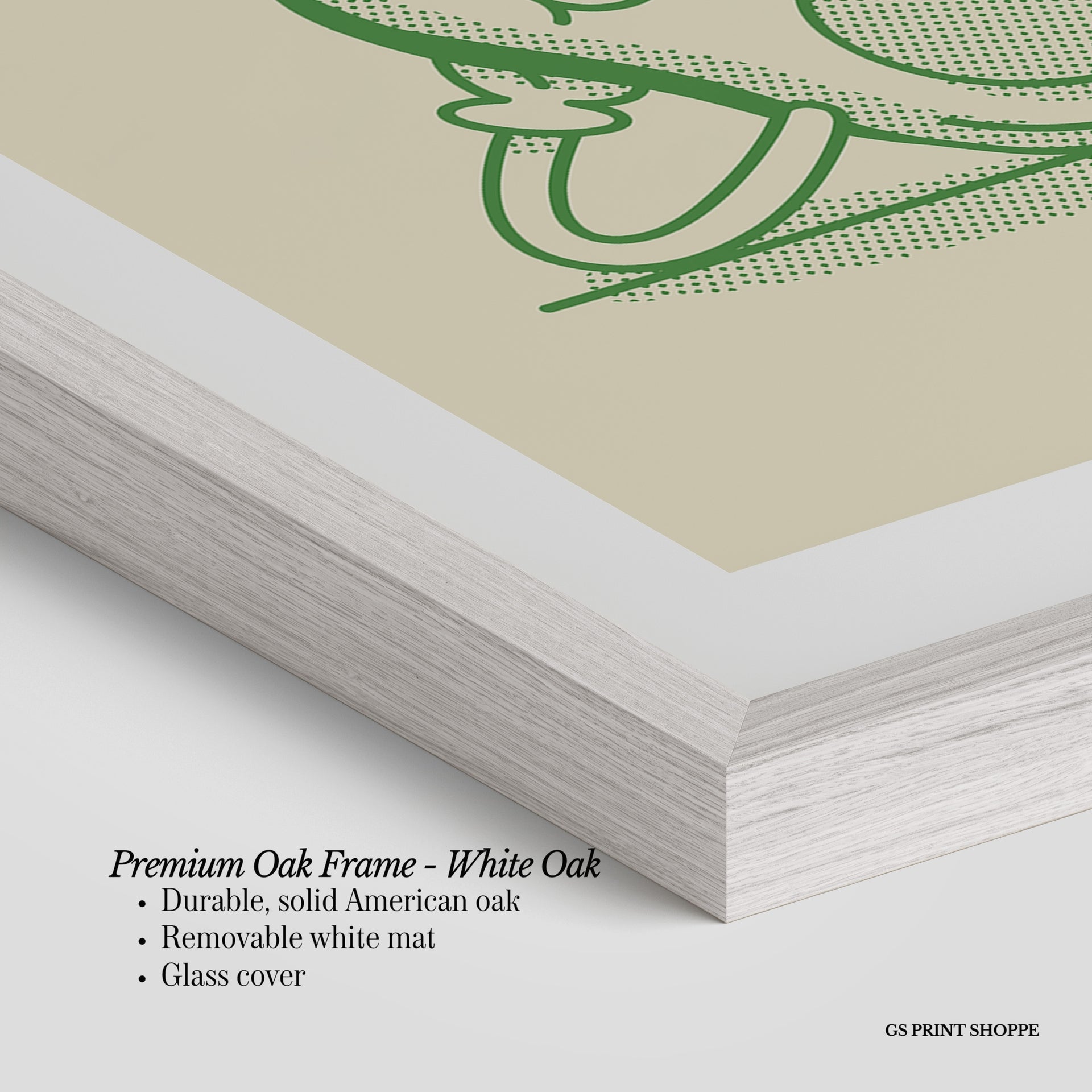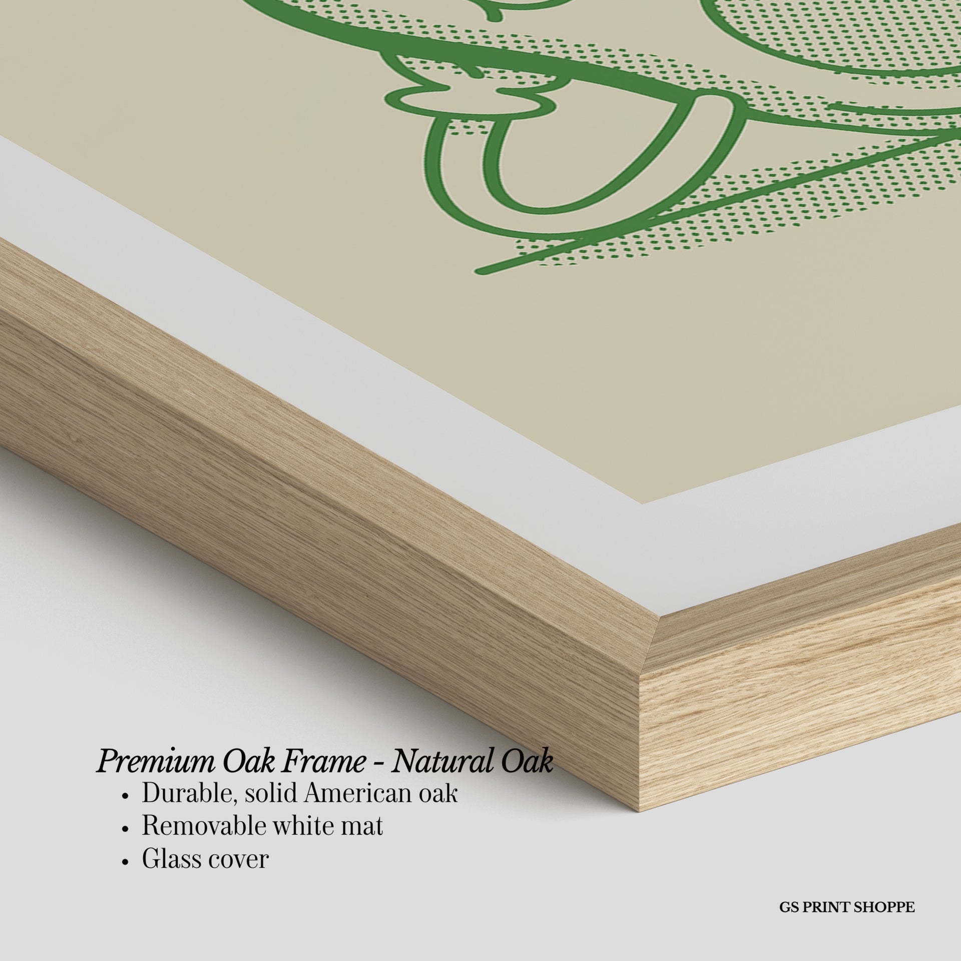 Premium Oak Frame: Our premium oak frame is crafted from solid American oak, offering a warm, natural feel with a high-end finish. We complete this elevated offering with a bright white removable mat and real glass for a versatile and polished look.
