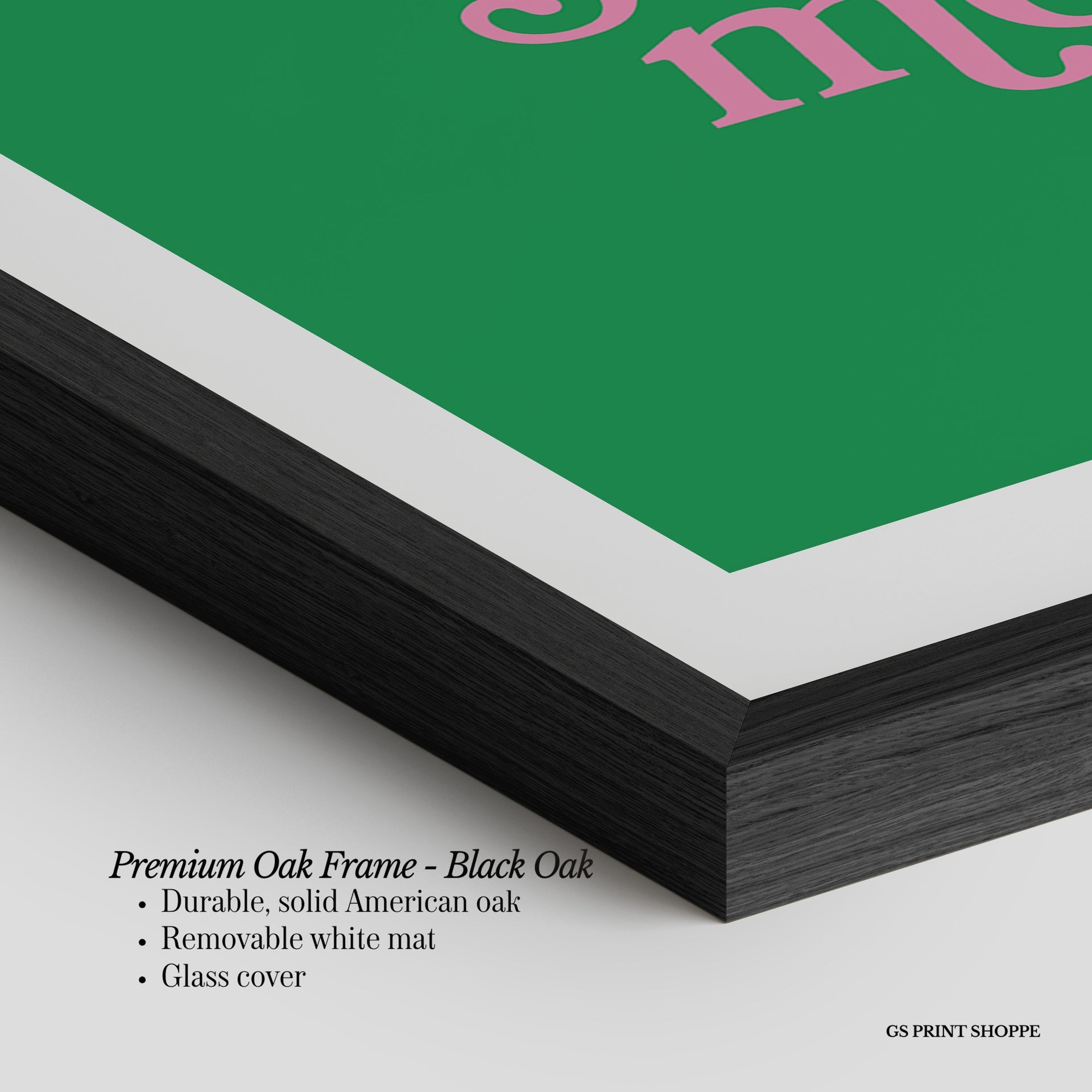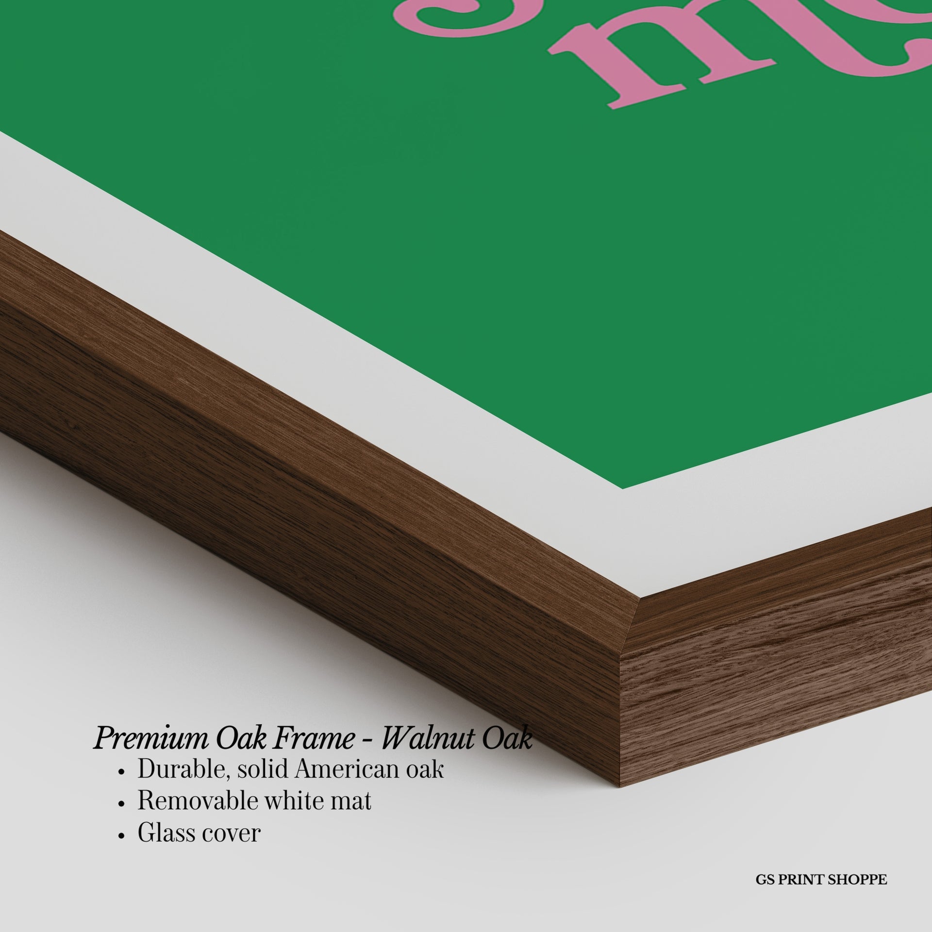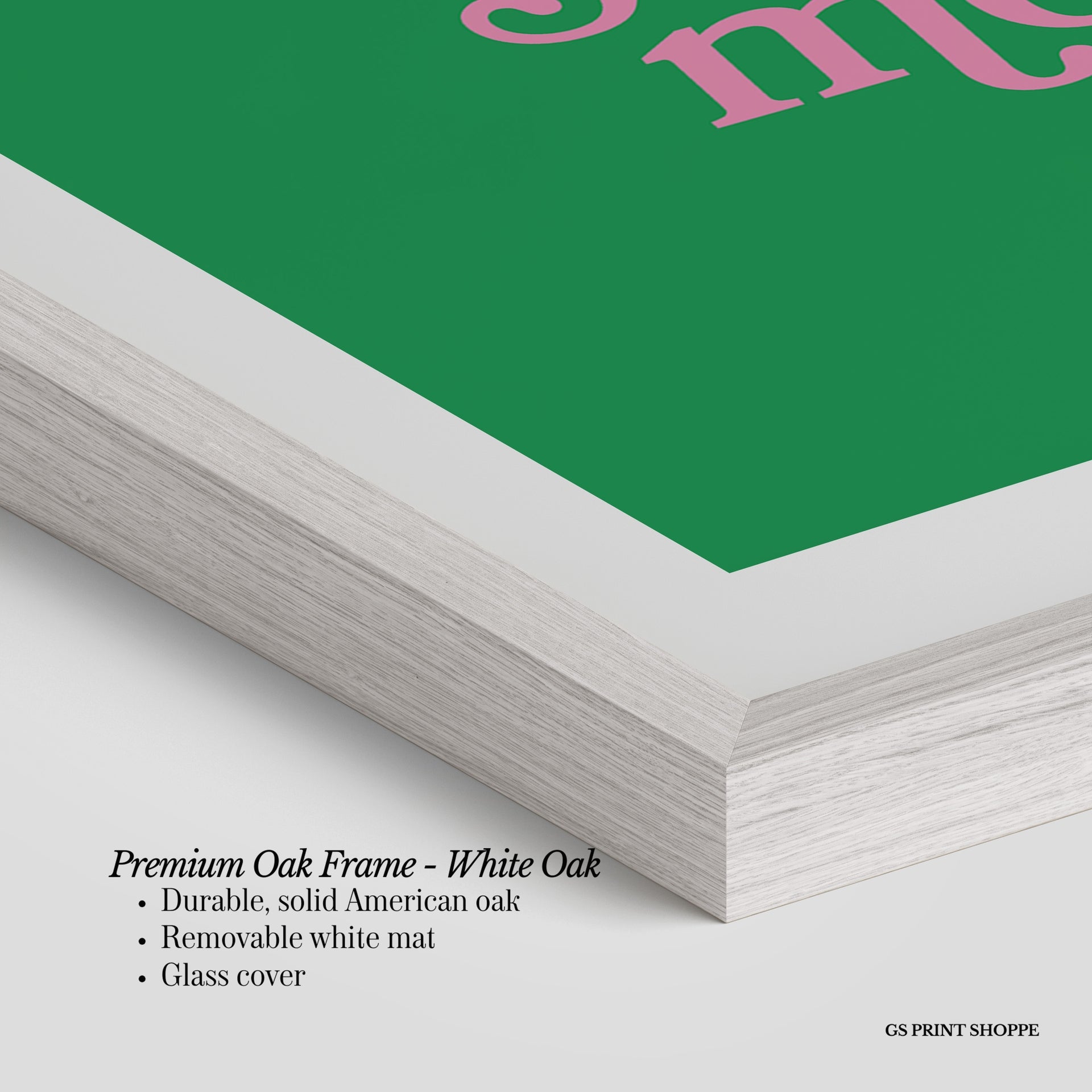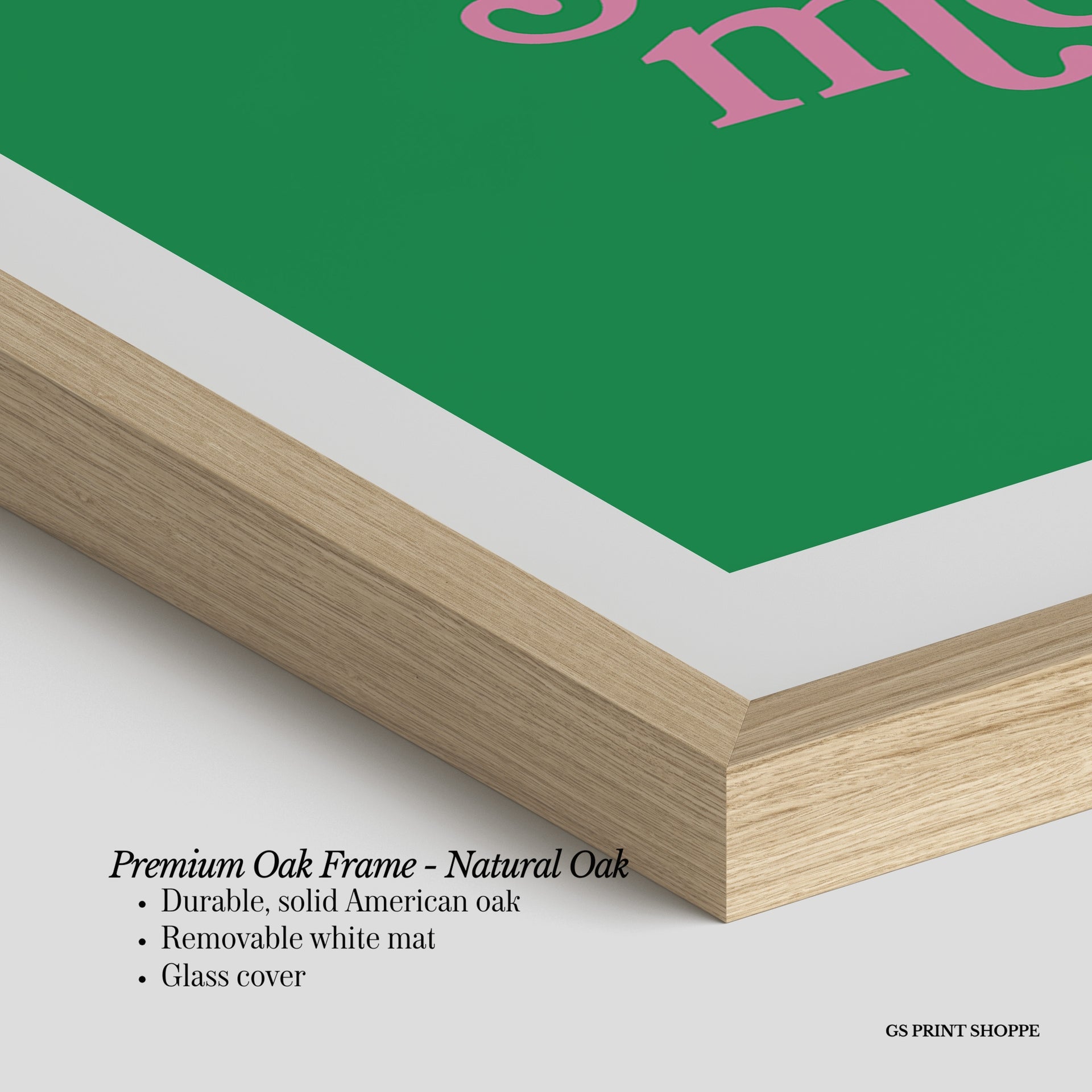 Premium Oak Frame: Our premium oak frame is crafted from solid American oak, offering a warm, natural feel with a high-end finish. We complete this elevated offering with a bright white removable mat and real glass for a versatile and polished look.