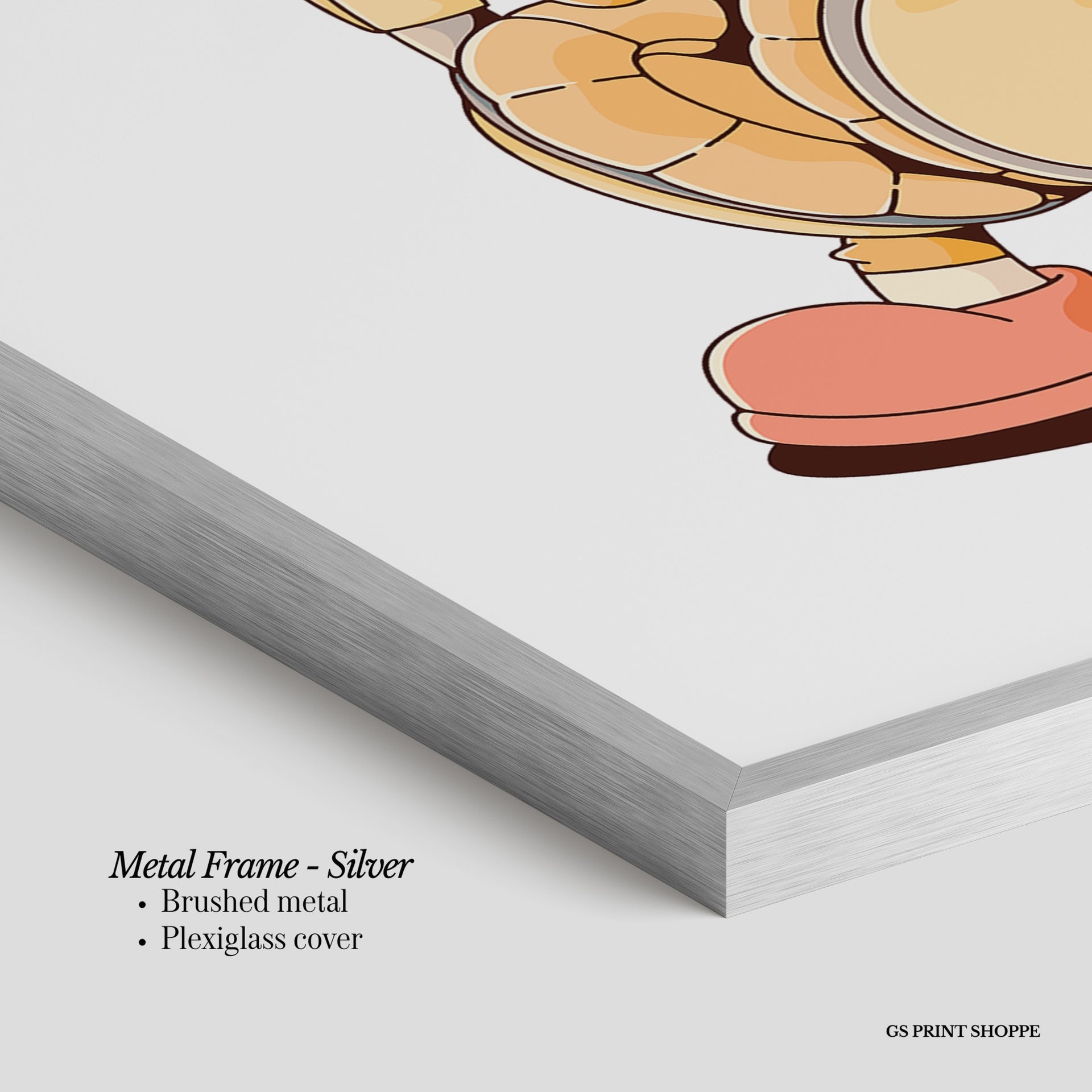 Metal Frame: Sleek and modern, our metal frame is crafted with brushed metal for a polished finish. It comes with durable plexiglass and sturdy metal hangers for horizontal or vertical display.