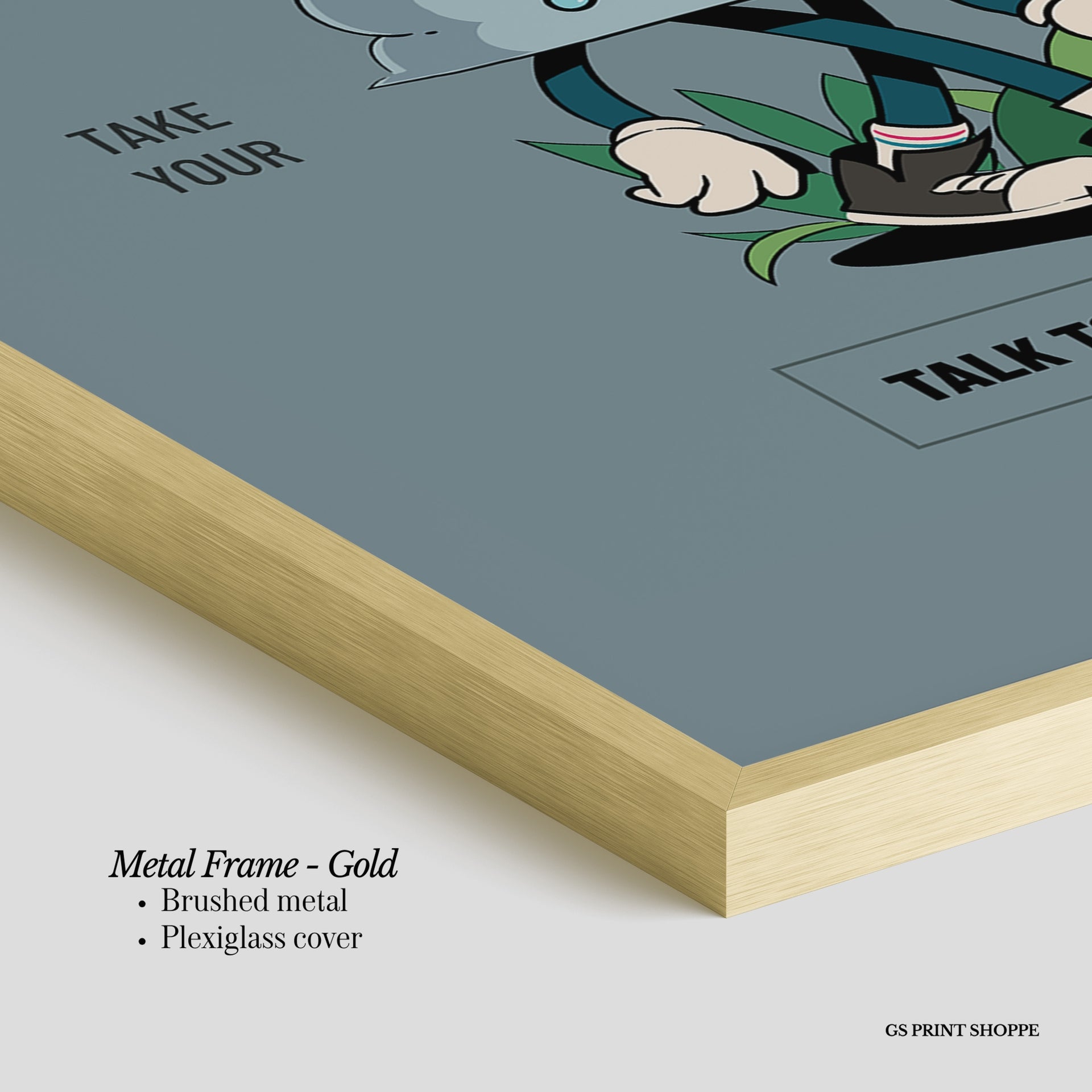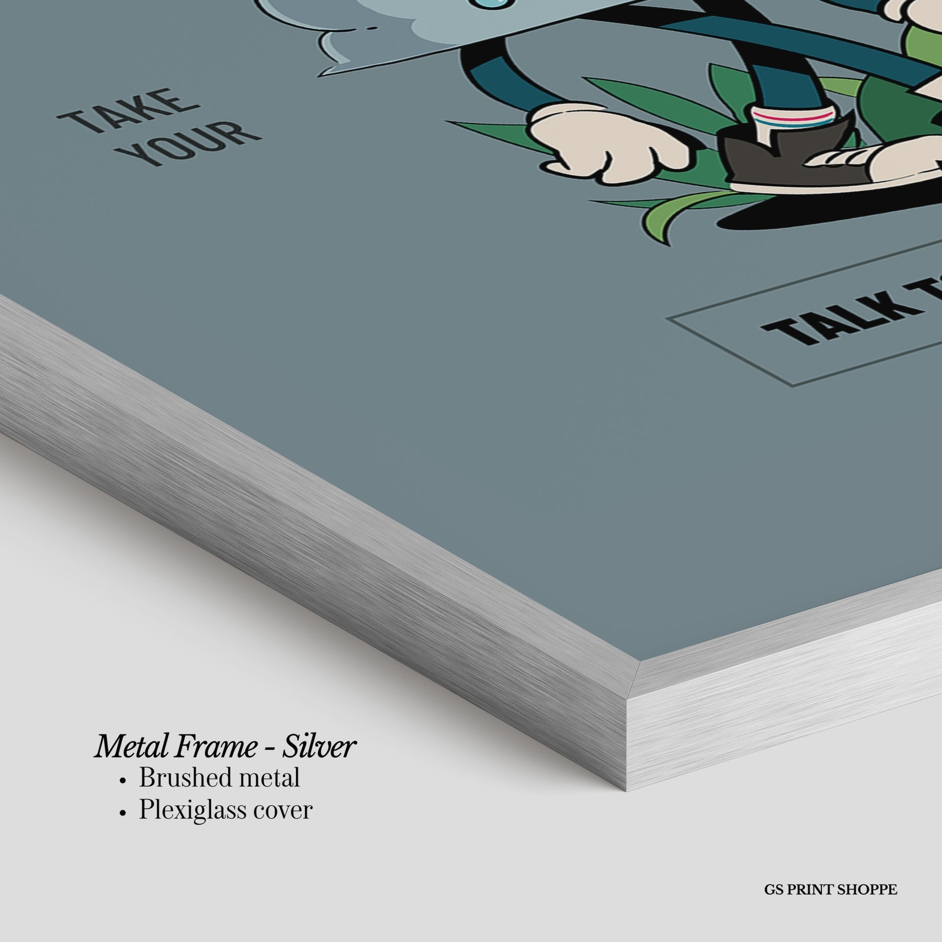 Metal Frame: Sleek and modern, our metal frame is crafted with brushed metal for a polished finish. It comes with durable plexiglass and sturdy metal hangers for horizontal or vertical display.