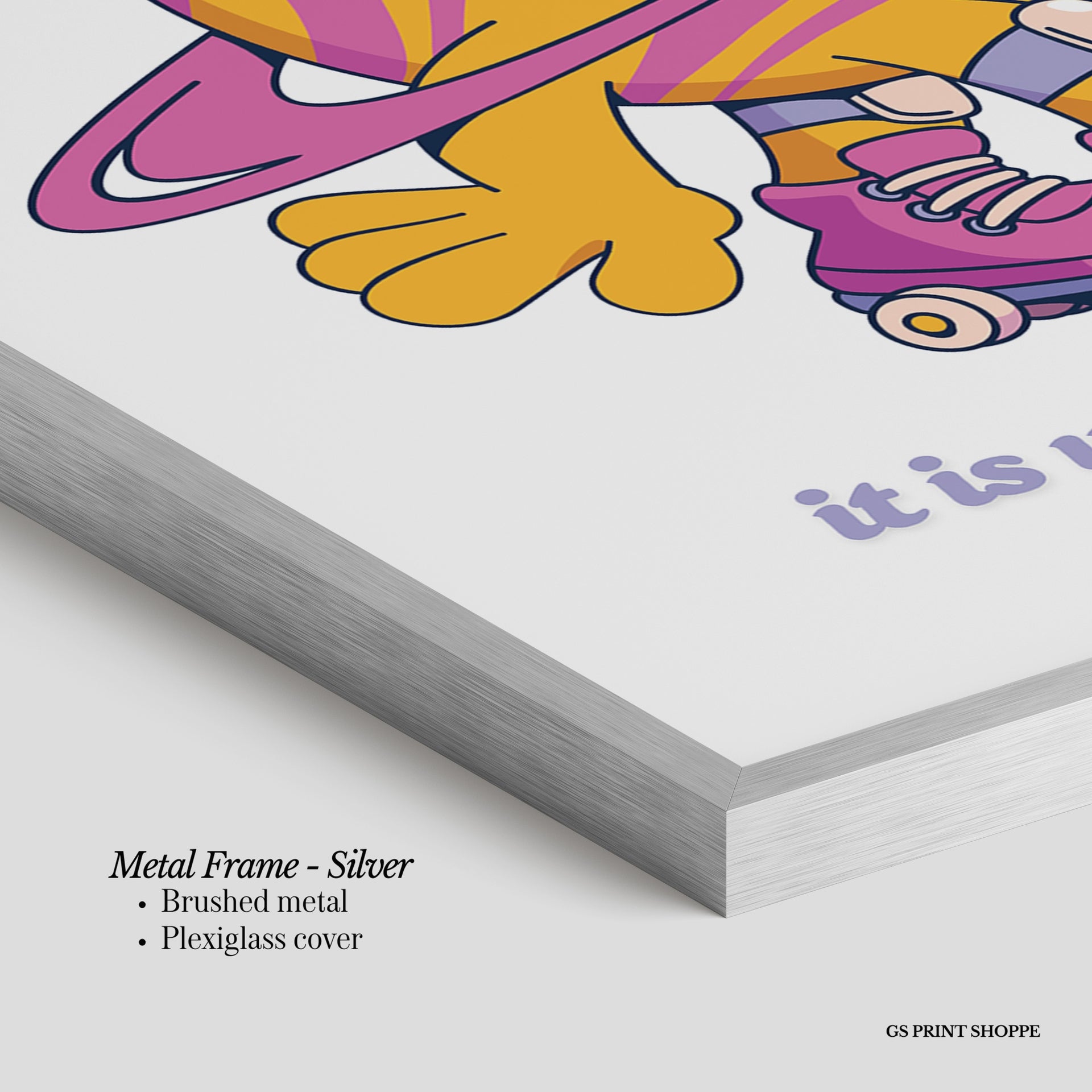 Metal Frame: Sleek and modern, our metal frame is crafted with brushed metal for a polished finish. It comes with durable plexiglass and sturdy metal hangers for horizontal or vertical display.
