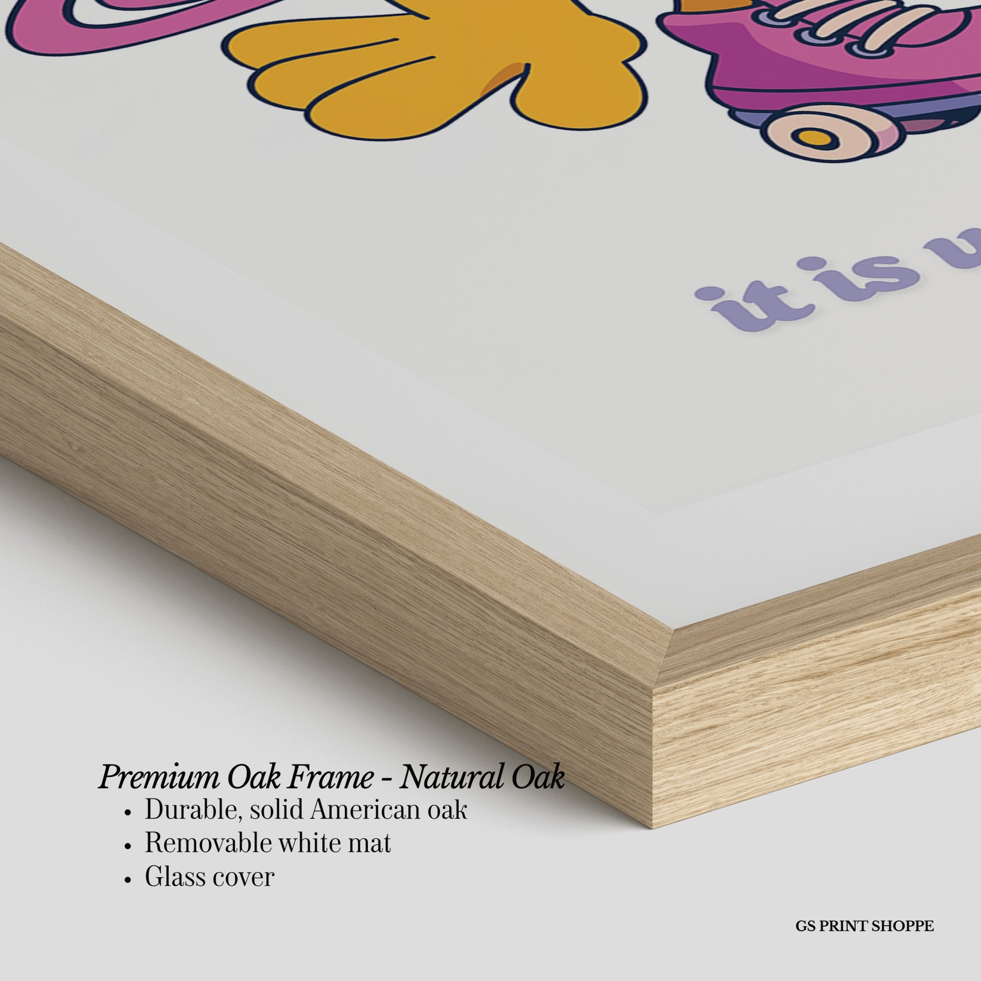 Premium Oak Frame: Our premium oak frame is crafted from solid American oak, offering a warm, natural feel with a high-end finish. We complete this elevated offering with a bright white removable mat and real glass for a versatile and polished look.