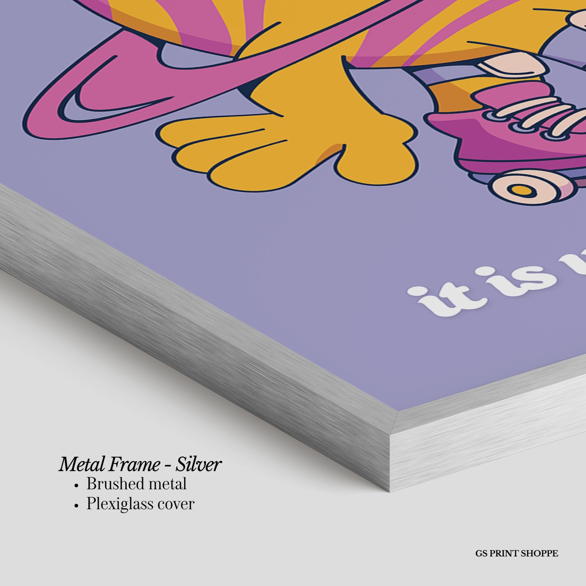 Metal Frame: Sleek and modern, our metal frame is crafted with brushed metal for a polished finish. It comes with durable plexiglass and sturdy metal hangers for horizontal or vertical display.
