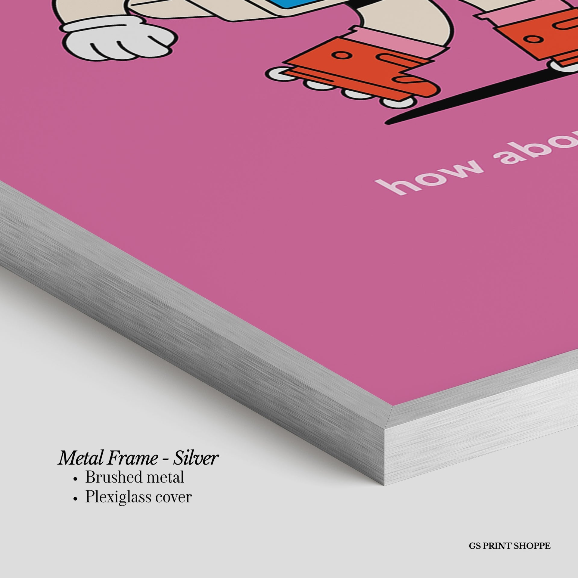 Metal Frame: Sleek and modern, our metal frame is crafted with brushed metal for a polished finish. It comes with durable plexiglass and sturdy metal hangers for horizontal or vertical display.