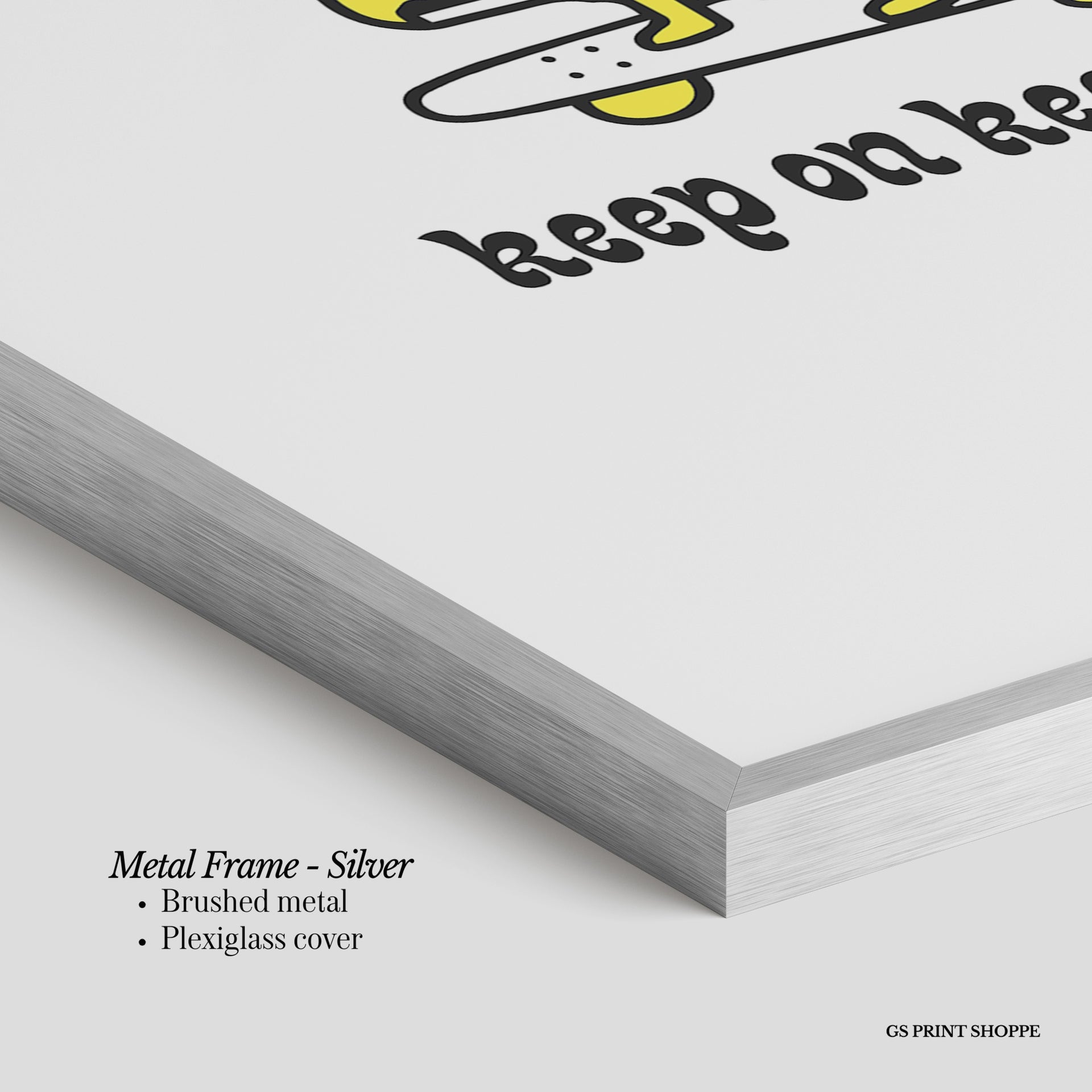 Metal Frame: Sleek and modern, our metal frame is crafted with brushed metal for a polished finish. It comes with durable plexiglass and sturdy metal hangers for horizontal or vertical display.