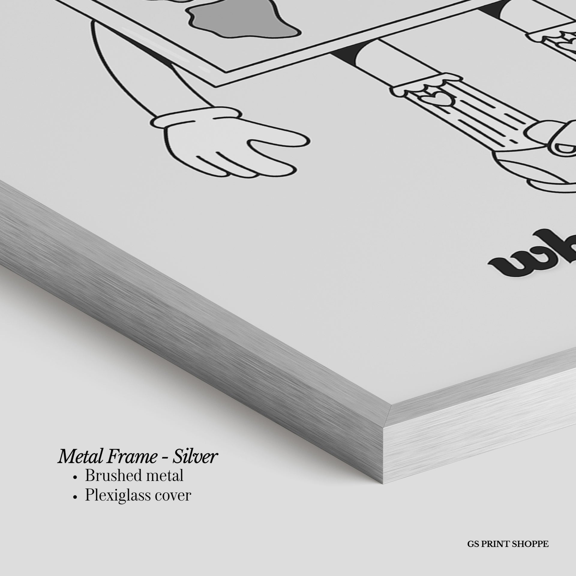 Metal Frame: Sleek and modern, our metal frame is crafted with brushed metal for a polished finish. It comes with durable plexiglass and sturdy metal hangers for horizontal or vertical display.