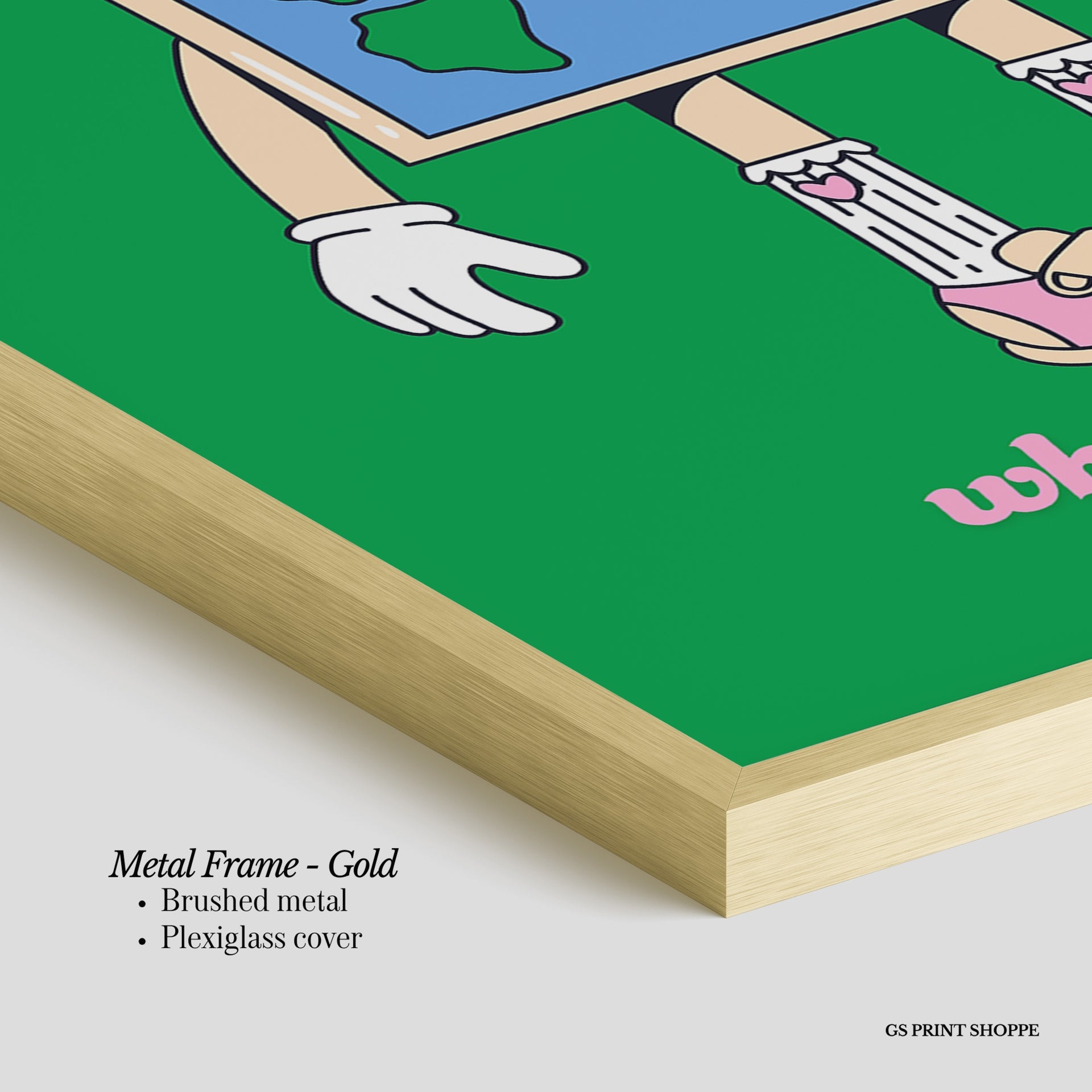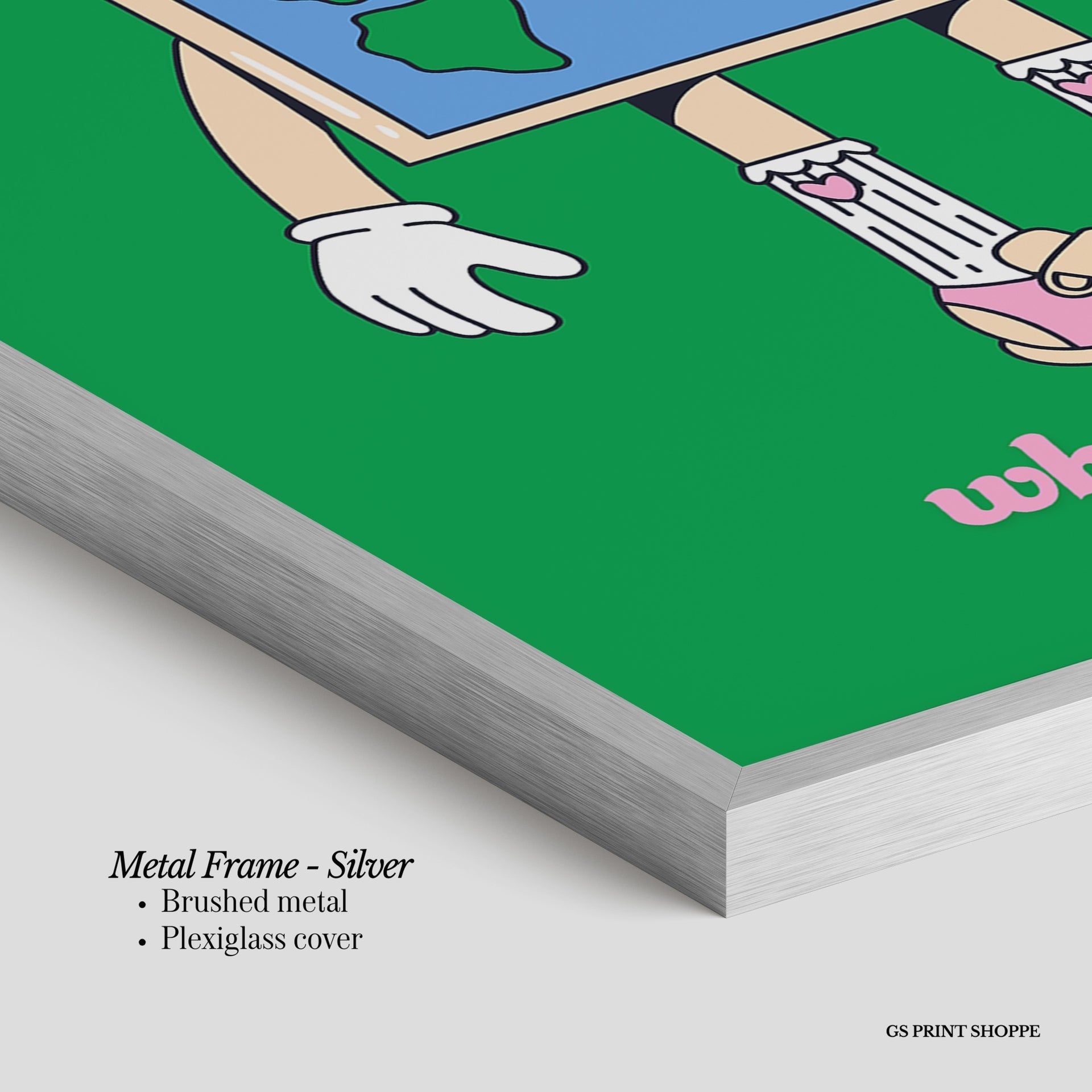 Metal Frame: Sleek and modern, our metal frame is crafted with brushed metal for a polished finish. It comes with durable plexiglass and sturdy metal hangers for horizontal or vertical display.