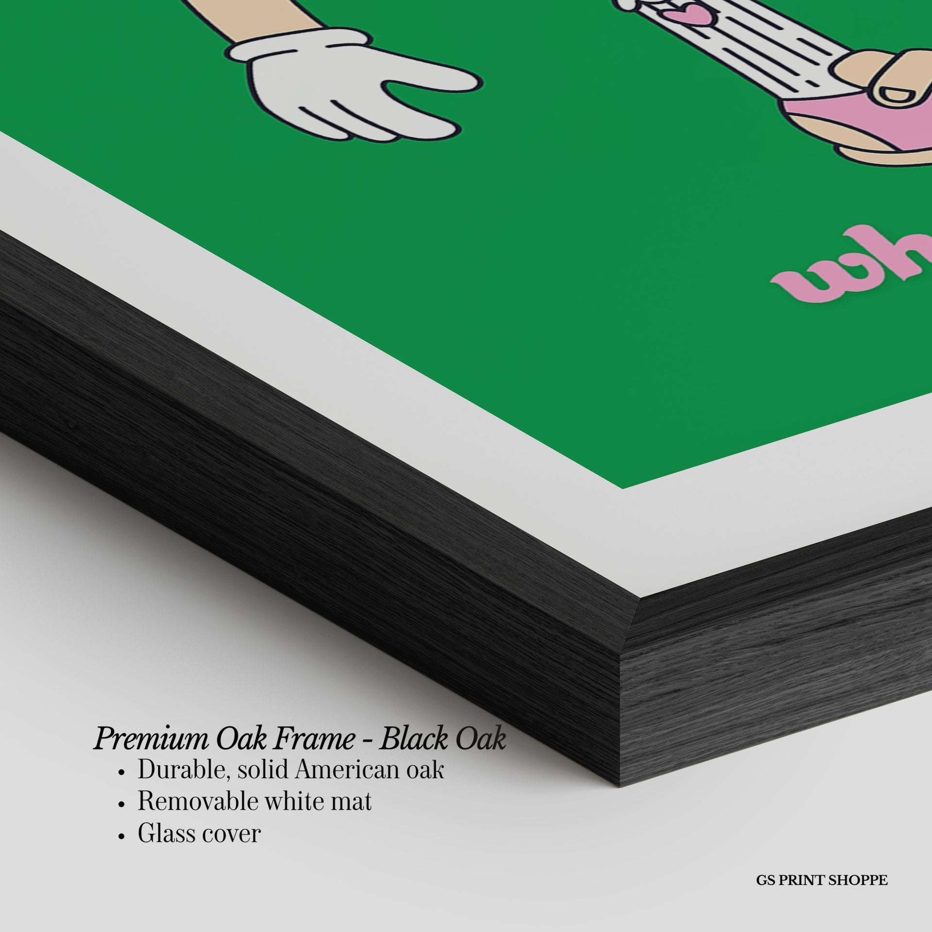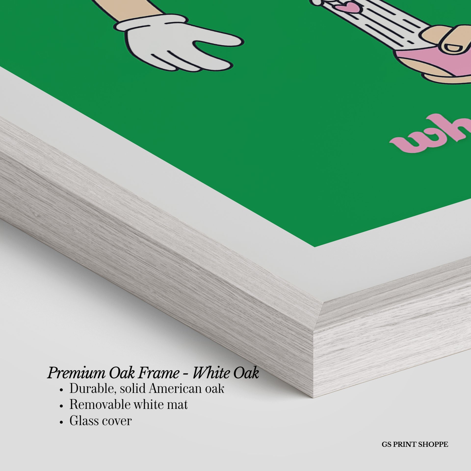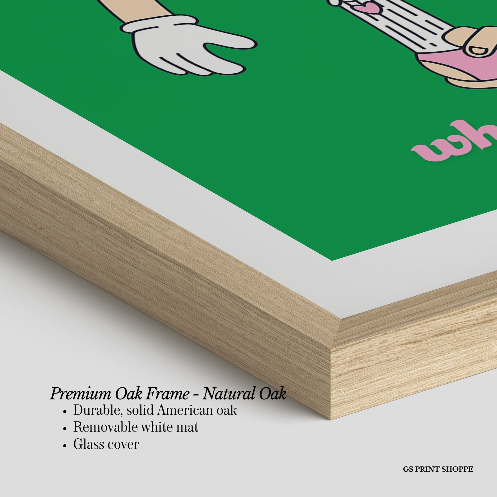 Premium Oak Frame: Our premium oak frame is crafted from solid American oak, offering a warm, natural feel with a high-end finish. We complete this elevated offering with a bright white removable mat and real glass for a versatile and polished look.