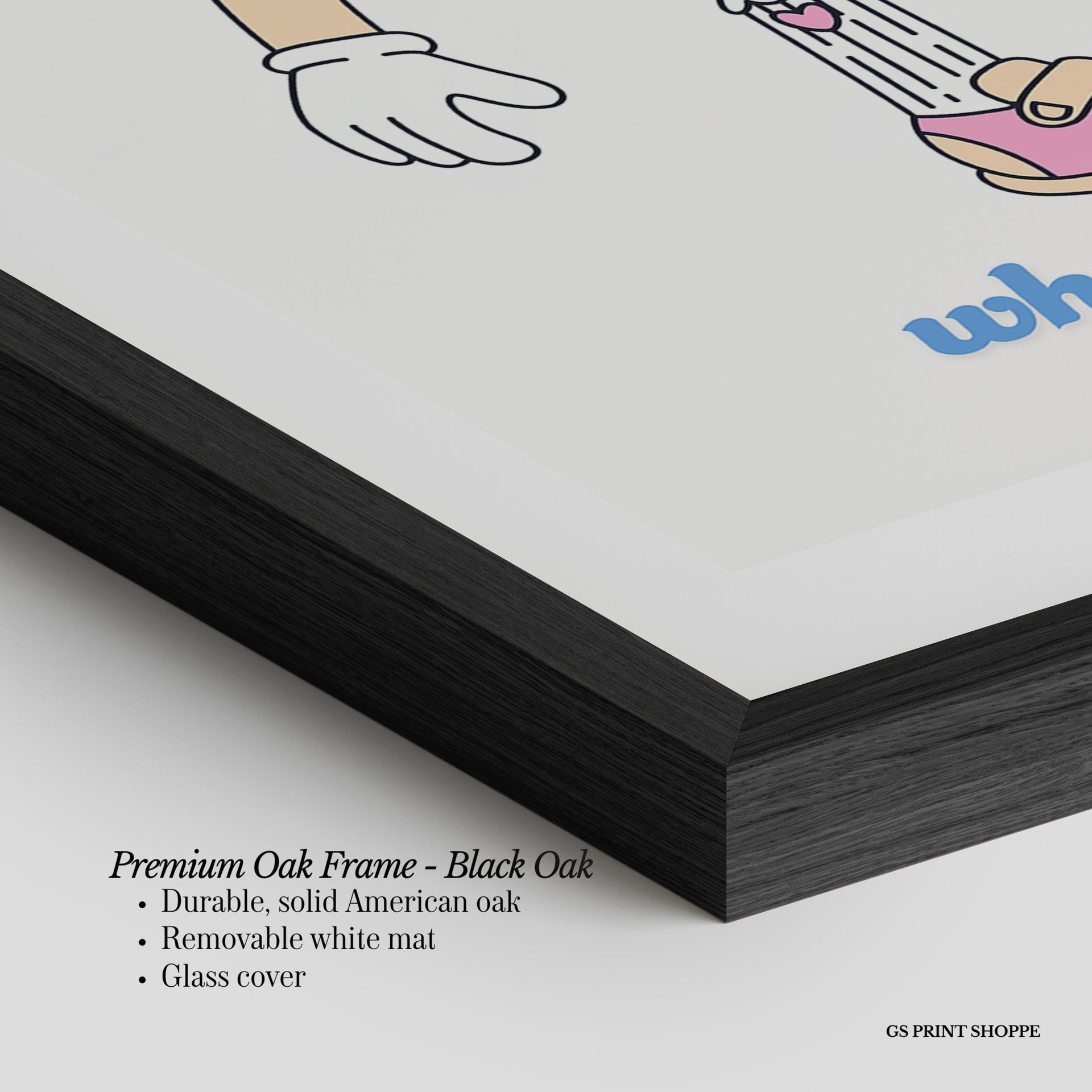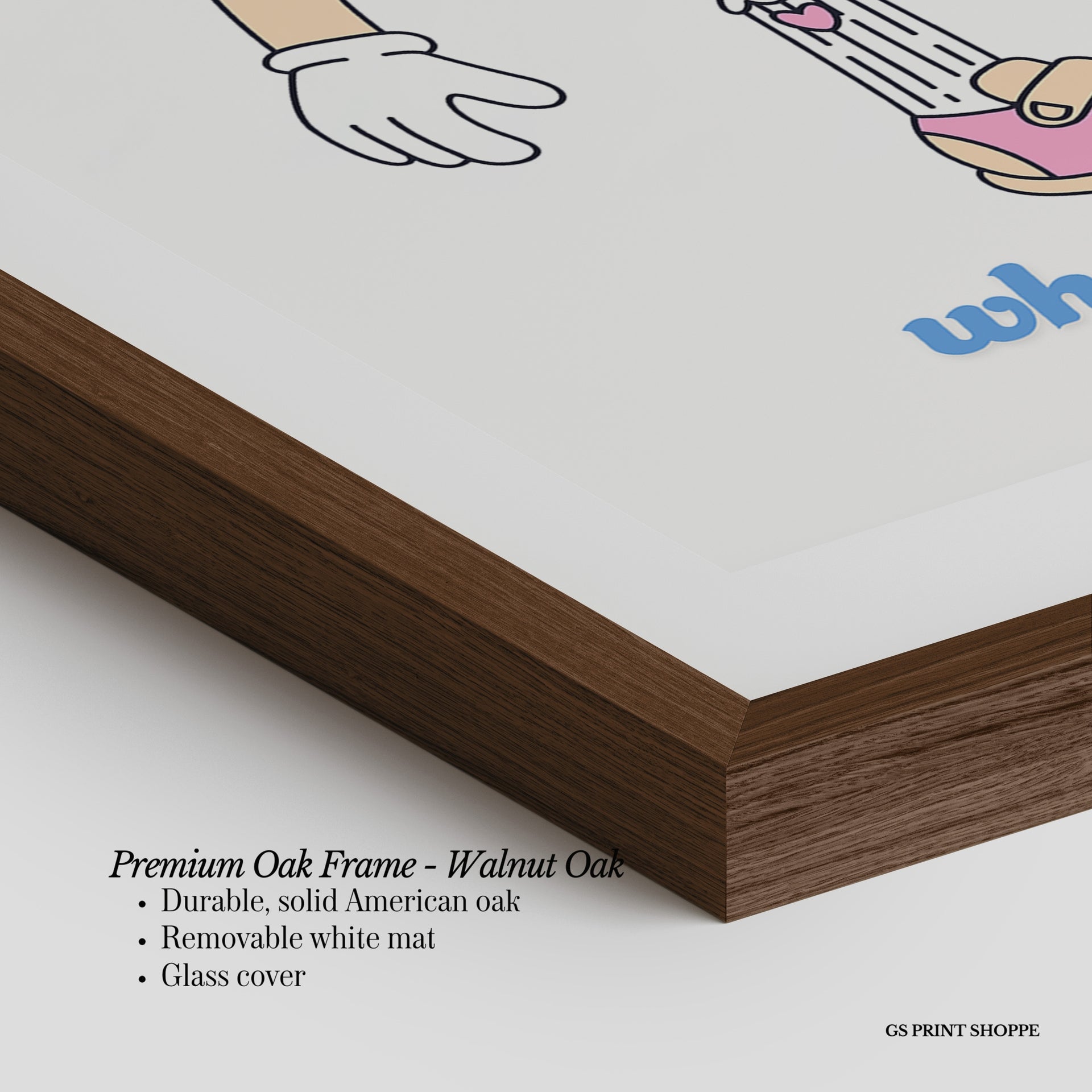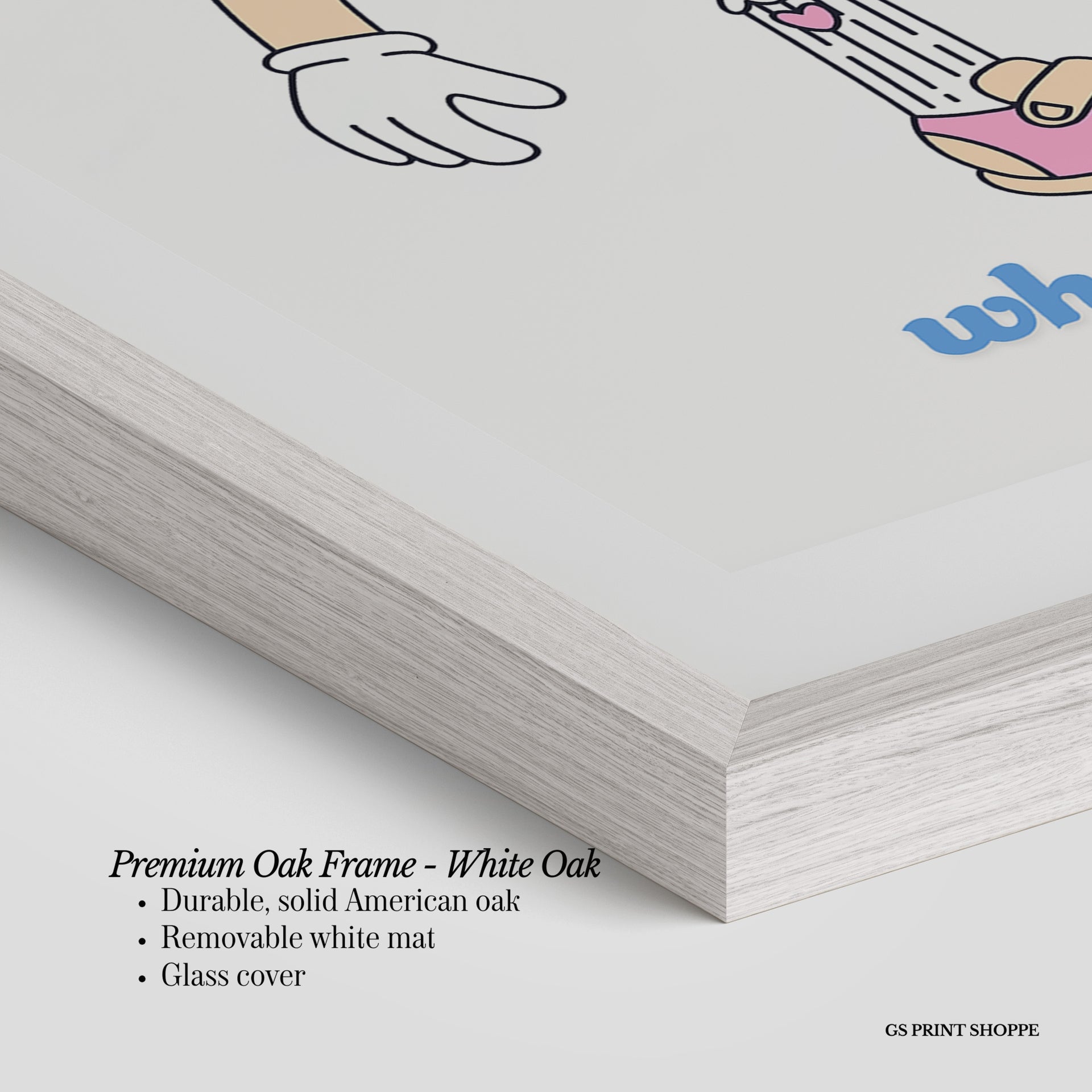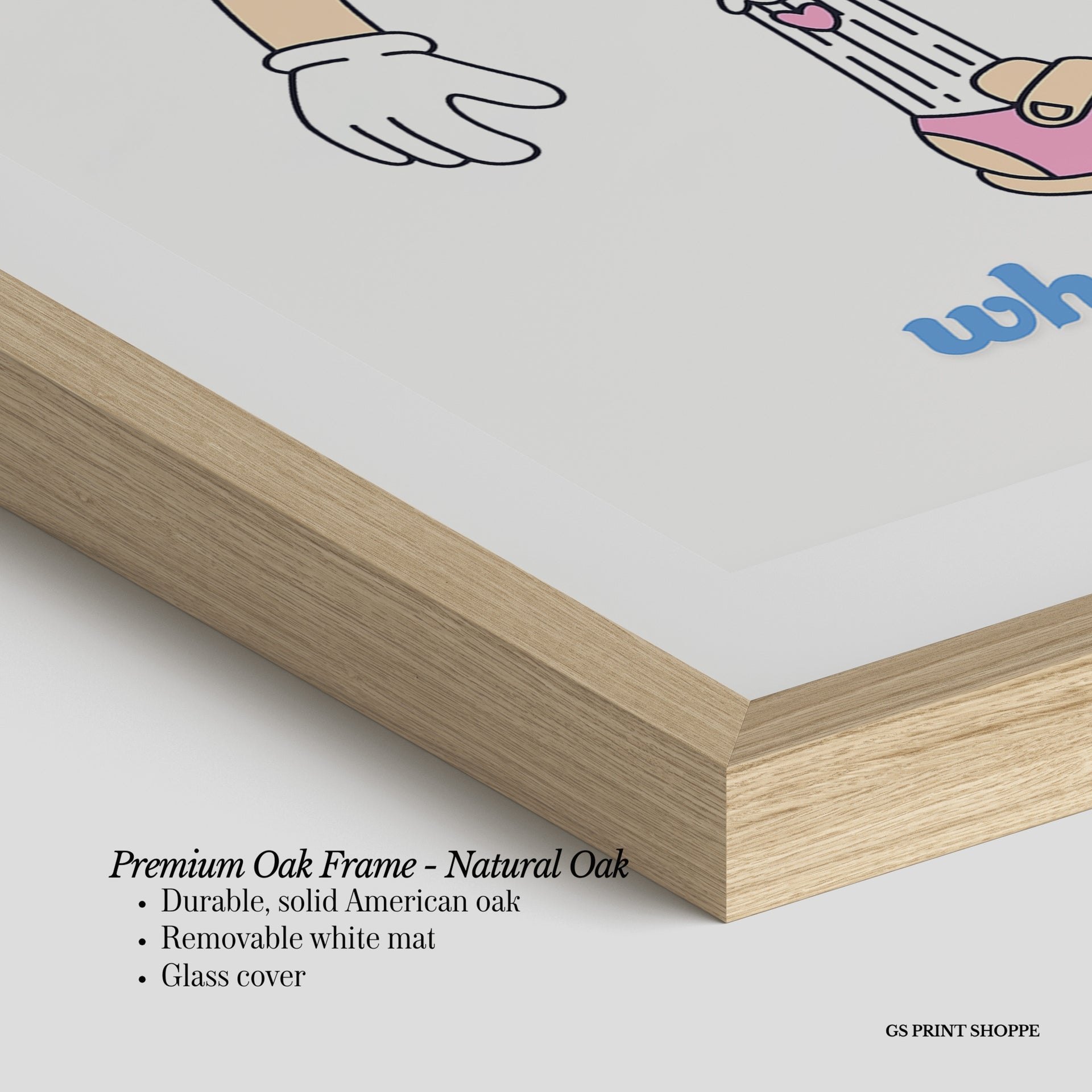 Premium Oak Frame: Our premium oak frame is crafted from solid American oak, offering a warm, natural feel with a high-end finish. We complete this elevated offering with a bright white removable mat and real glass for a versatile and polished look.