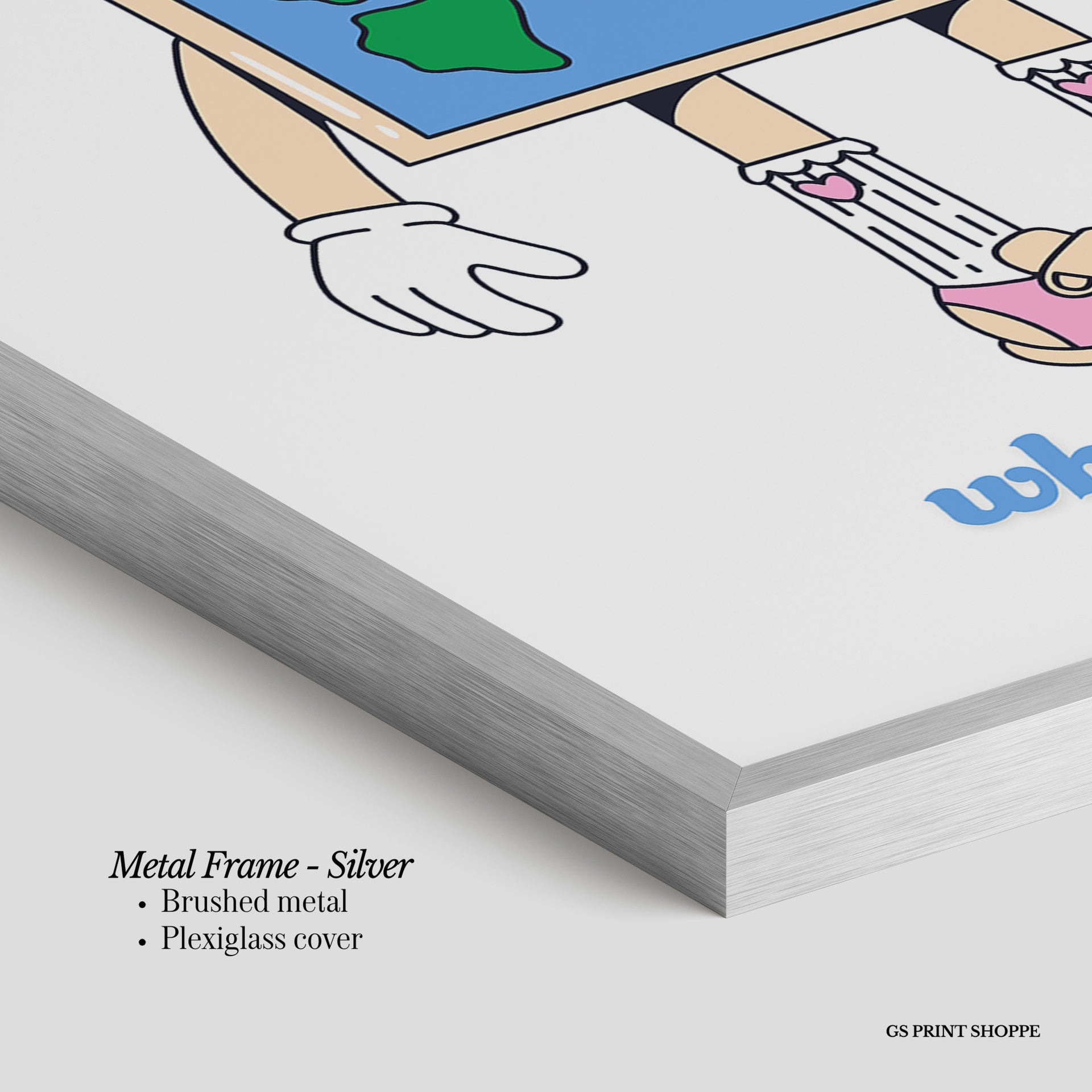 Metal Frame: Sleek and modern, our metal frame is crafted with brushed metal for a polished finish. It comes with durable plexiglass and sturdy metal hangers for horizontal or vertical display.