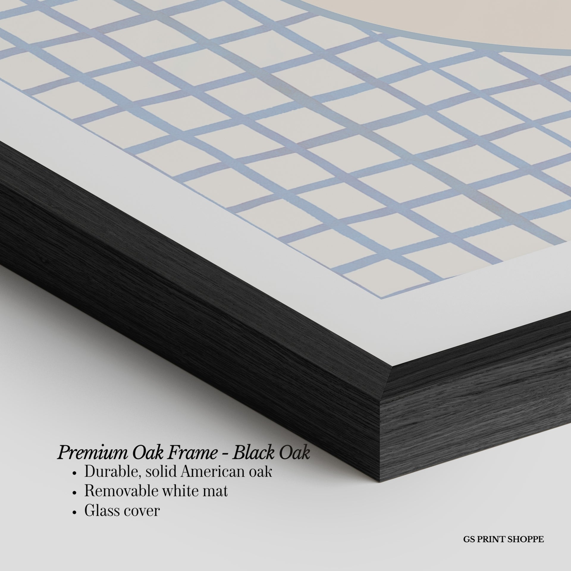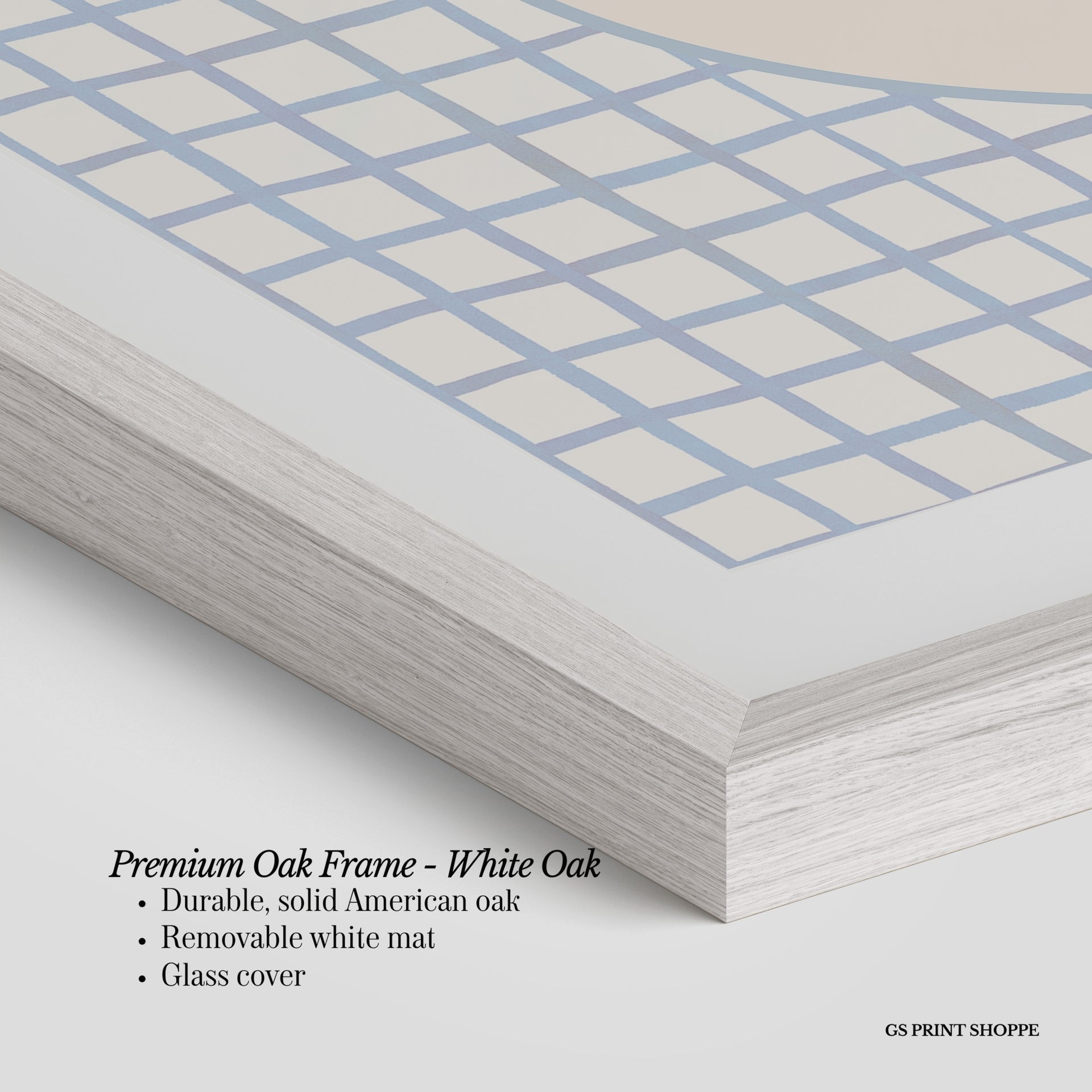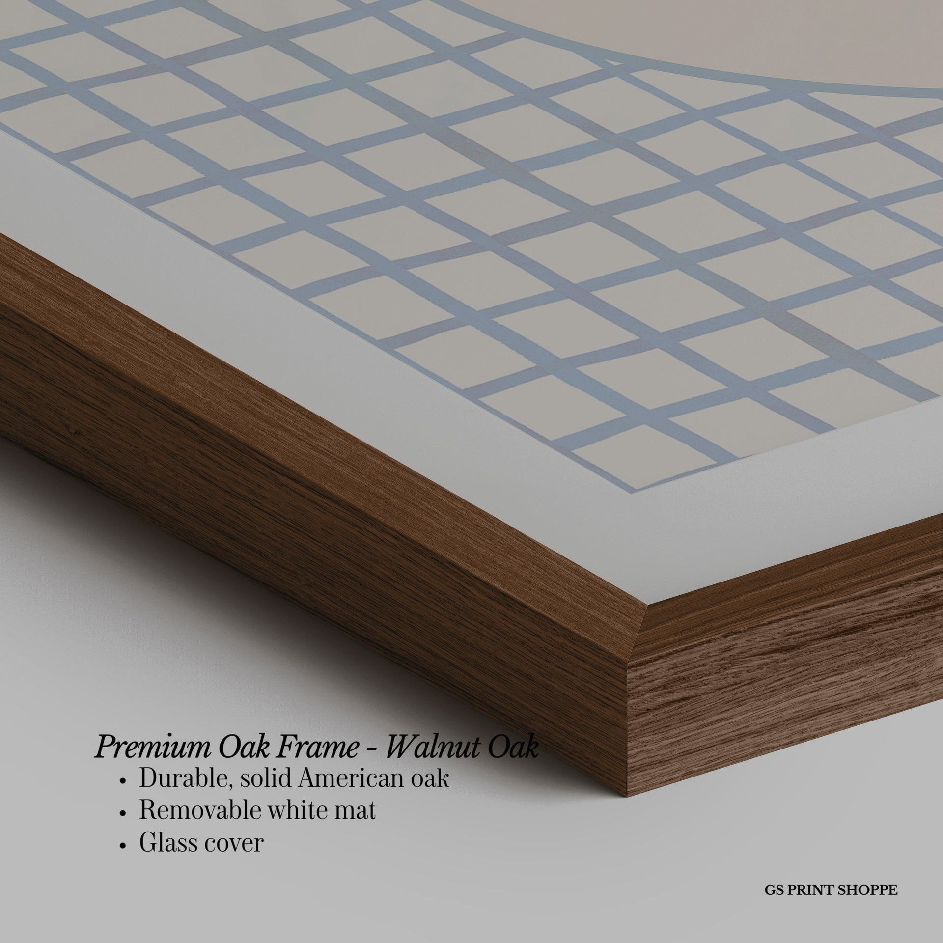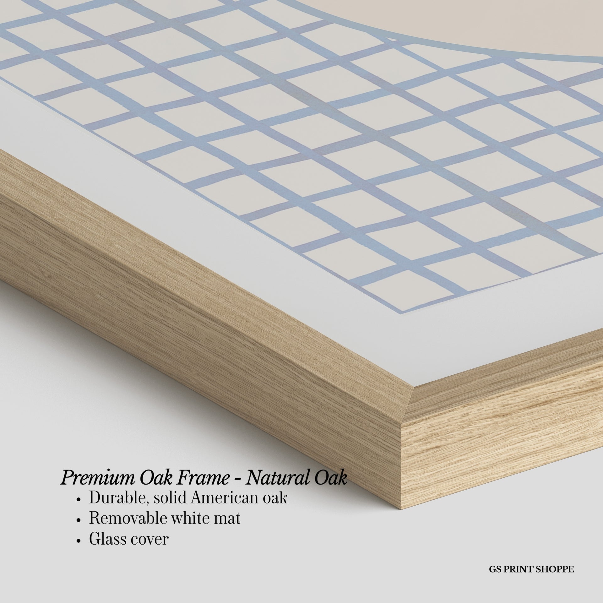 Premium Oak Frame: Our premium oak frame is crafted from solid American oak, offering a warm, natural feel with a high-end finish. We complete this elevated offering with a bright white removable mat and real glass for a versatile and polished look.