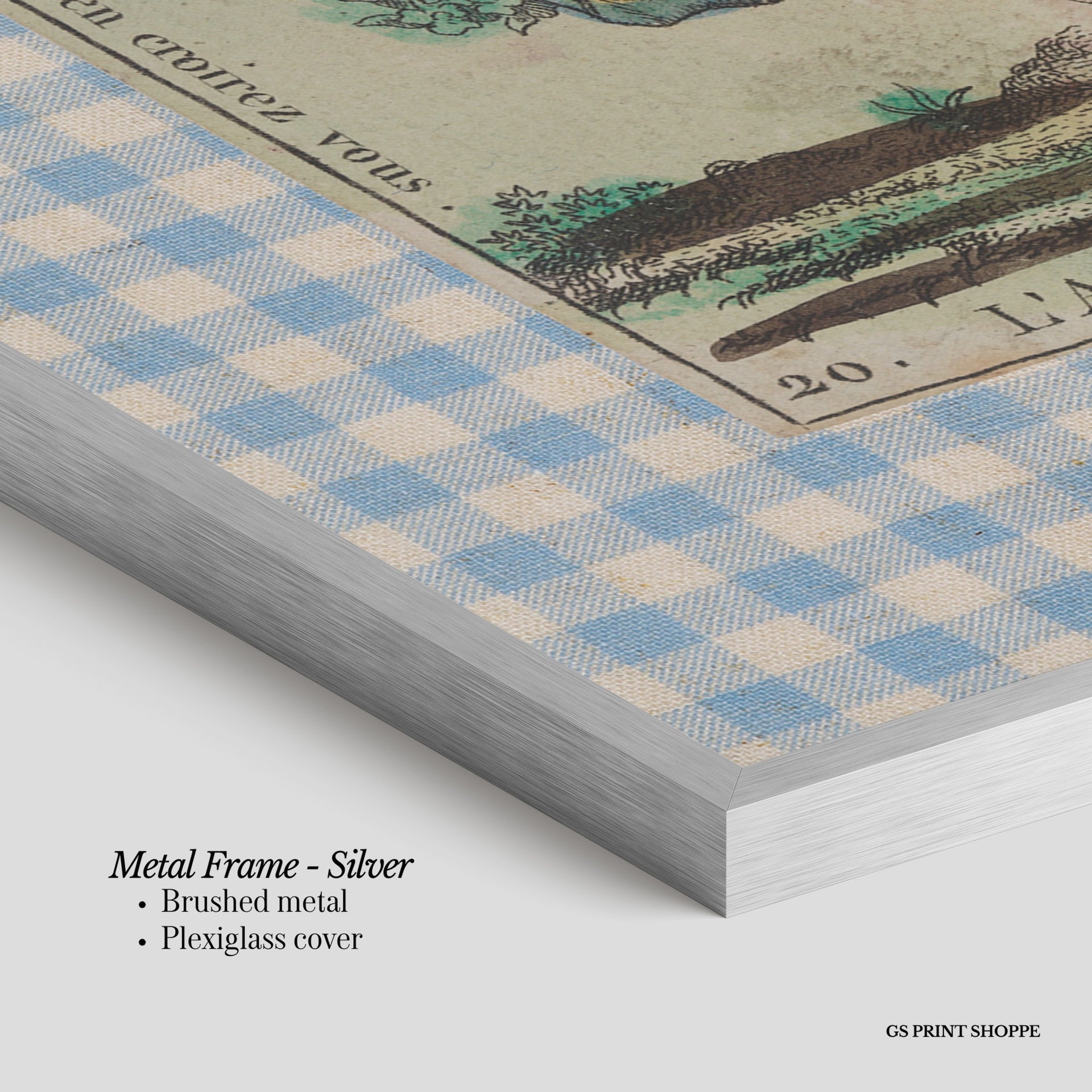 Metal Frame: Sleek and modern, our metal frame is crafted with brushed metal for a polished finish. It comes with durable plexiglass and sturdy metal hangers for horizontal or vertical display.