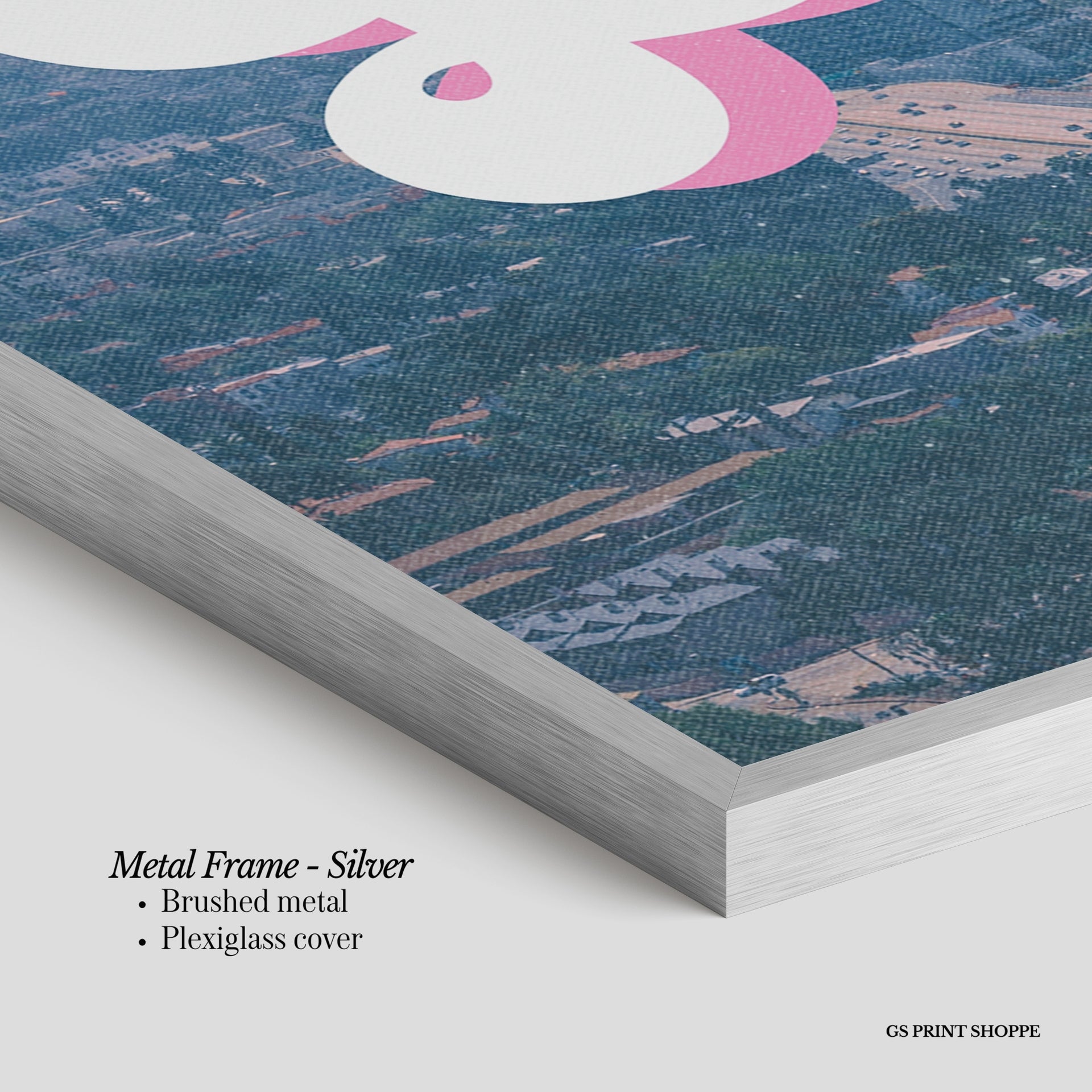 Metal Frame: Sleek and modern, our metal frame is crafted with brushed metal for a polished finish. It comes with durable plexiglass and sturdy metal hangers for horizontal or vertical display.