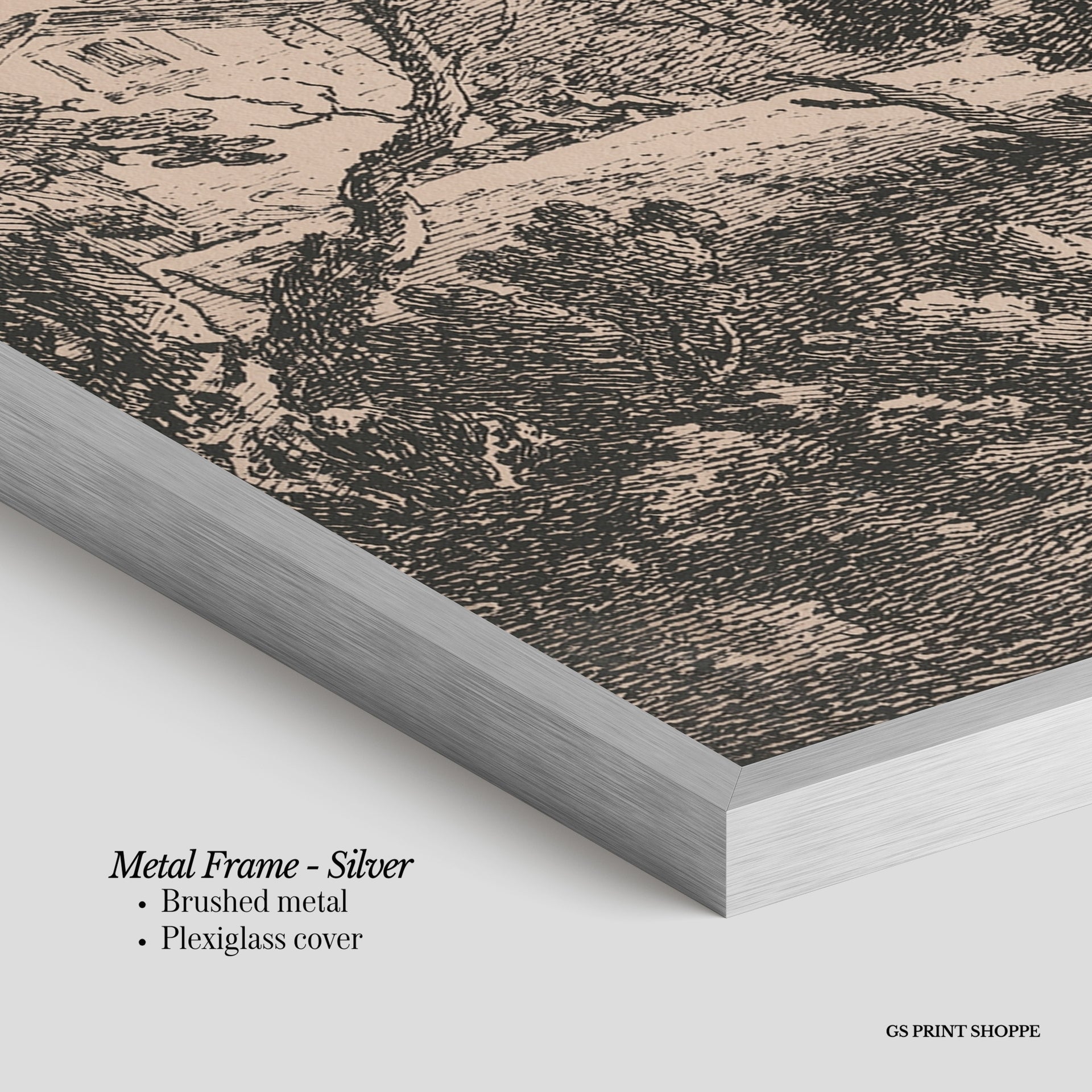 Metal Frame: Sleek and modern, our metal frame is crafted with brushed metal for a polished finish. It comes with durable plexiglass and sturdy metal hangers for horizontal or vertical display.