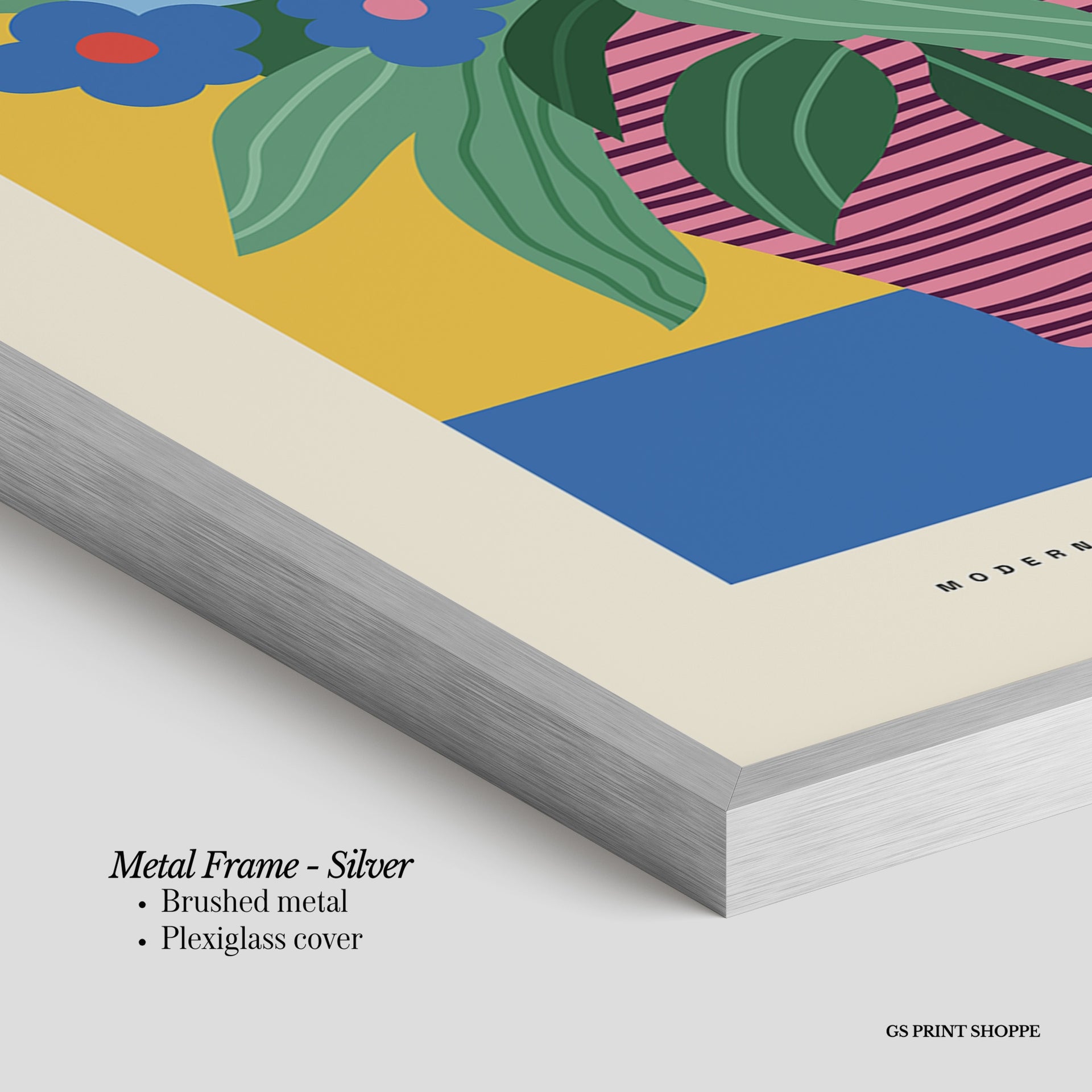 Metal Frame: Sleek and modern, our metal frame is crafted with brushed metal for a polished finish. It comes with durable plexiglass and sturdy metal hangers for horizontal or vertical display.