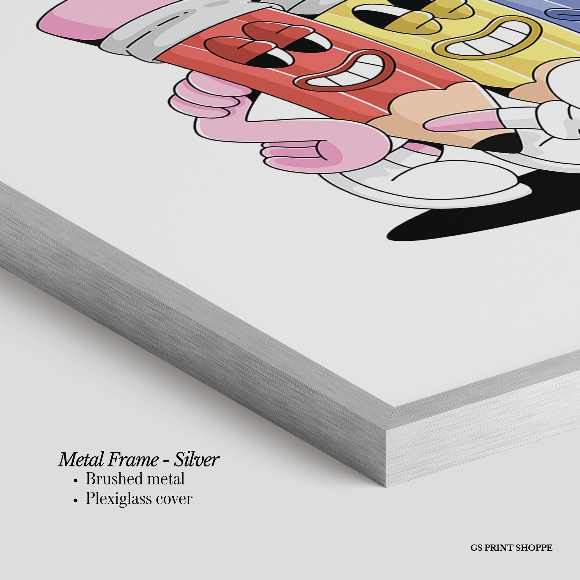 Metal Frame: Sleek and modern, our metal frame is crafted with brushed metal for a polished finish. It comes with durable plexiglass and sturdy metal hangers for horizontal or vertical display.
