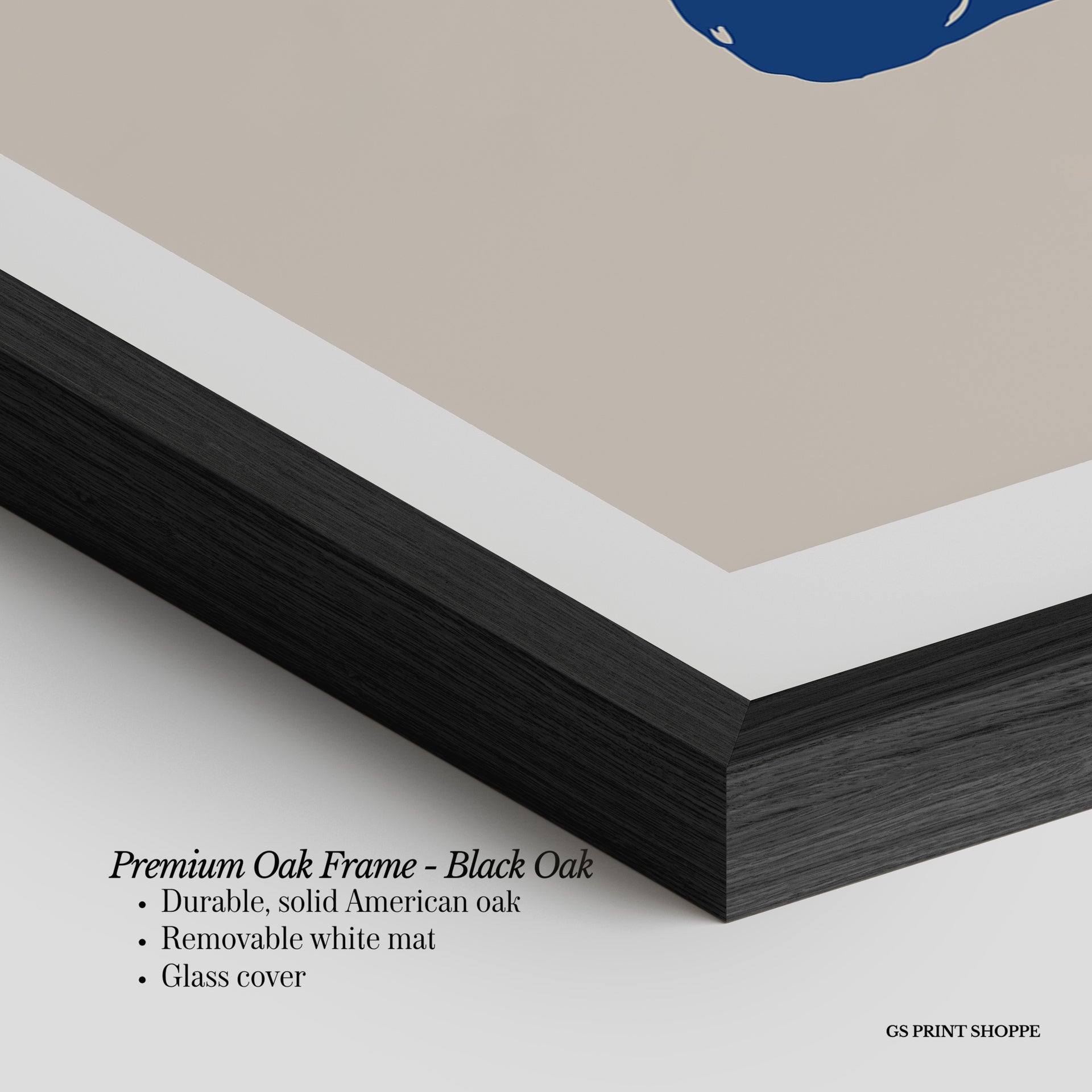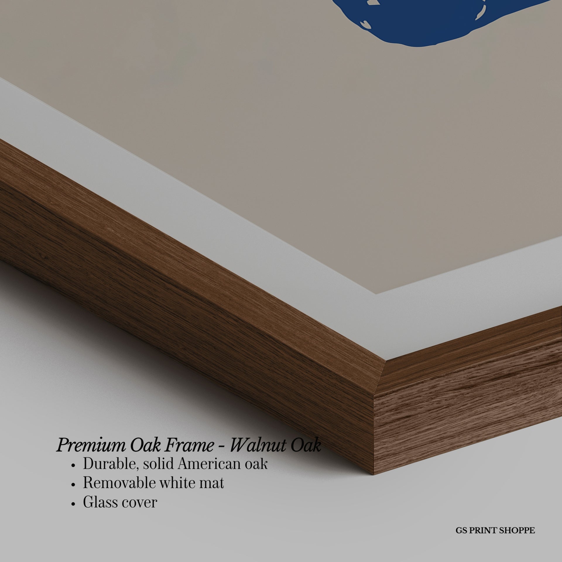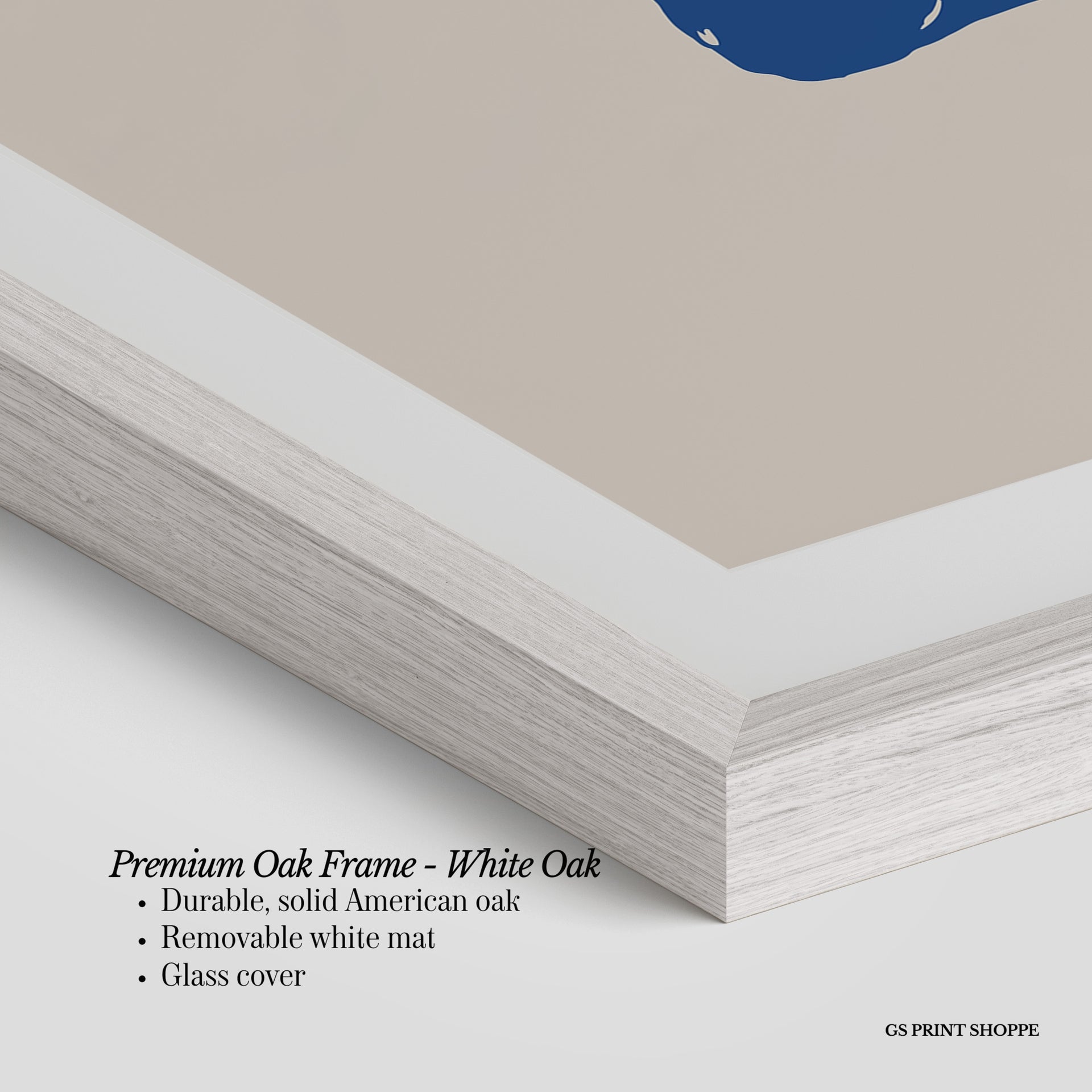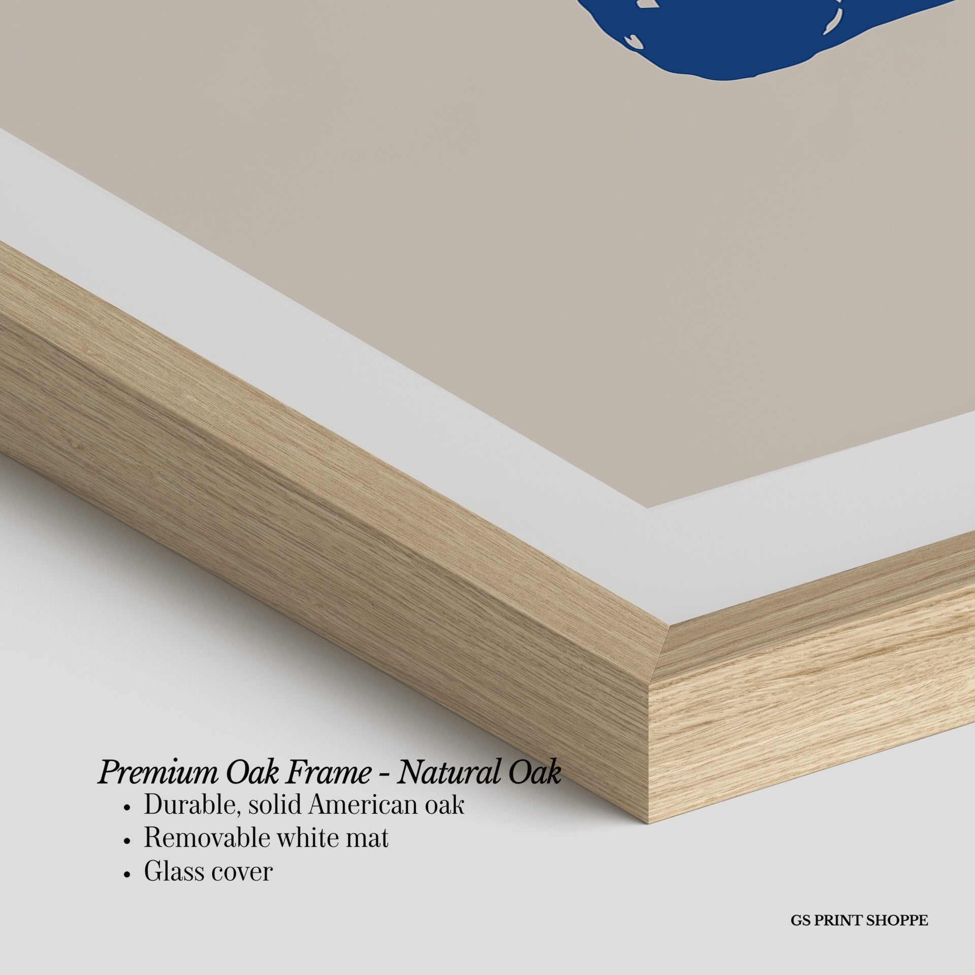 Premium Oak Frame: Our premium oak frame is crafted from solid American oak, offering a warm, natural feel with a high-end finish. We complete this elevated offering with a bright white removable mat and real glass for a versatile and polished look.