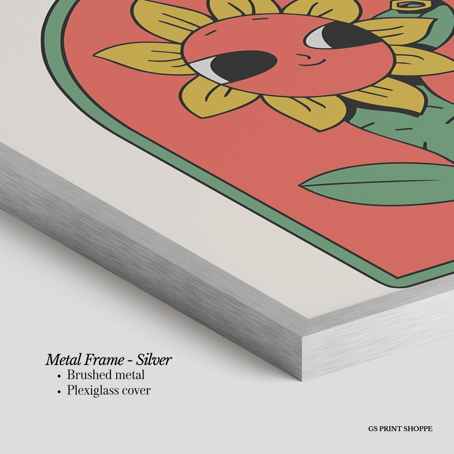 Metal Frame: Sleek and modern, our metal frame is crafted with brushed metal for a polished finish. It comes with durable plexiglass and sturdy metal hangers for horizontal or vertical display.
