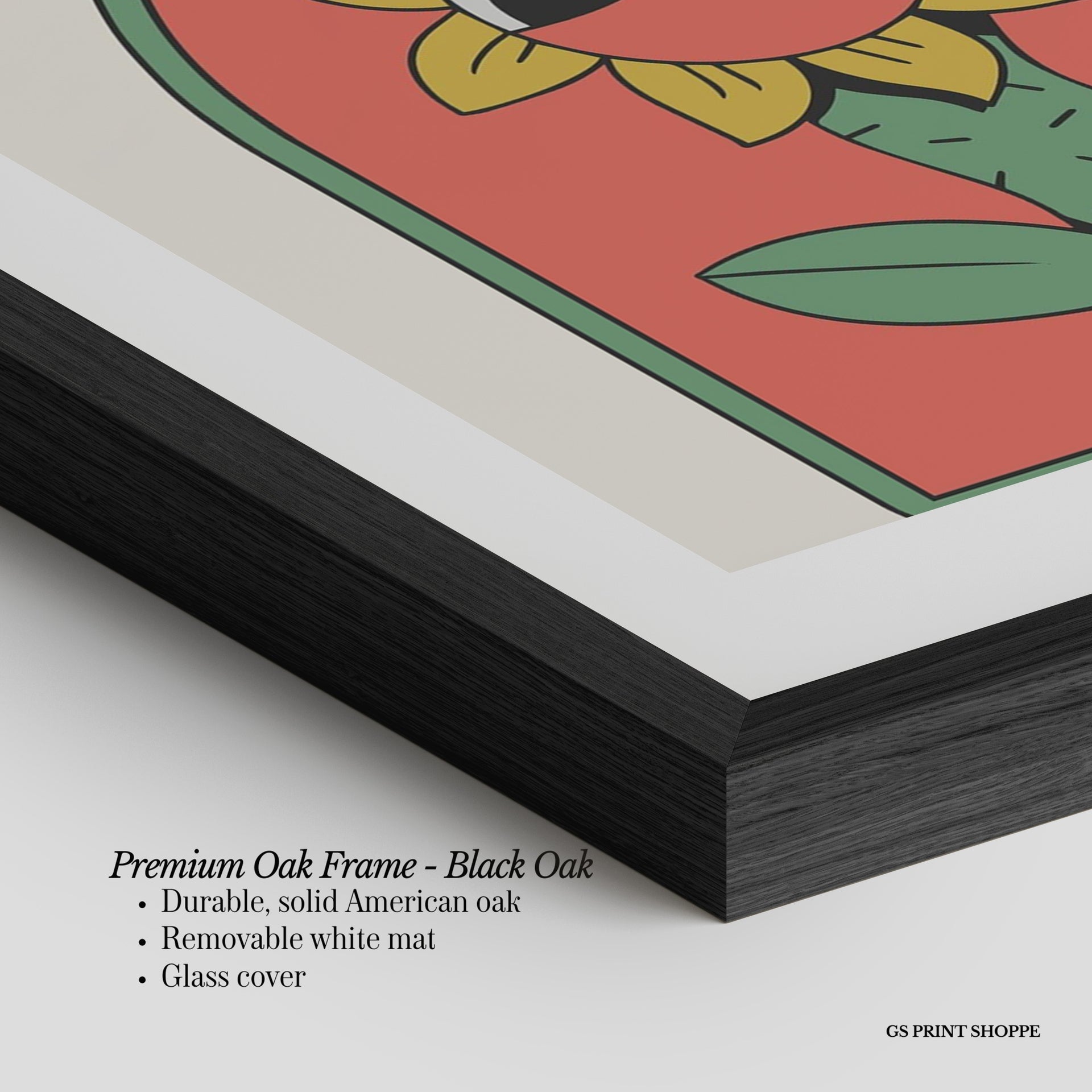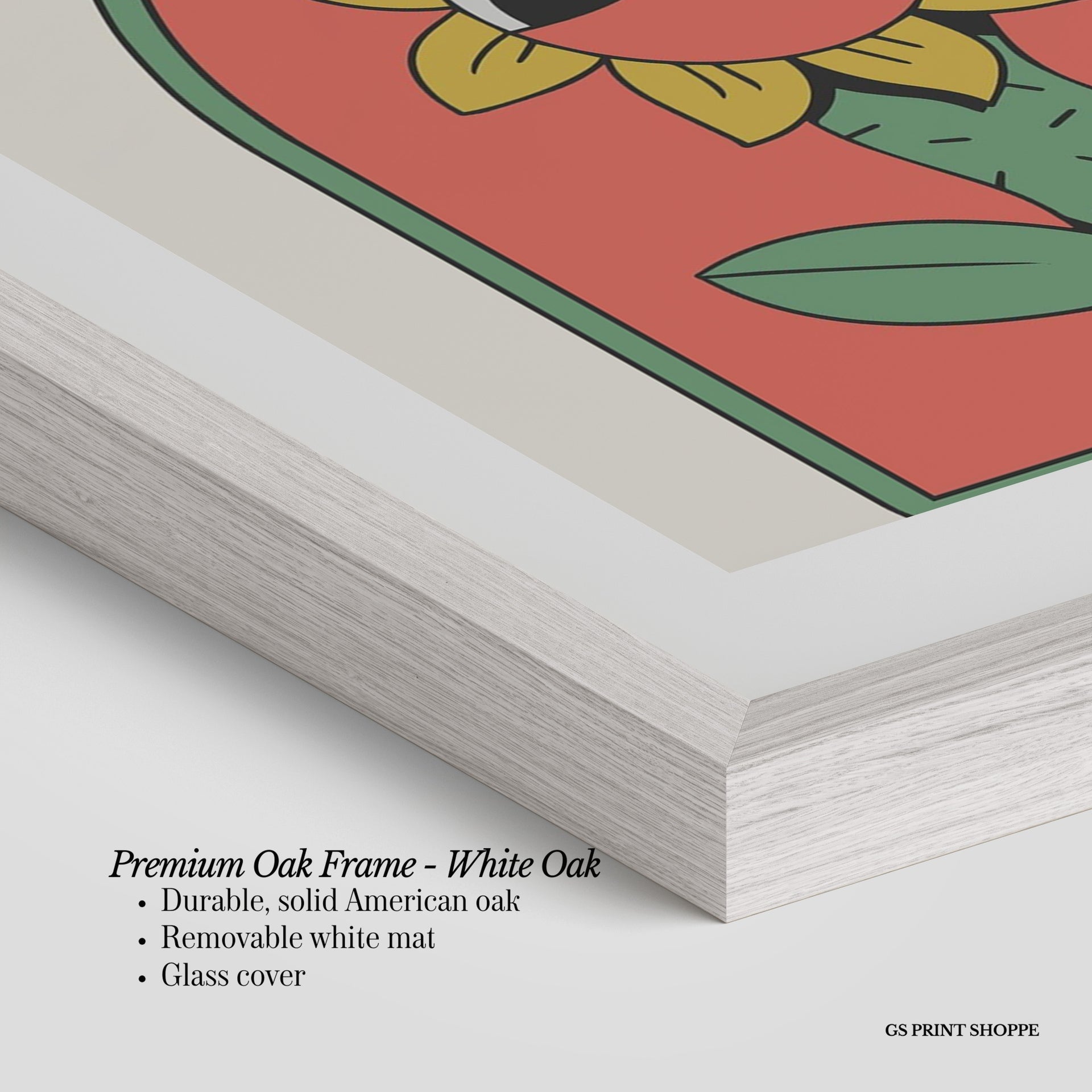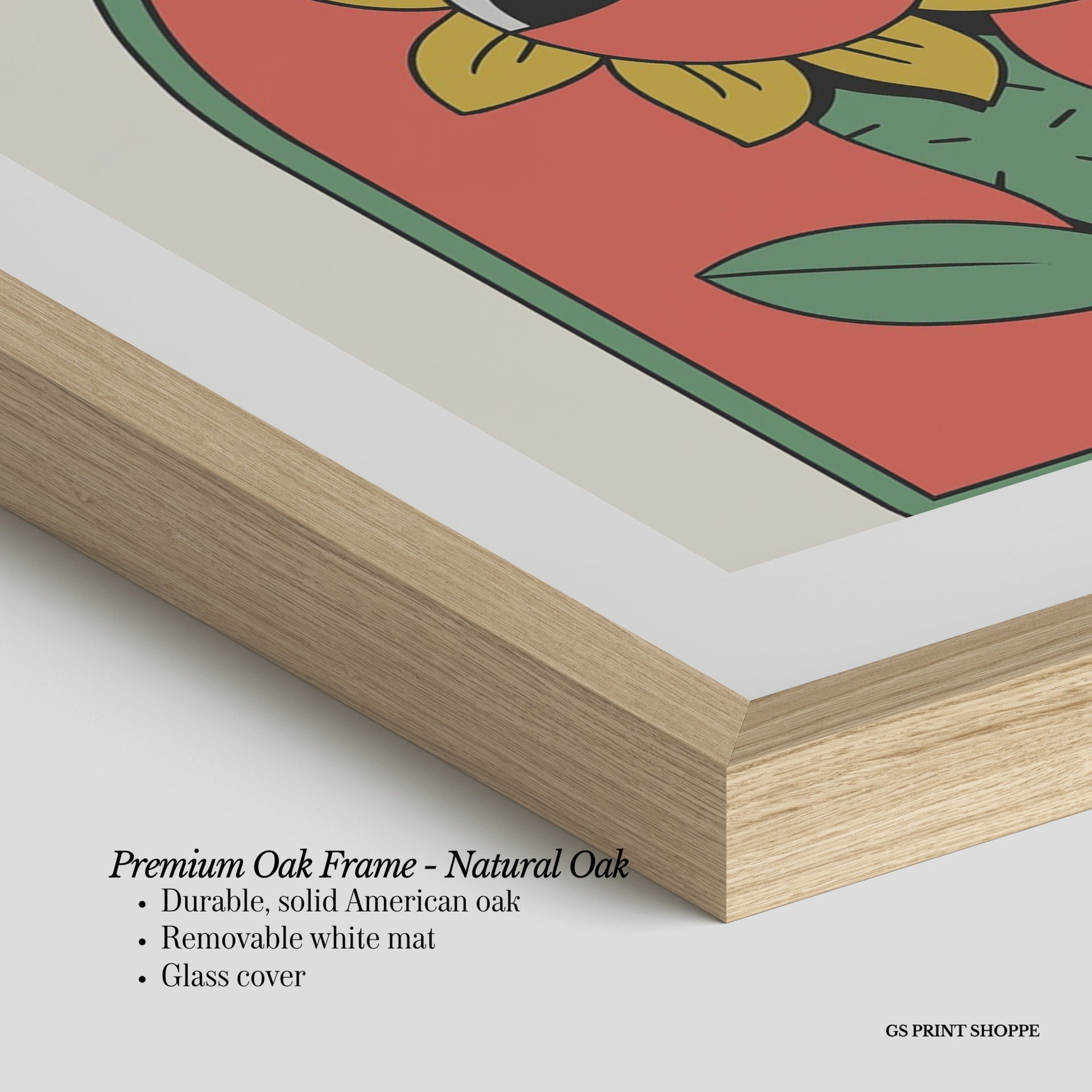 Premium Oak Frame: Our premium oak frame is crafted from solid American oak, offering a warm, natural feel with a high-end finish. We complete this elevated offering with a bright white removable mat and real glass for a versatile and polished look.