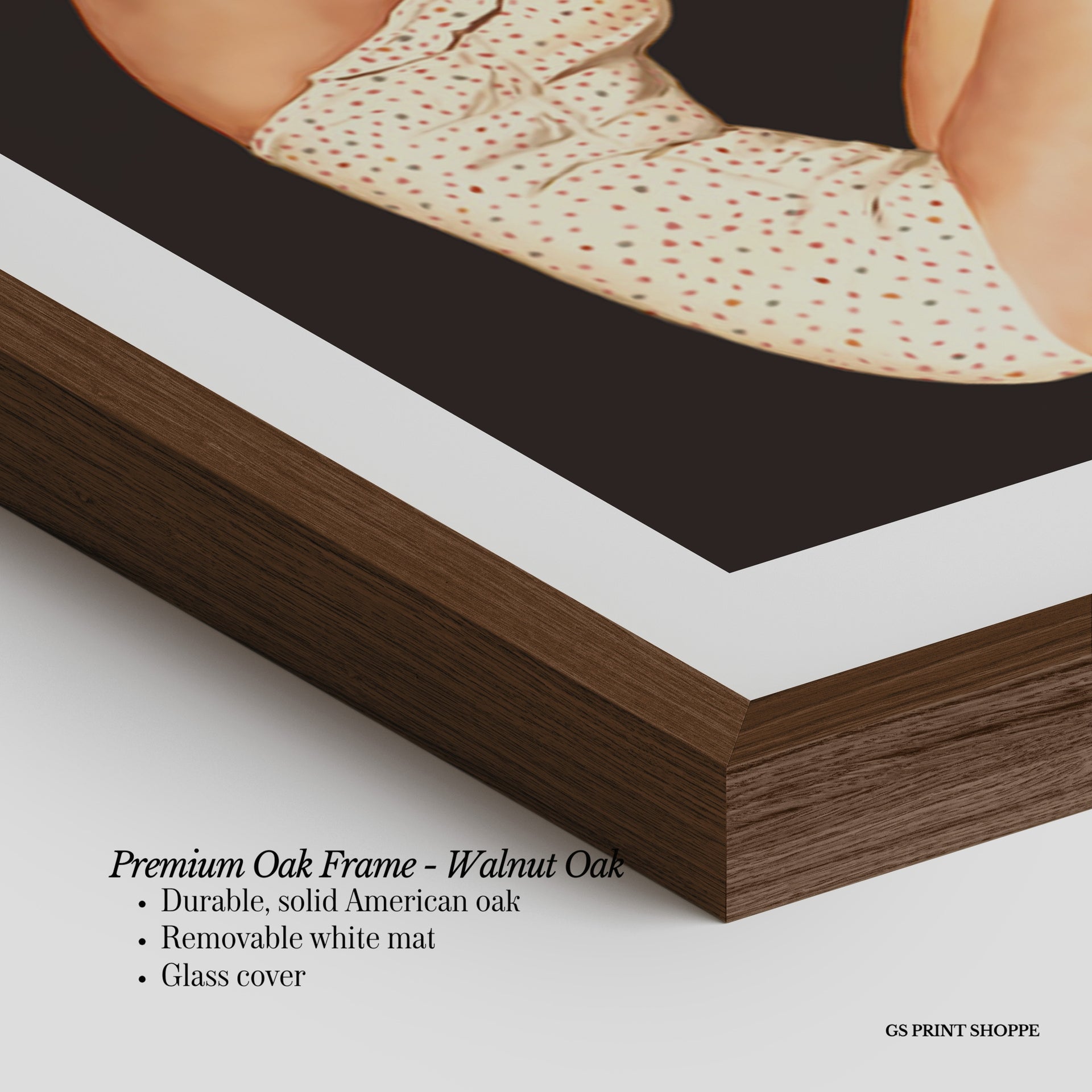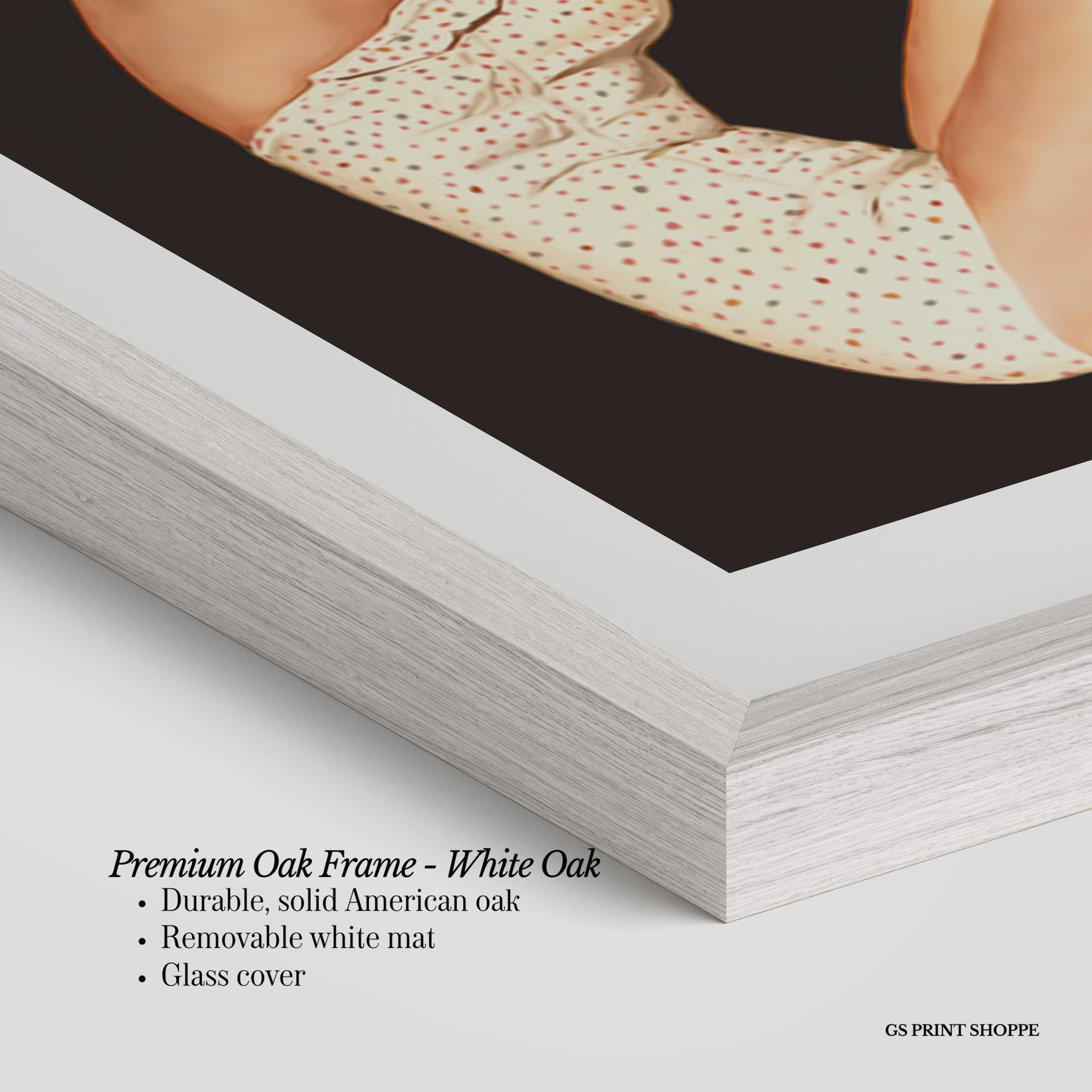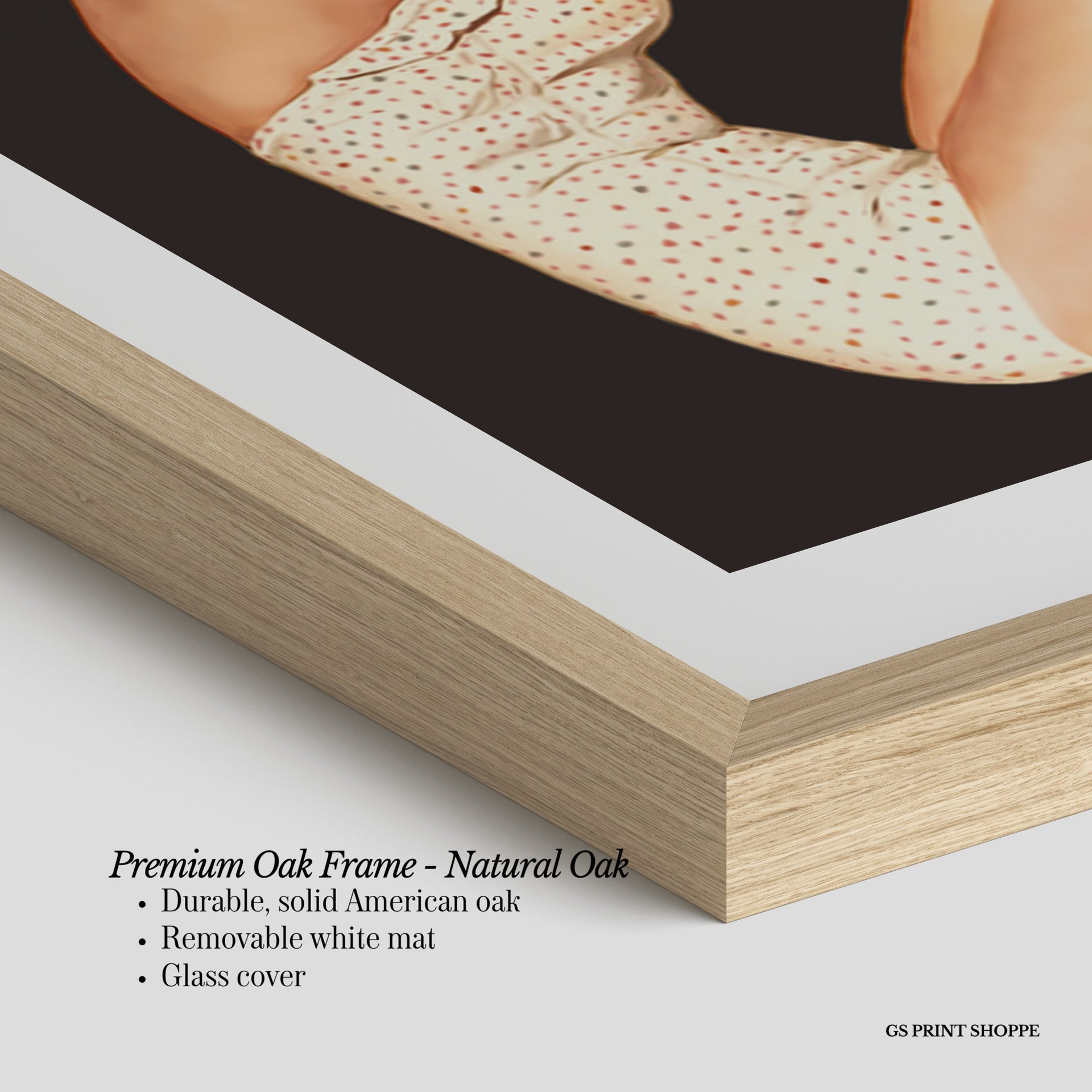 Premium Oak Frame: Our premium oak frame is crafted from solid American oak, offering a warm, natural feel with a high-end finish. We complete this elevated offering with a bright white removable mat and real glass for a versatile and polished look.