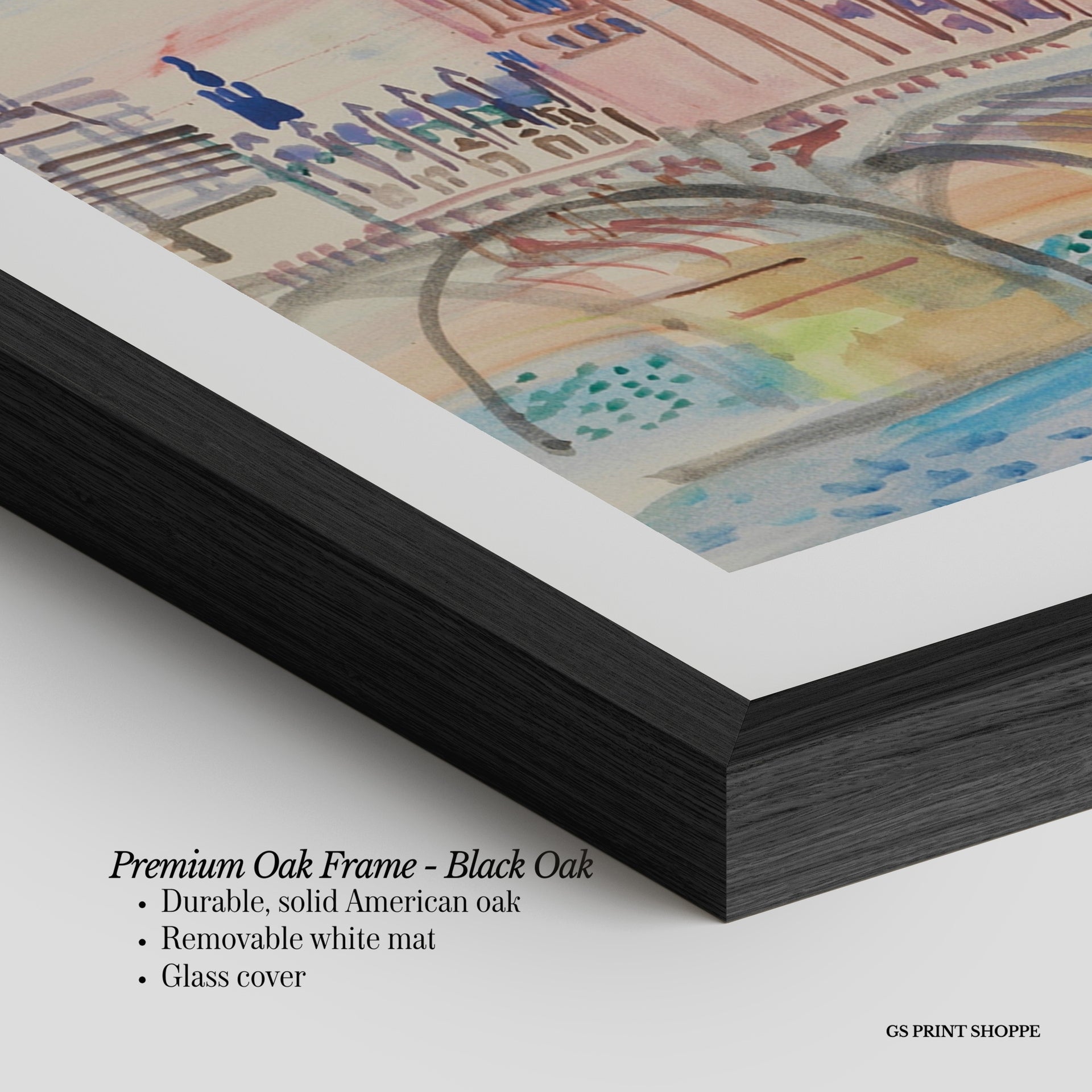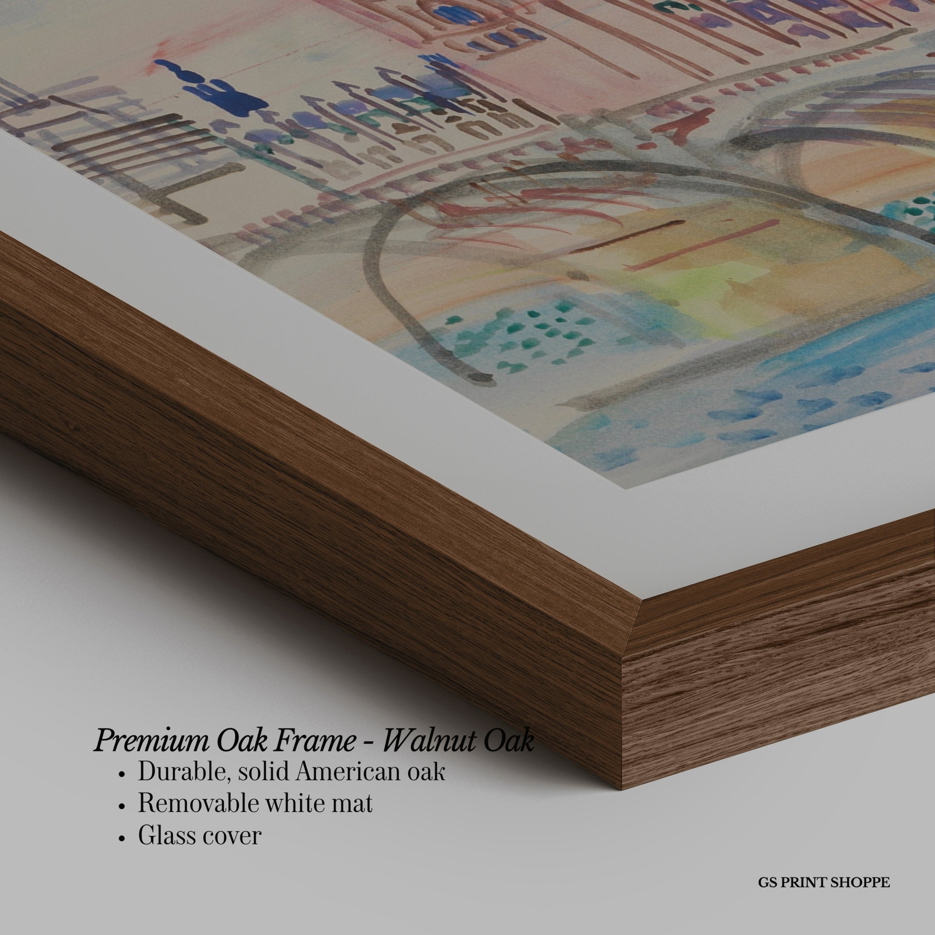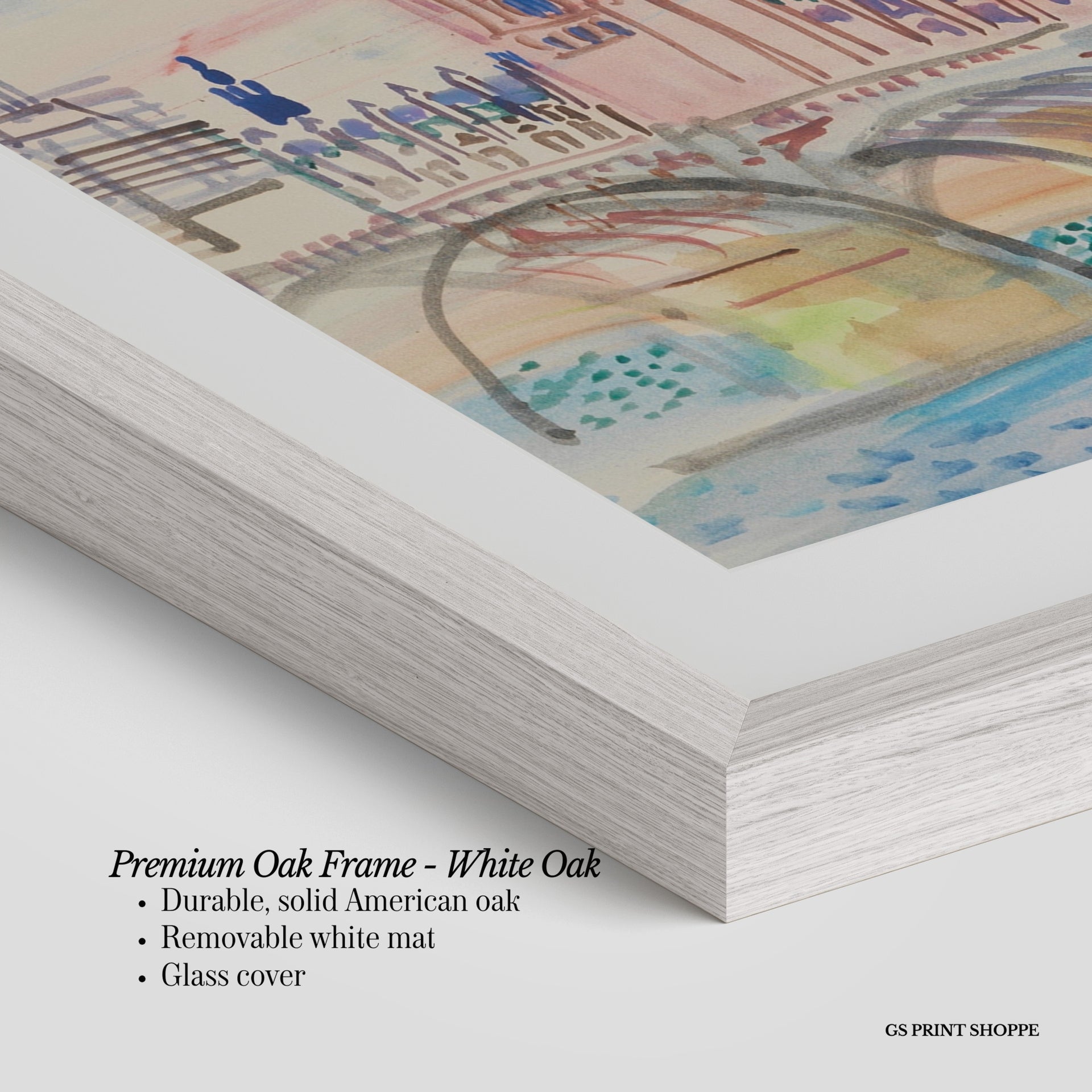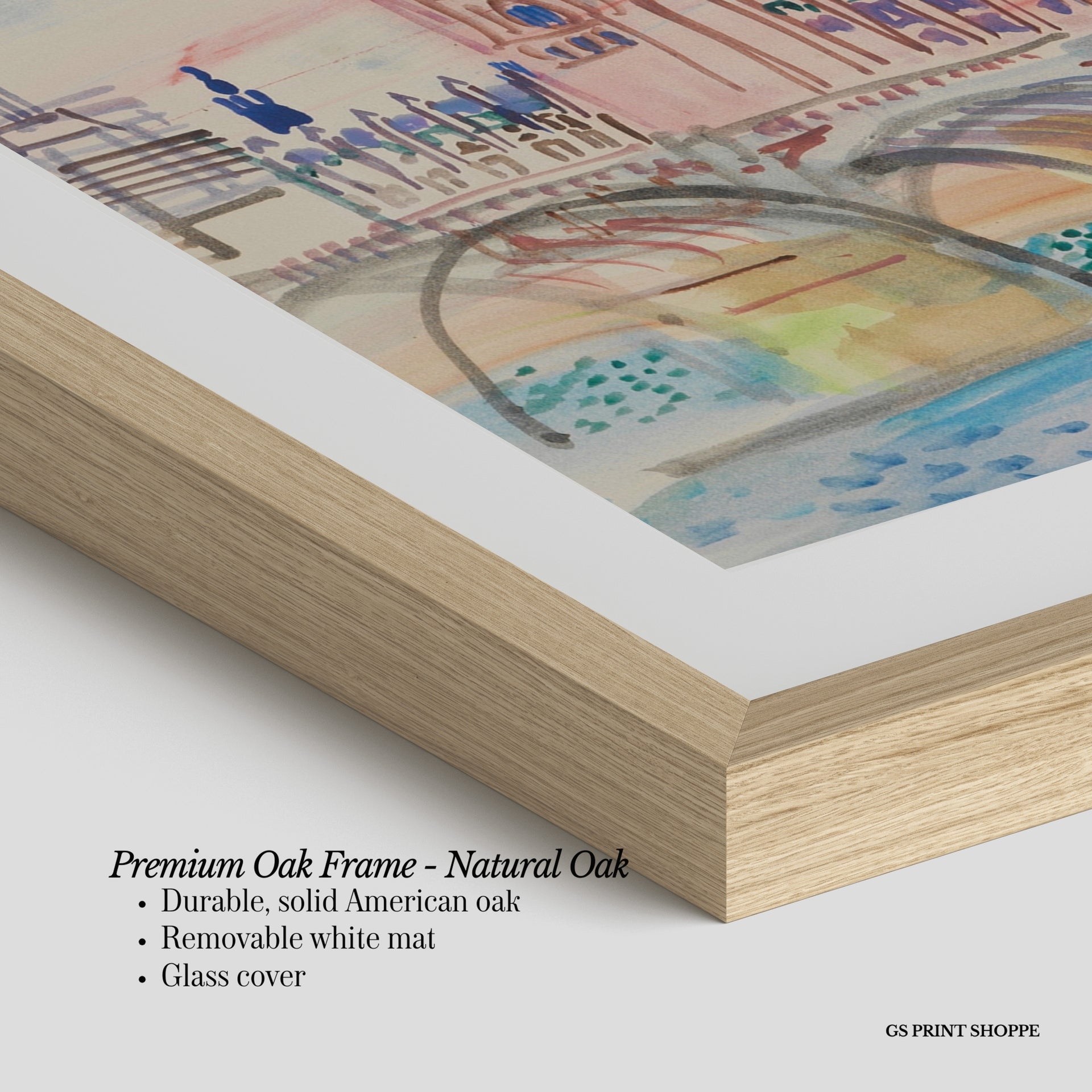 Premium Oak Frame: Our premium oak frame is crafted from solid American oak, offering a warm, natural feel with a high-end finish. We complete this elevated offering with a bright white removable mat and real glass for a versatile and polished look.