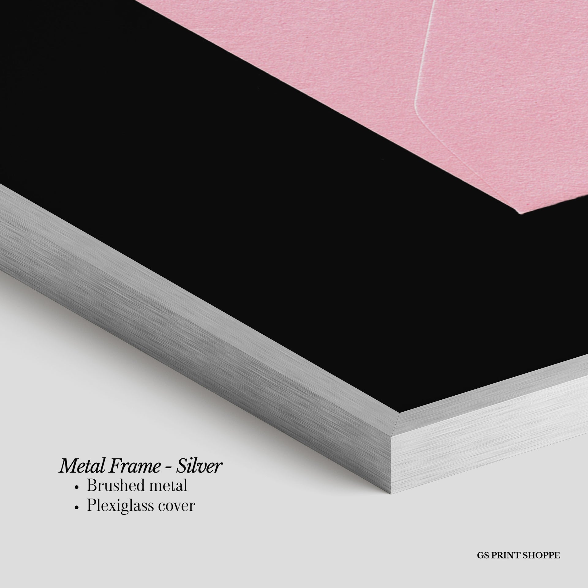 Metal Frame: Sleek and modern, our metal frame is crafted with brushed metal for a polished finish. It comes with durable plexiglass and sturdy metal hangers for horizontal or vertical display.