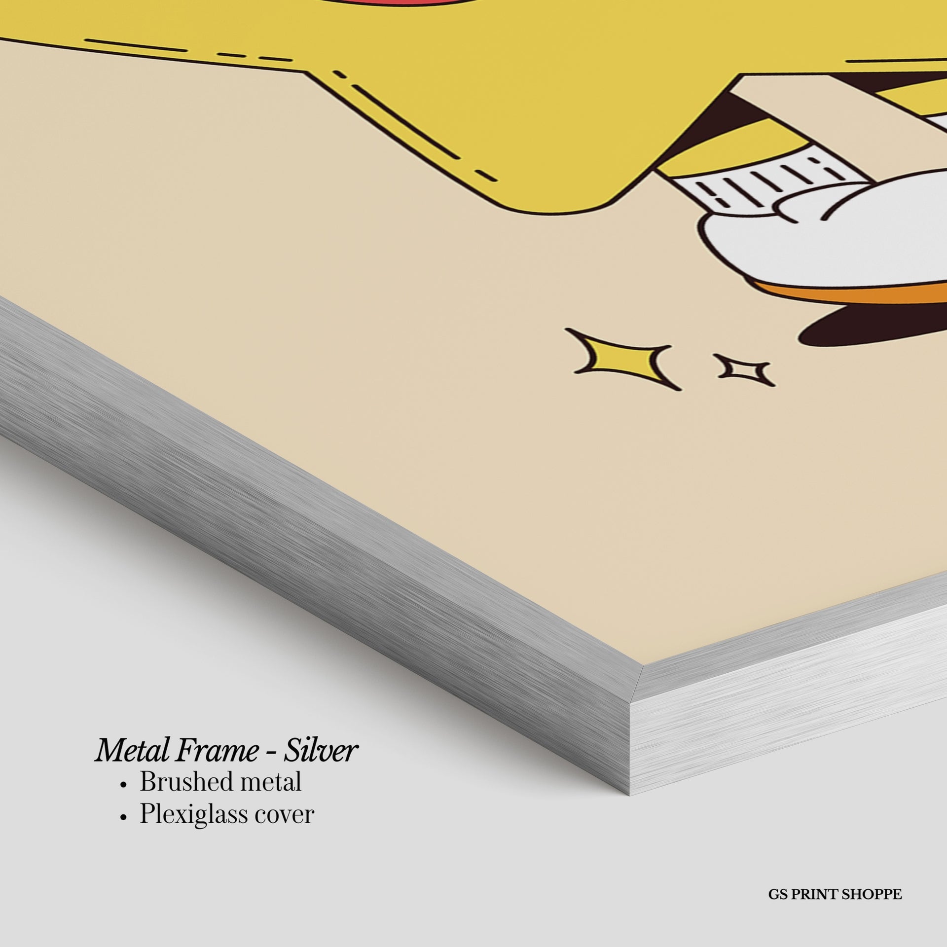 Metal Frame: Sleek and modern, our metal frame is crafted with brushed metal for a polished finish. It comes with durable plexiglass and sturdy metal hangers for horizontal or vertical display.