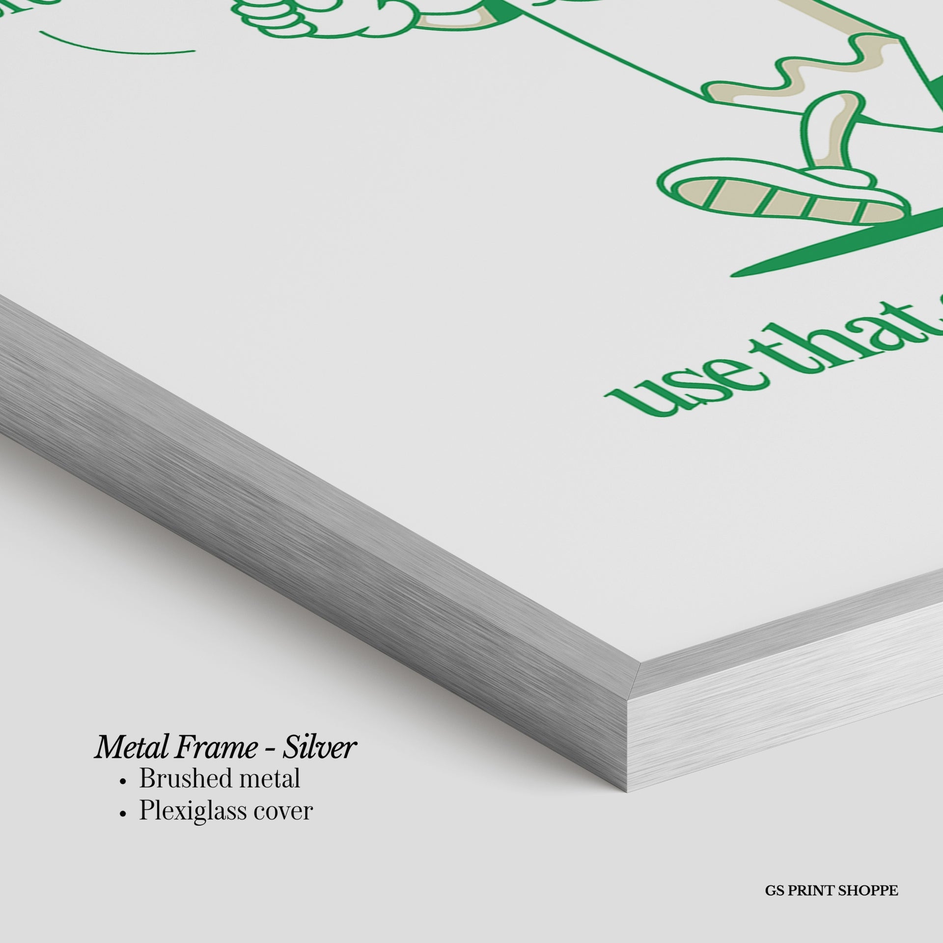 Metal Frame: Sleek and modern, our metal frame is crafted with brushed metal for a polished finish. It comes with durable plexiglass and sturdy metal hangers for horizontal or vertical display.