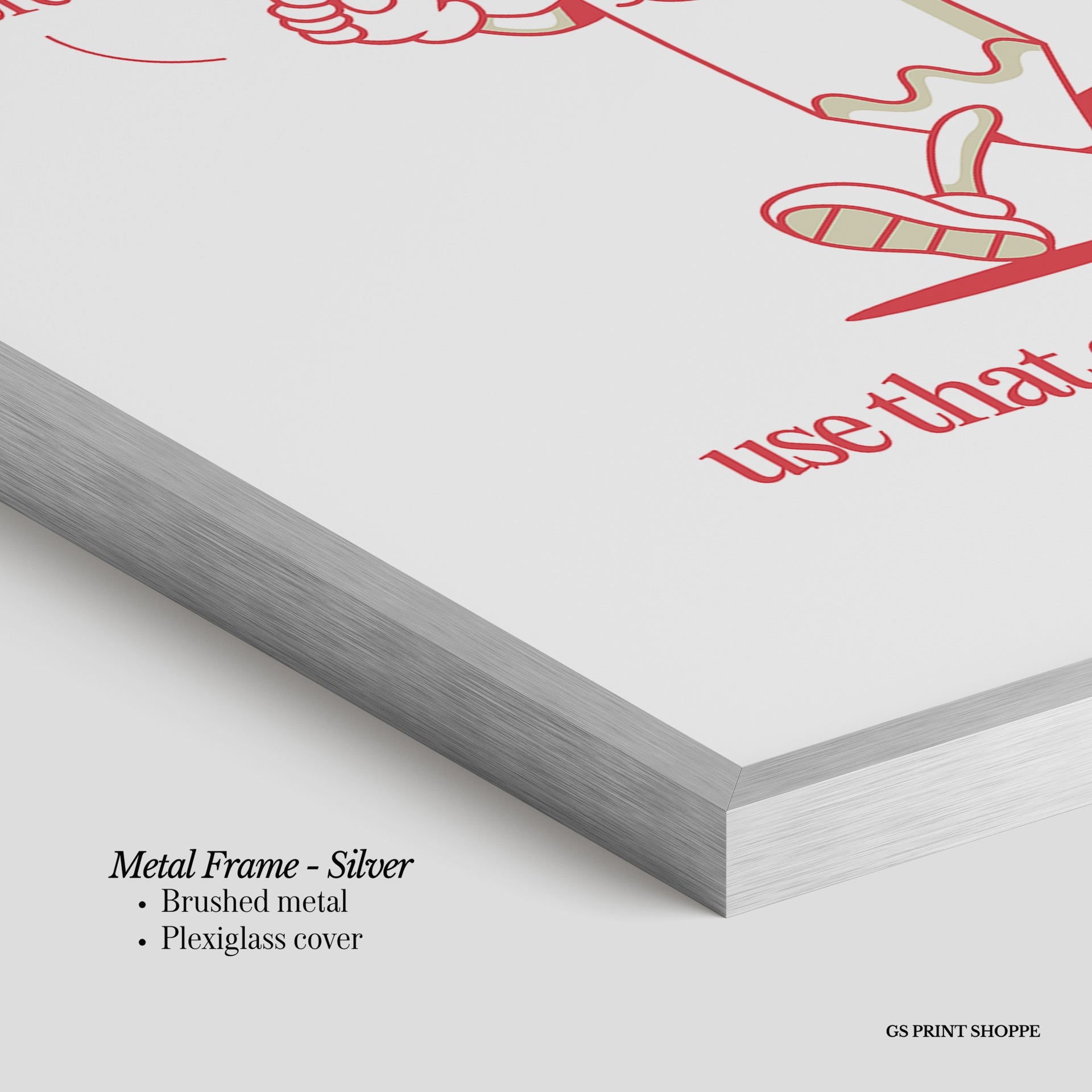 Metal Frame: Sleek and modern, our metal frame is crafted with brushed metal for a polished finish. It comes with durable plexiglass and sturdy metal hangers for horizontal or vertical display.