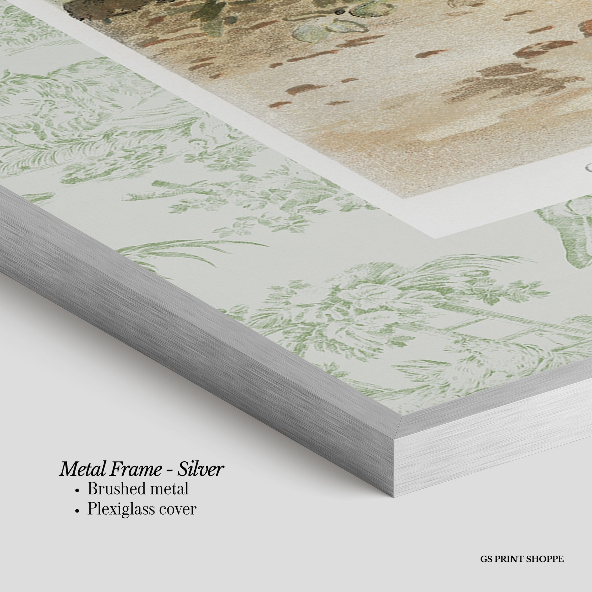 Metal Frame: Sleek and modern, our metal frame is crafted with brushed metal for a polished finish. It comes with durable plexiglass and sturdy metal hangers for horizontal or vertical display.
