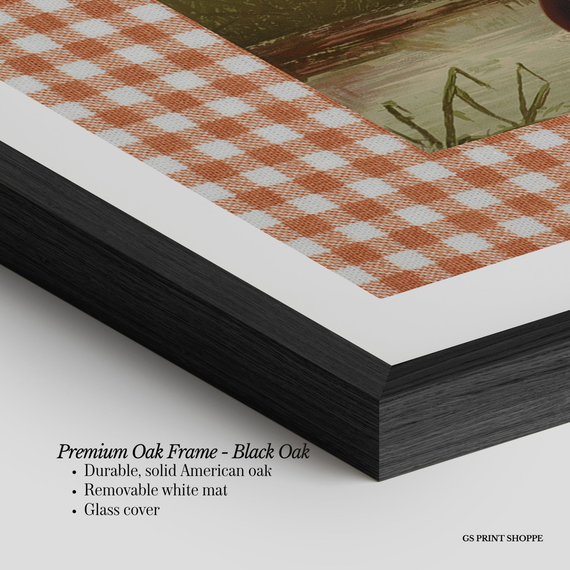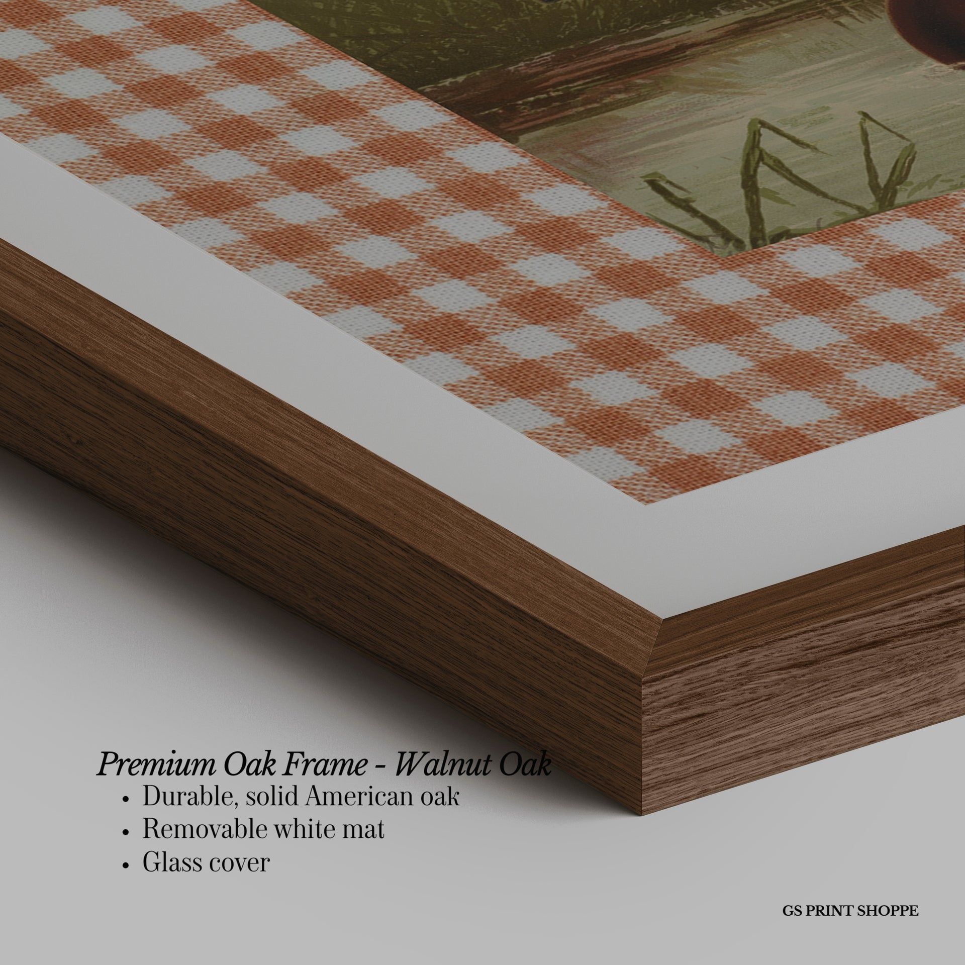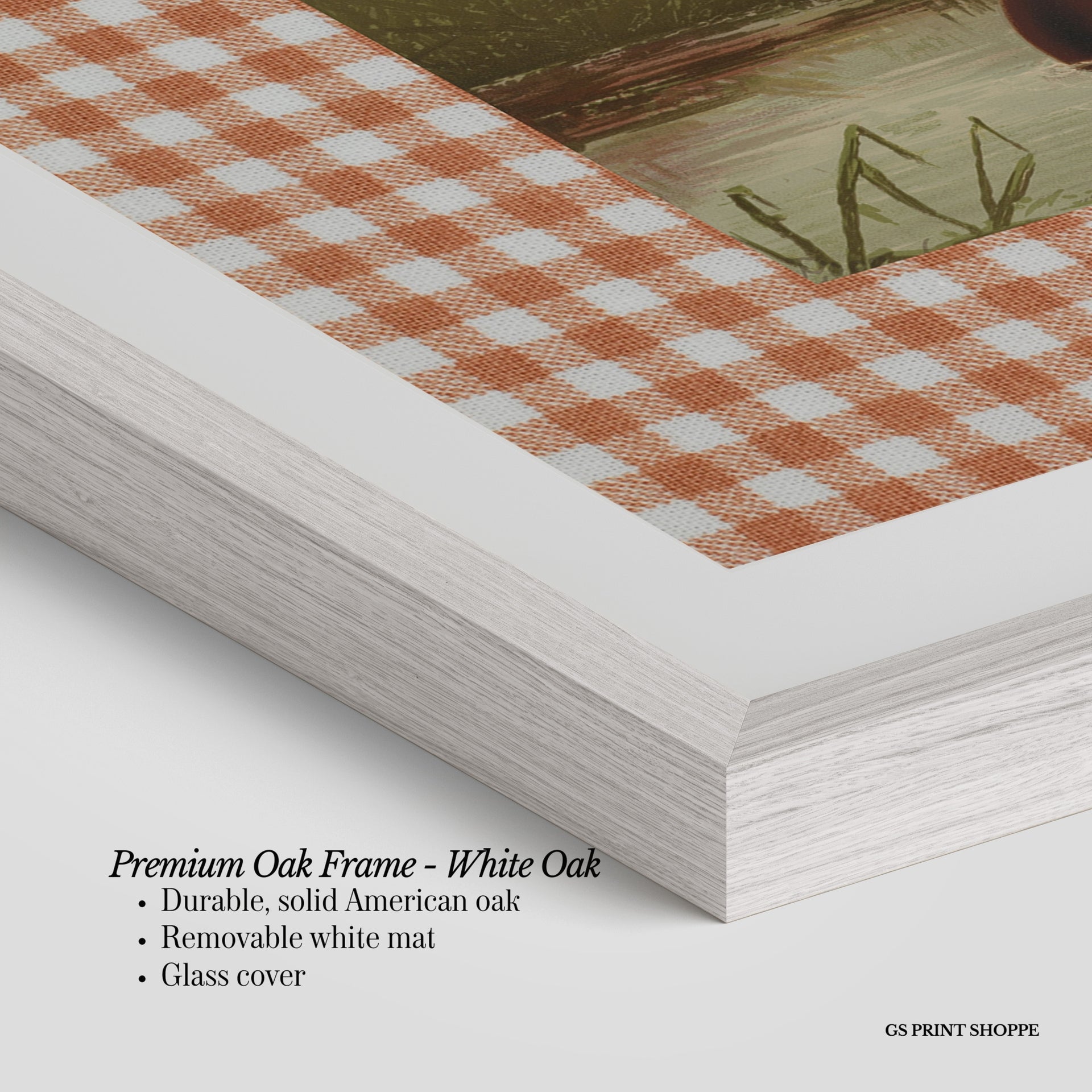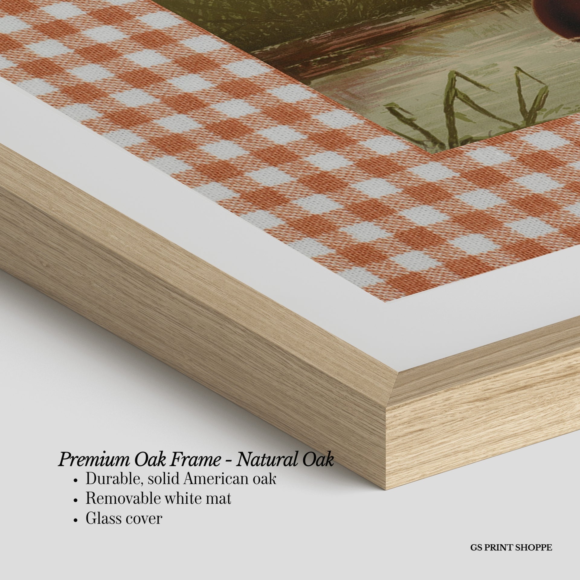 Premium Oak Frame: Our premium oak frame is crafted from solid American oak, offering a warm, natural feel with a high-end finish. We complete this elevated offering with a bright white removable mat and real glass for a versatile and polished look.