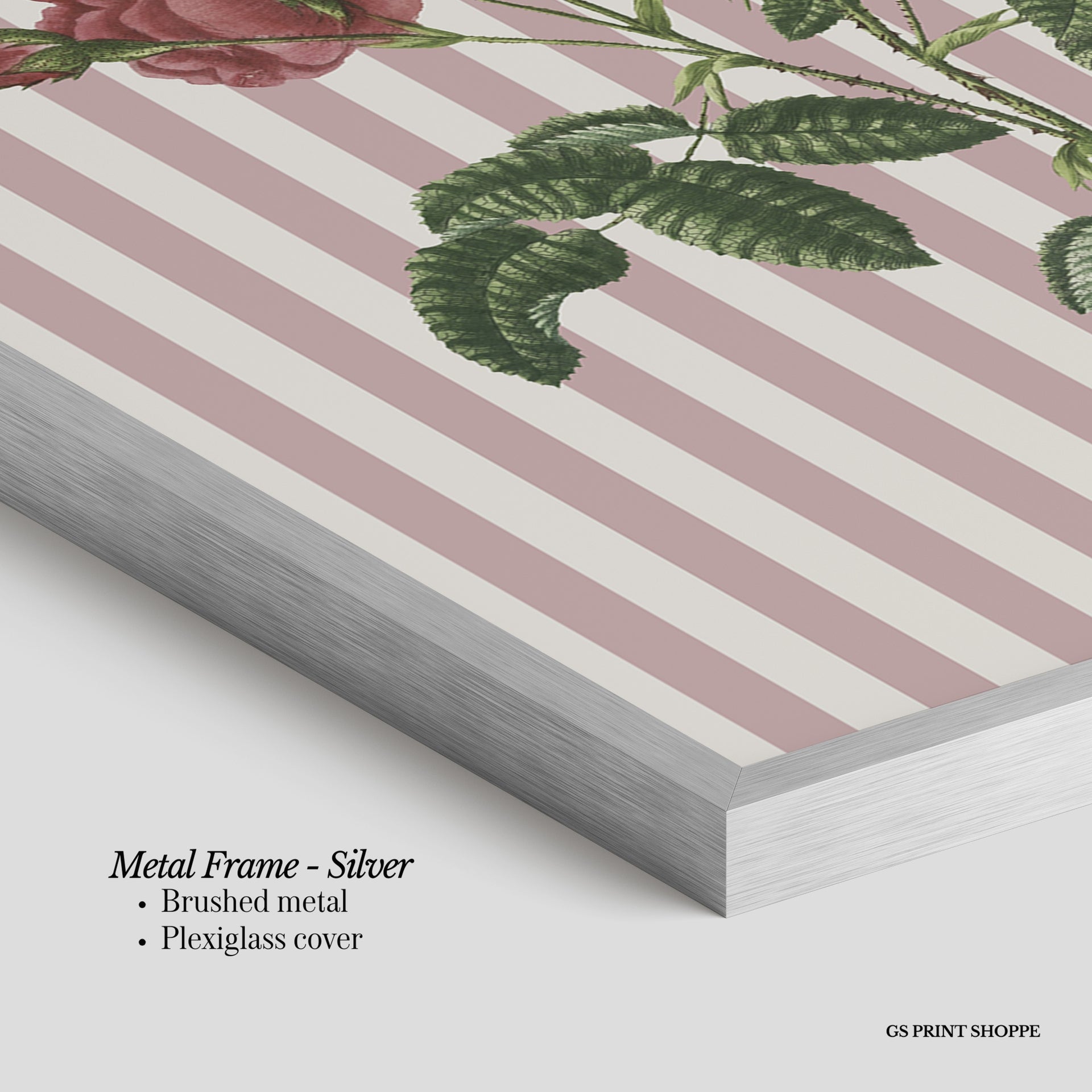 Metal Frame: Sleek and modern, our metal frame is crafted with brushed metal for a polished finish. It comes with durable plexiglass and sturdy metal hangers for horizontal or vertical display.