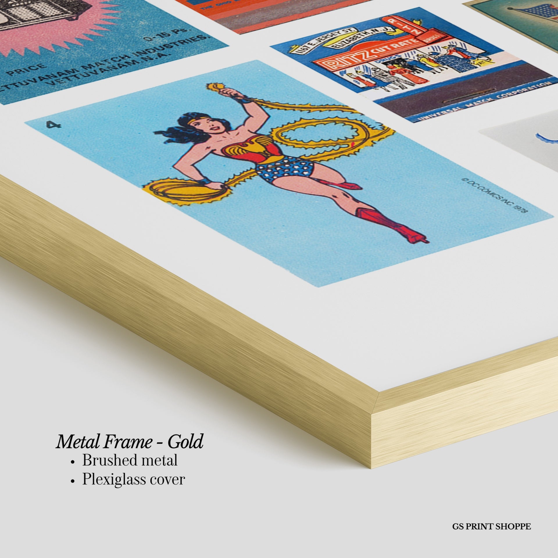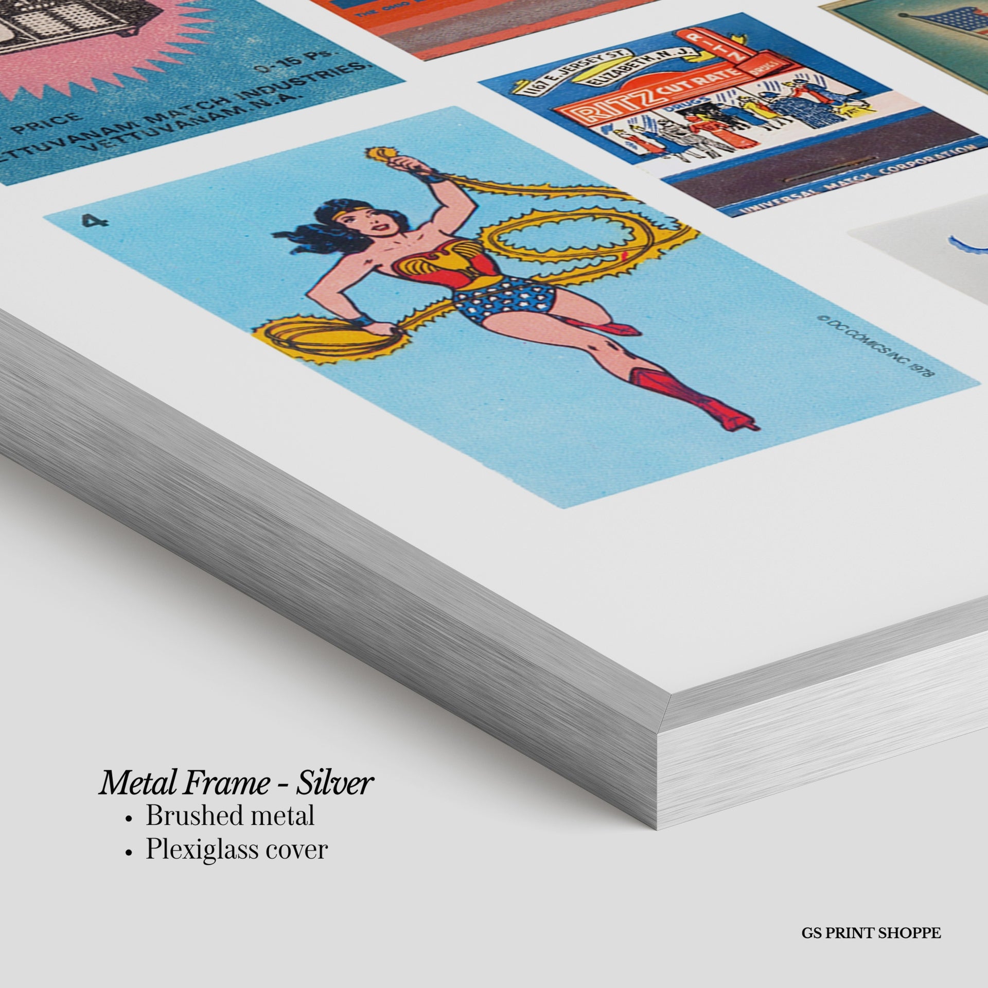 Metal Frame: Sleek and modern, our metal frame is crafted with brushed metal for a polished finish. It comes with durable plexiglass and sturdy metal hangers for horizontal or vertical display.