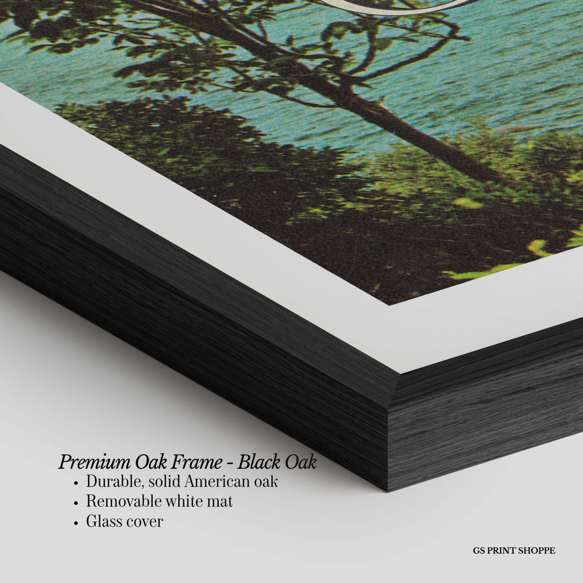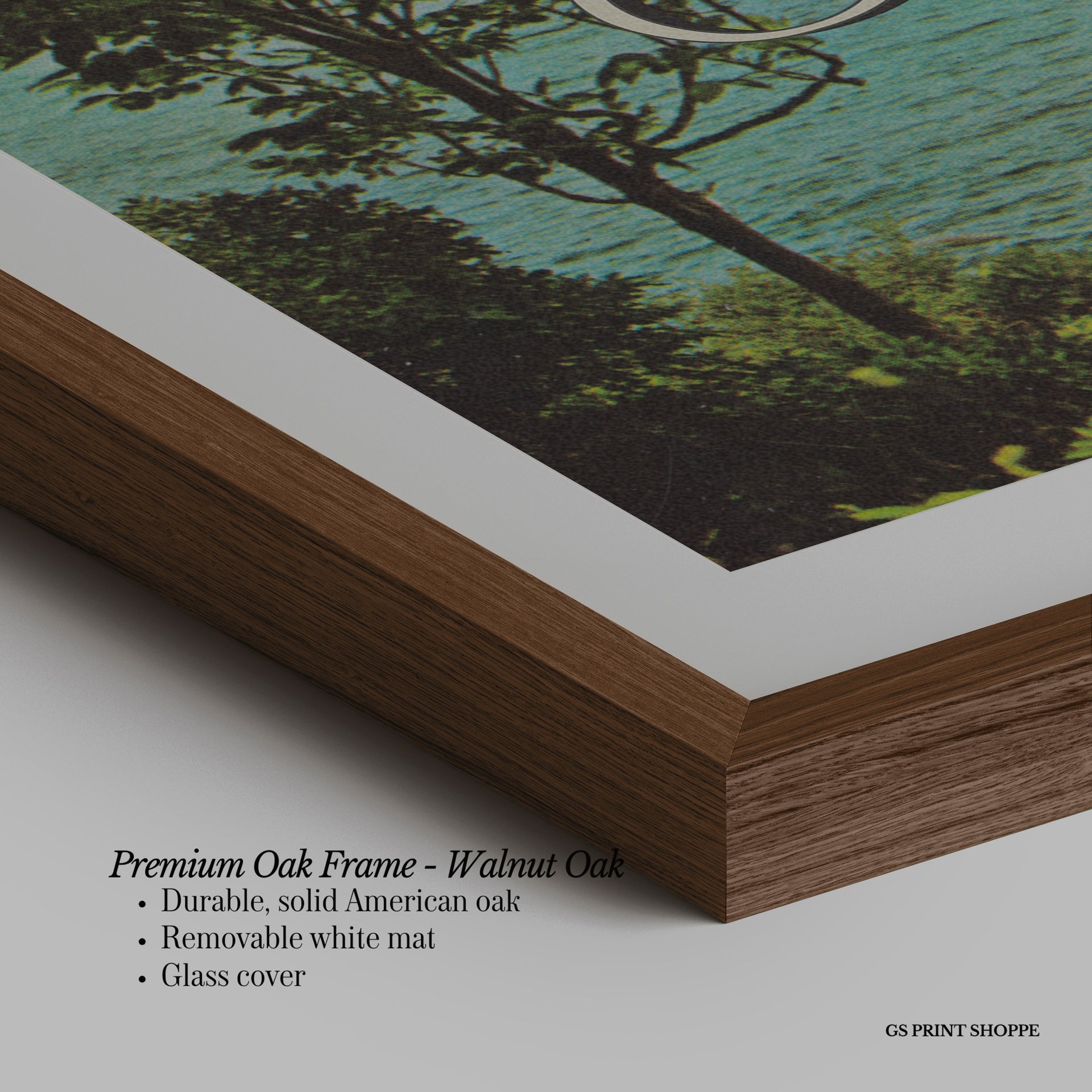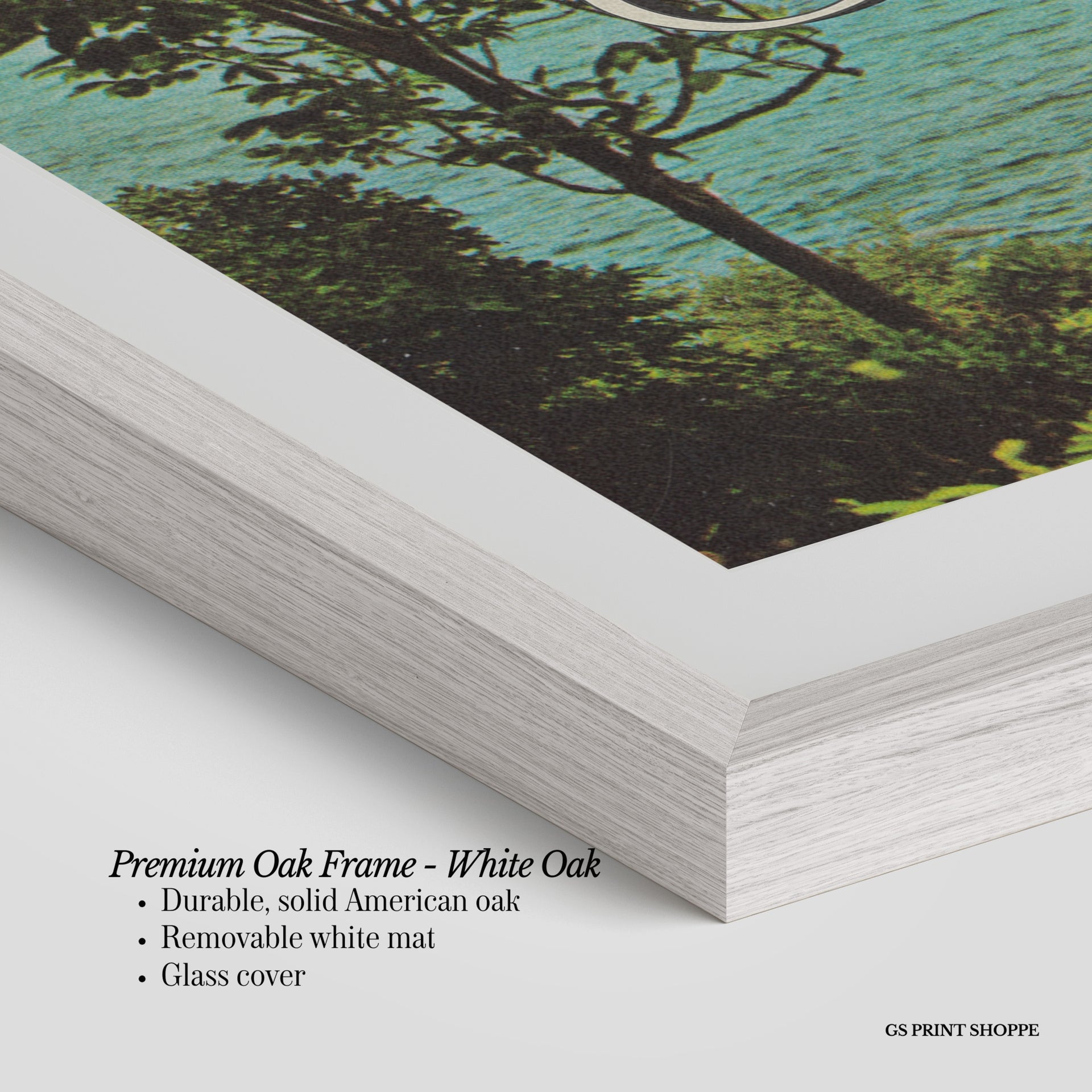 Premium Oak Frame: Our premium oak frame is crafted from solid American oak, offering a warm, natural feel with a high-end finish. We complete this elevated offering with a bright white removable mat and real glass for a versatile and polished look.
