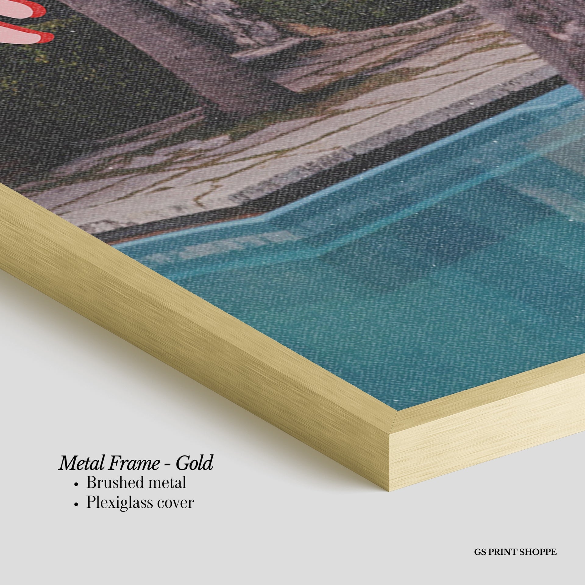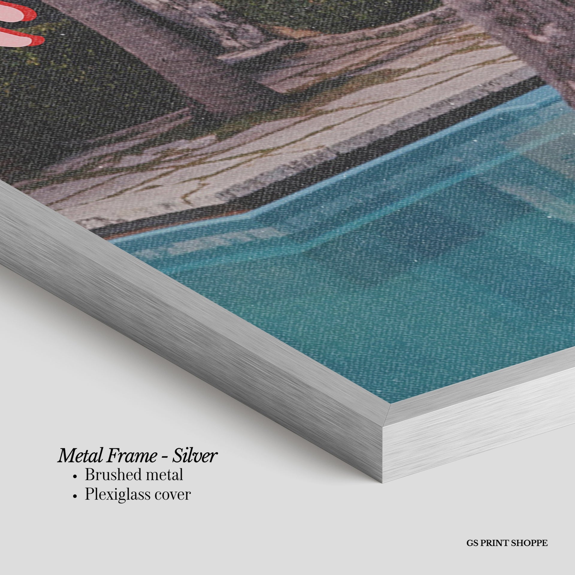 Metal Frame: Sleek and modern, our metal frame is crafted with brushed metal for a polished finish. It comes with durable plexiglass and sturdy metal hangers for horizontal or vertical display.